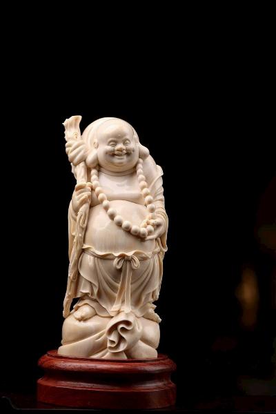 Nguyên khối liền tạc, chất ngà bóng nhuận. Di Lặc nụ cười hoan hỷ, hình thần đầy đủ, bụng lớn dung chứa, dáng vẻ tự tại khoáng đạt. Một tay cầm gậy gánh túi vải, một tay nâng chuỗi Phật châu, phúc ý tròn đầy. Bày trên án kỷ, mang ý nghĩa cát tường, hoan hỷ, viên mãn.