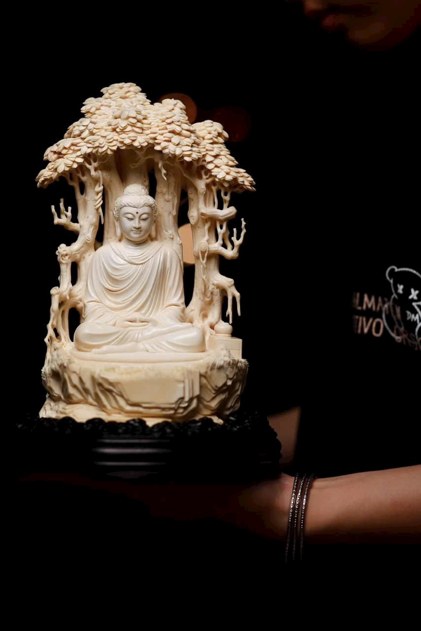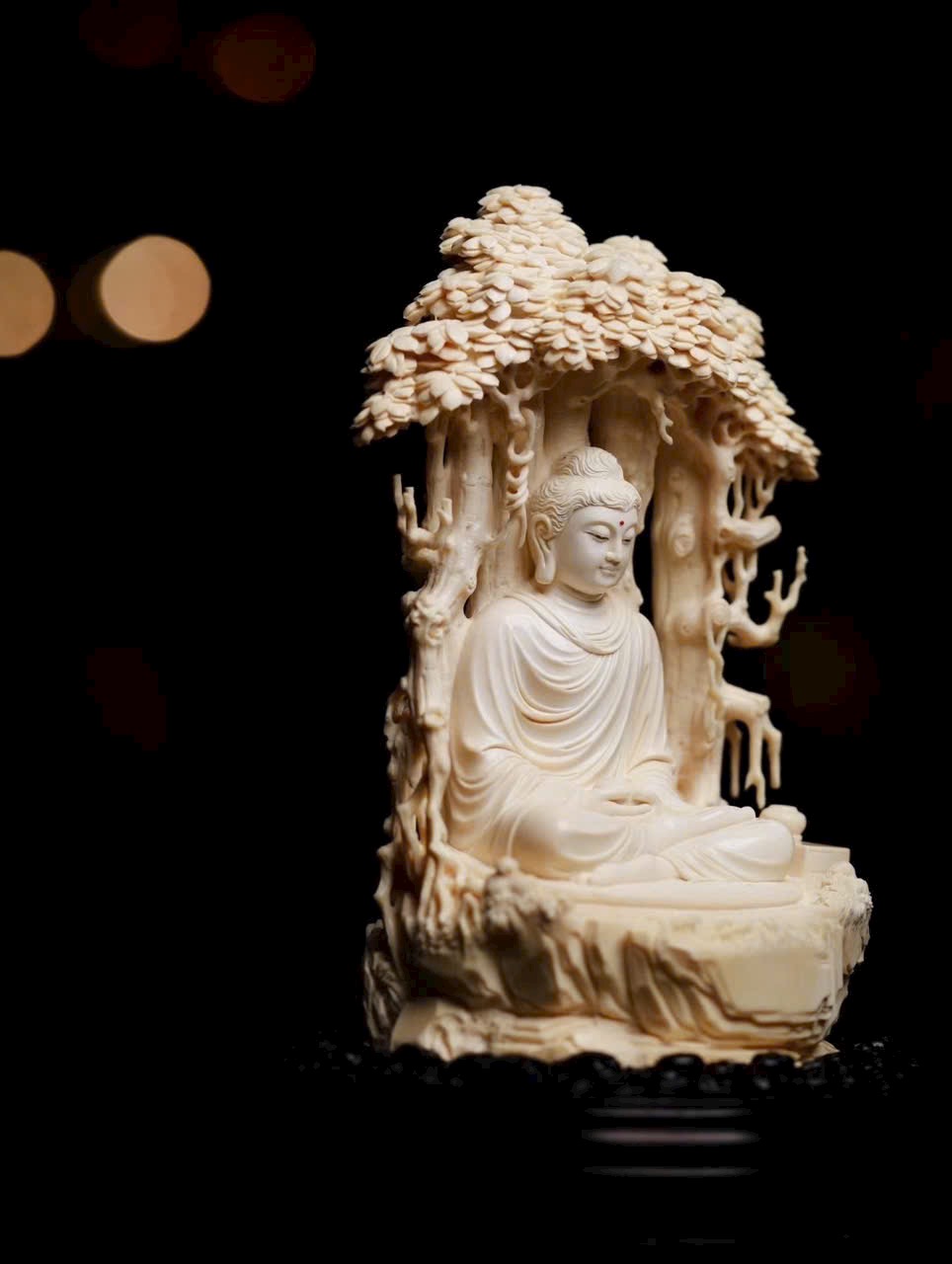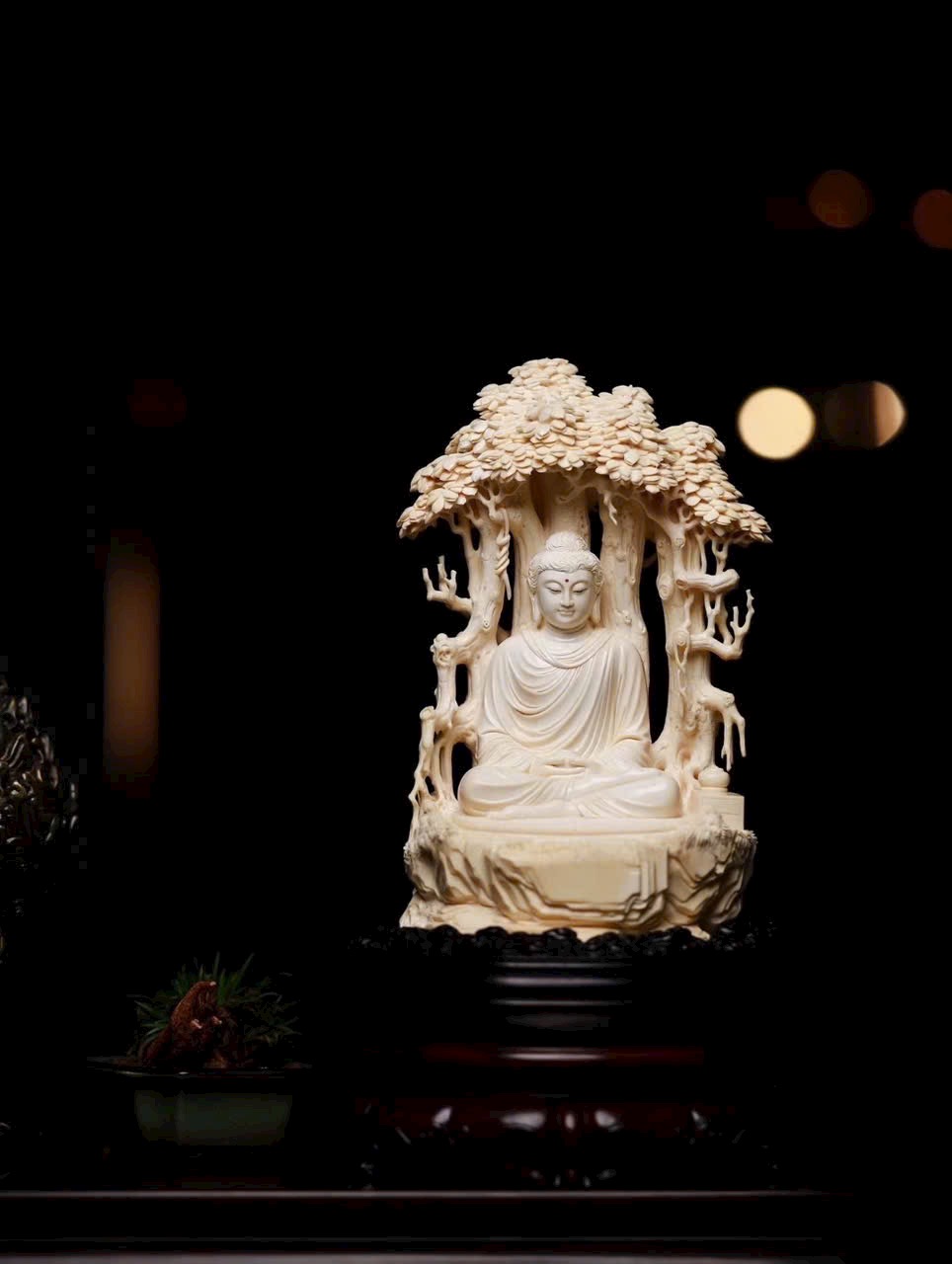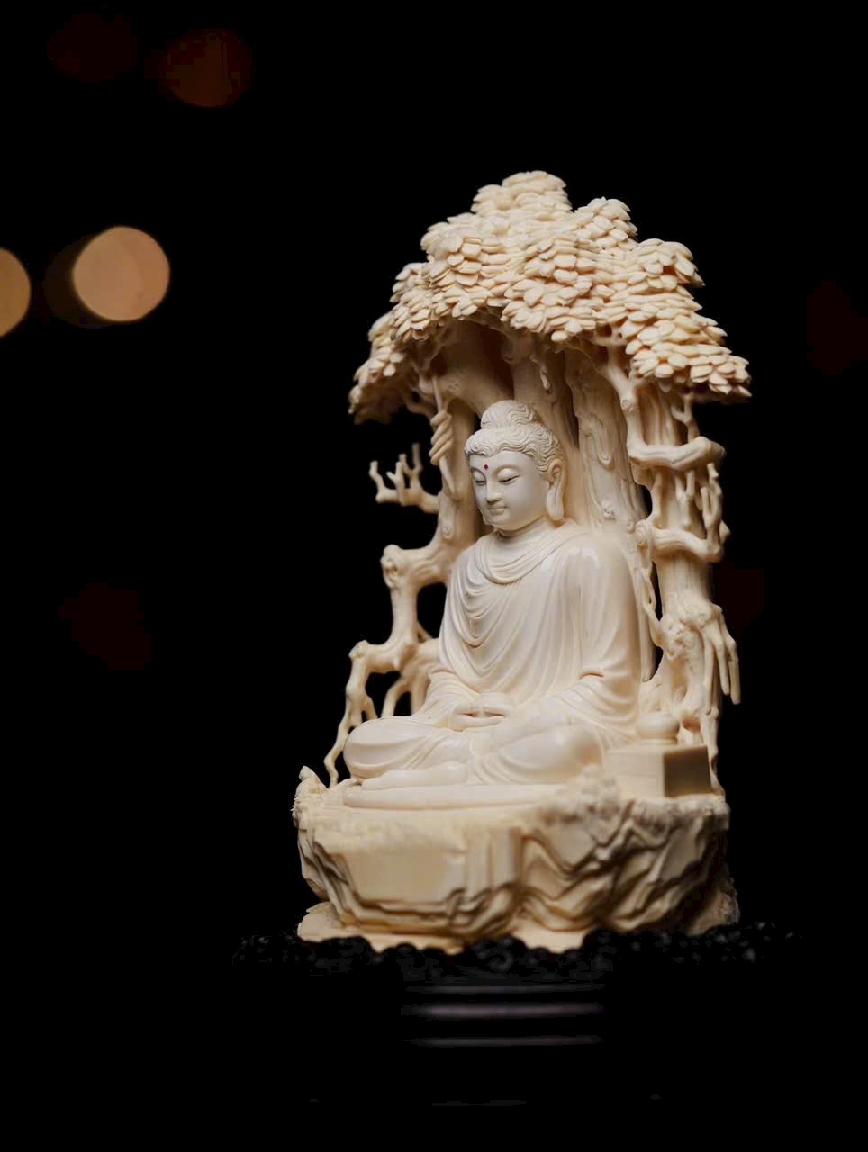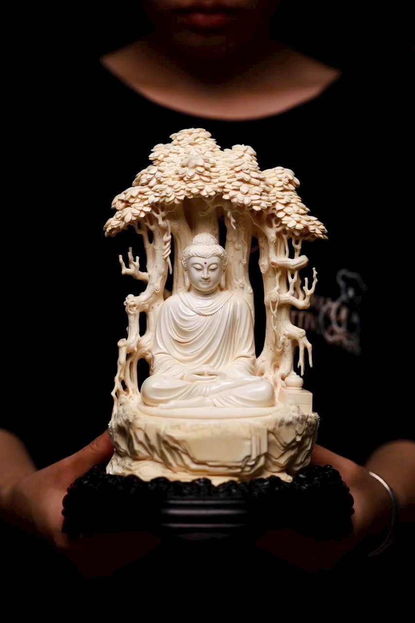 Dựa theo thủ bản cổ pháp, tạc Như Lai tọa thiền dưới Bồ Đề linh thụ, búi tóc xoắn ốc, khoác áo phúc điền, hai tay nâng bát cam lộ, y phục uyển chuyển như mạch pháp. Danh gia tinh tạc, tôn hiện vẻ từ hòa và uy nghi của Phật. Kết tinh tinh hoa điêu khắc ngà ma mút, dung hợp vẻ trang nghiêm của Phật pháp, là pháp khí thù thắng, vừa có thể cung dưỡng vừa đáng lưu giữ.