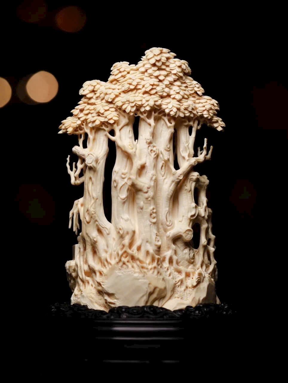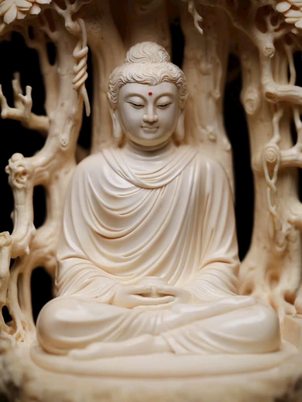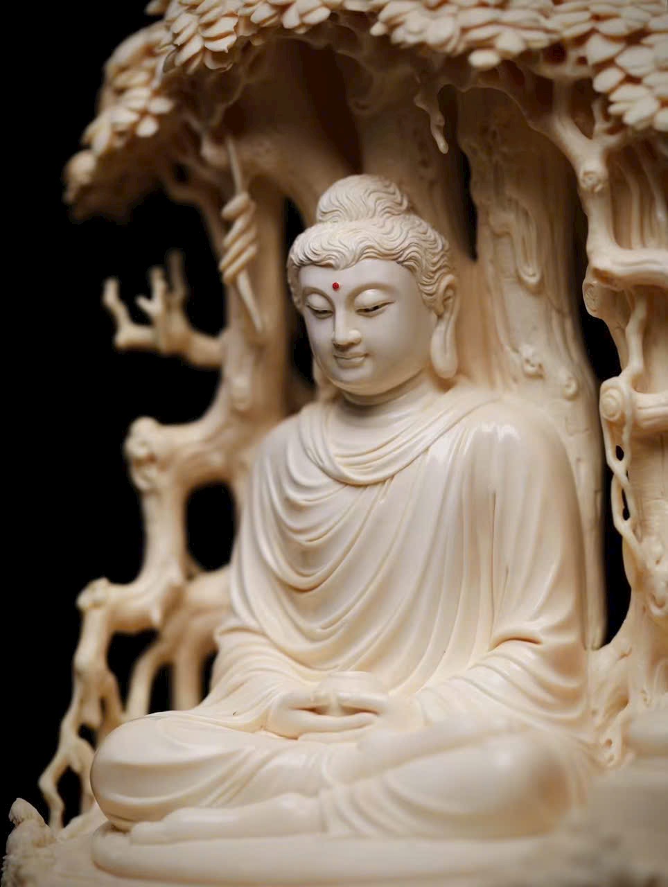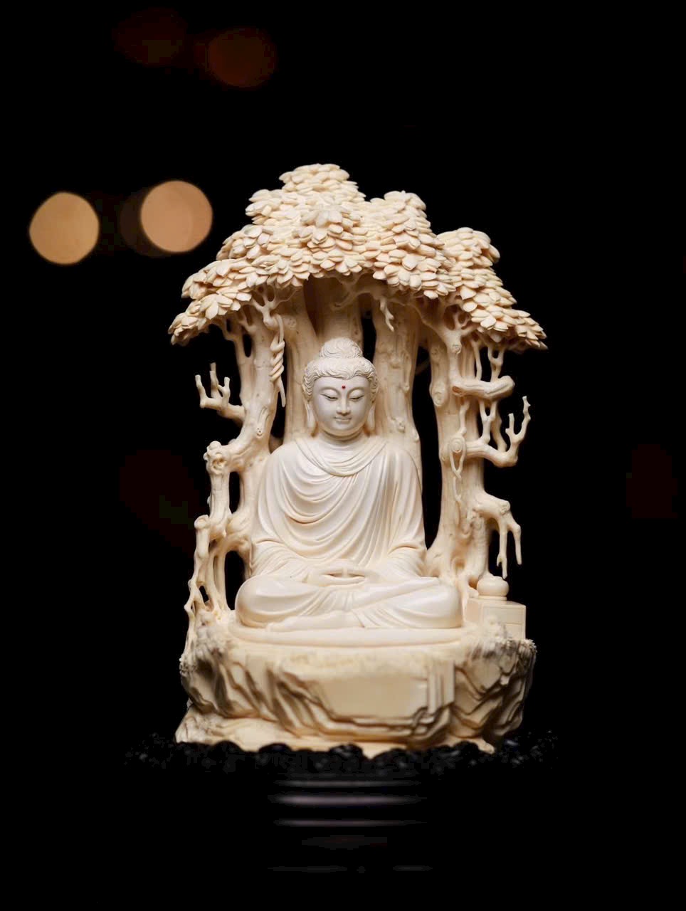 Dựa theo thủ bản cổ pháp, tạc Như Lai tọa thiền dưới Bồ Đề linh thụ, búi tóc xoắn ốc, khoác áo phúc điền, hai tay nâng bát cam lộ, y phục uyển chuyển như mạch pháp. Danh gia tinh tạc, tôn hiện vẻ từ hòa và uy nghi của Phật. Kết tinh tinh hoa điêu khắc ngà ma mút, dung hợp vẻ trang nghiêm của Phật pháp, là pháp khí thù thắng, vừa có thể cung dưỡng vừa đáng lưu giữ.