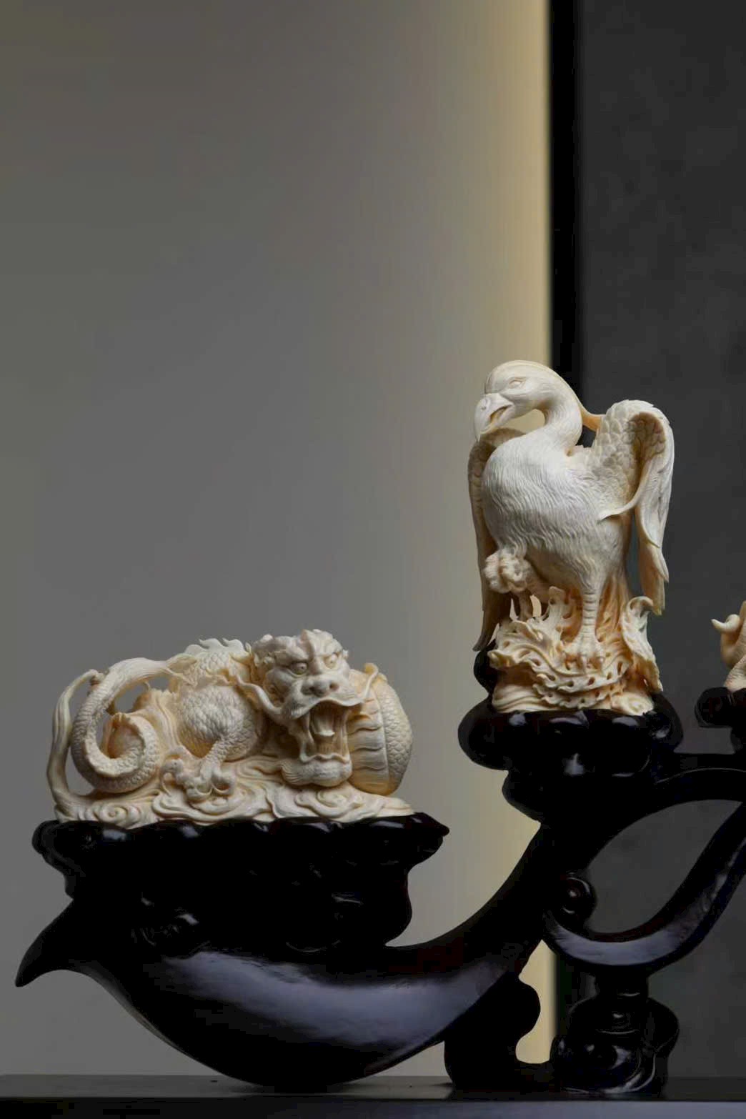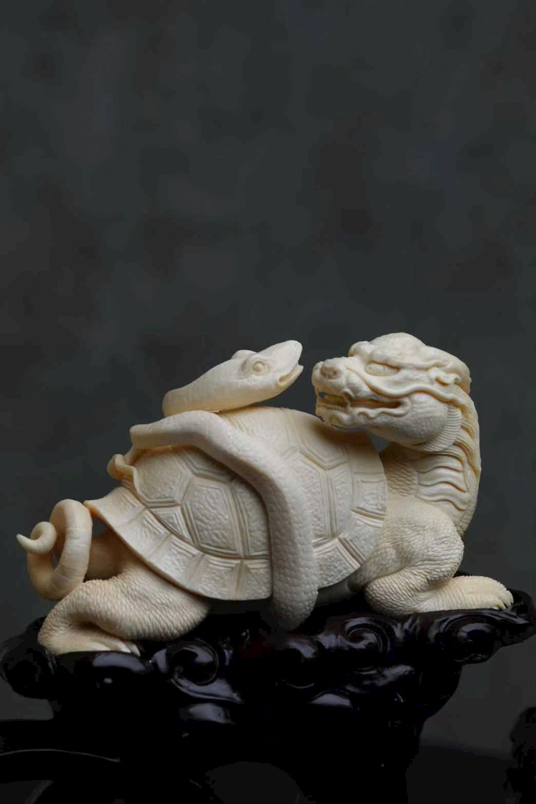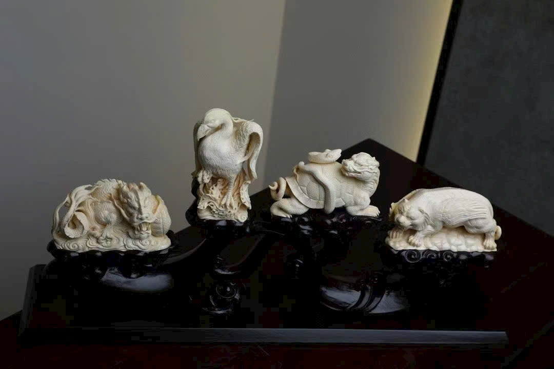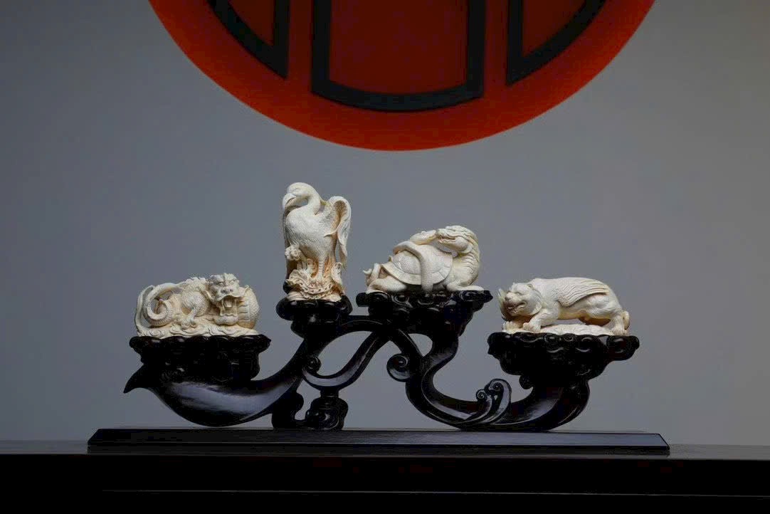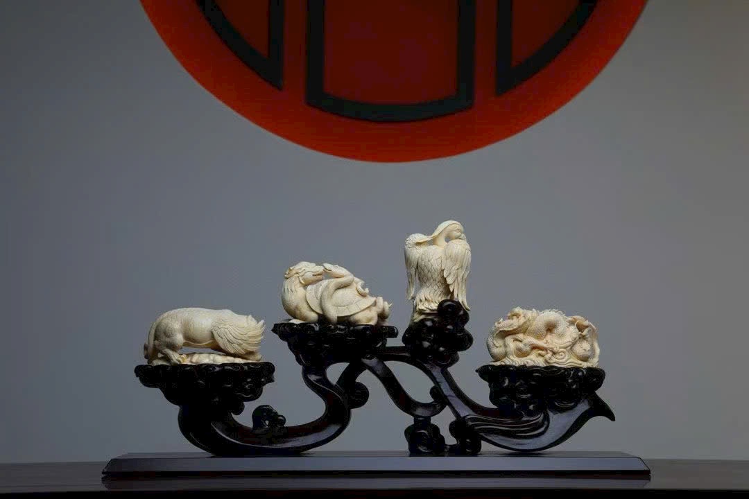 Tuyển chọn ng.à ma mút thượng phẩm, chất liệu bạch băng mãn văn, trong sáng tinh khiết. Toàn bộ tác phẩm được thiết kế dựa trên tư tưởng Âm Dương học “Trời tròn – Đất vuông”, hàm chứa triết lý sâu xa. Tác phẩm hoàn toàn thủ công tinh chạm tròn tượng, khắc họa sinh động Tứ Linh Thánh Thú – Thanh Long, Bạch Hổ, Chu Tước, Huyền Vũ, thần thái sống động như linh vật hiện hình.