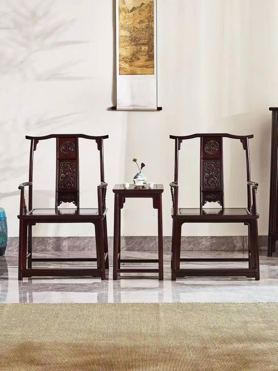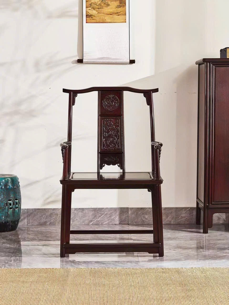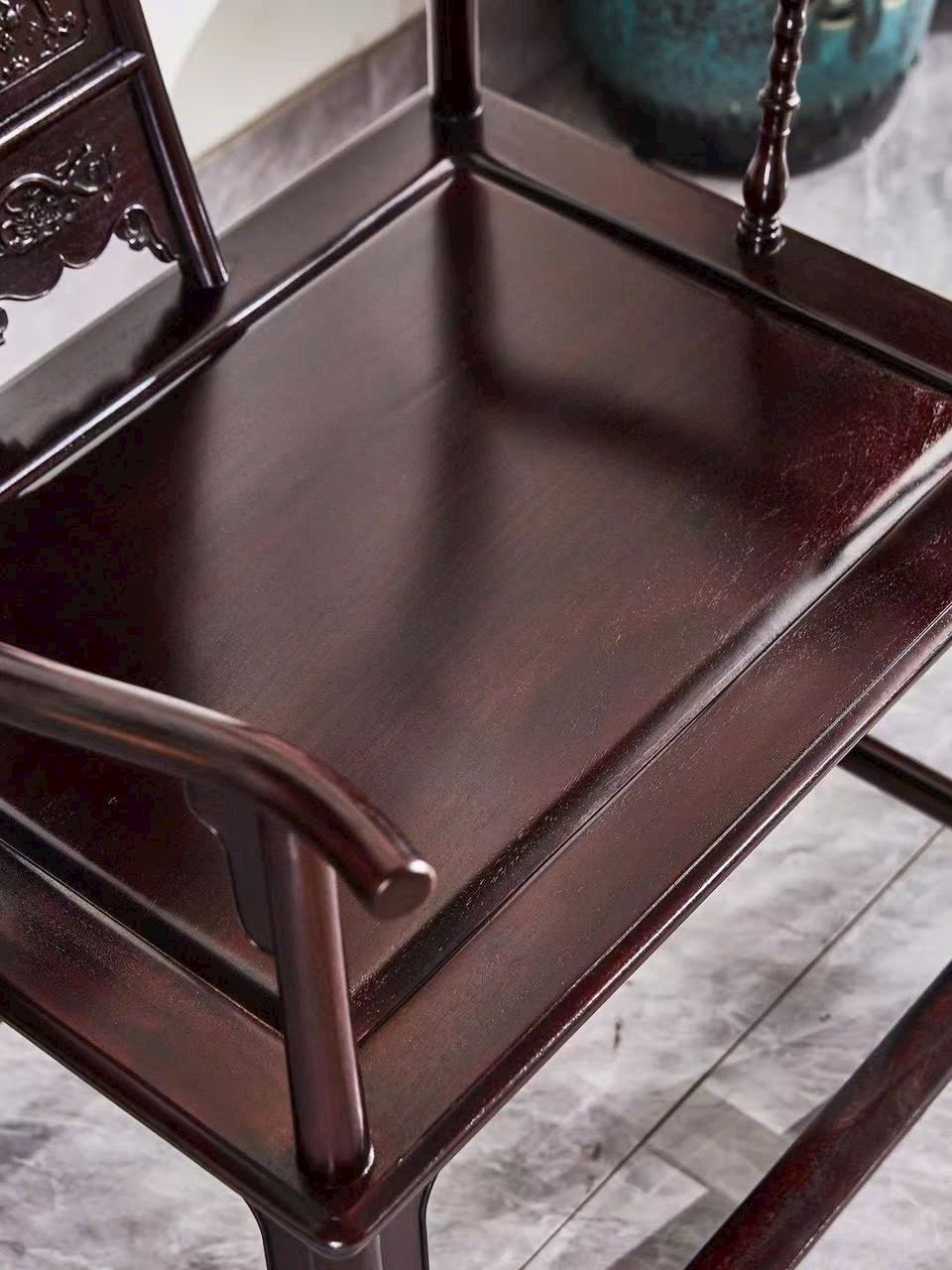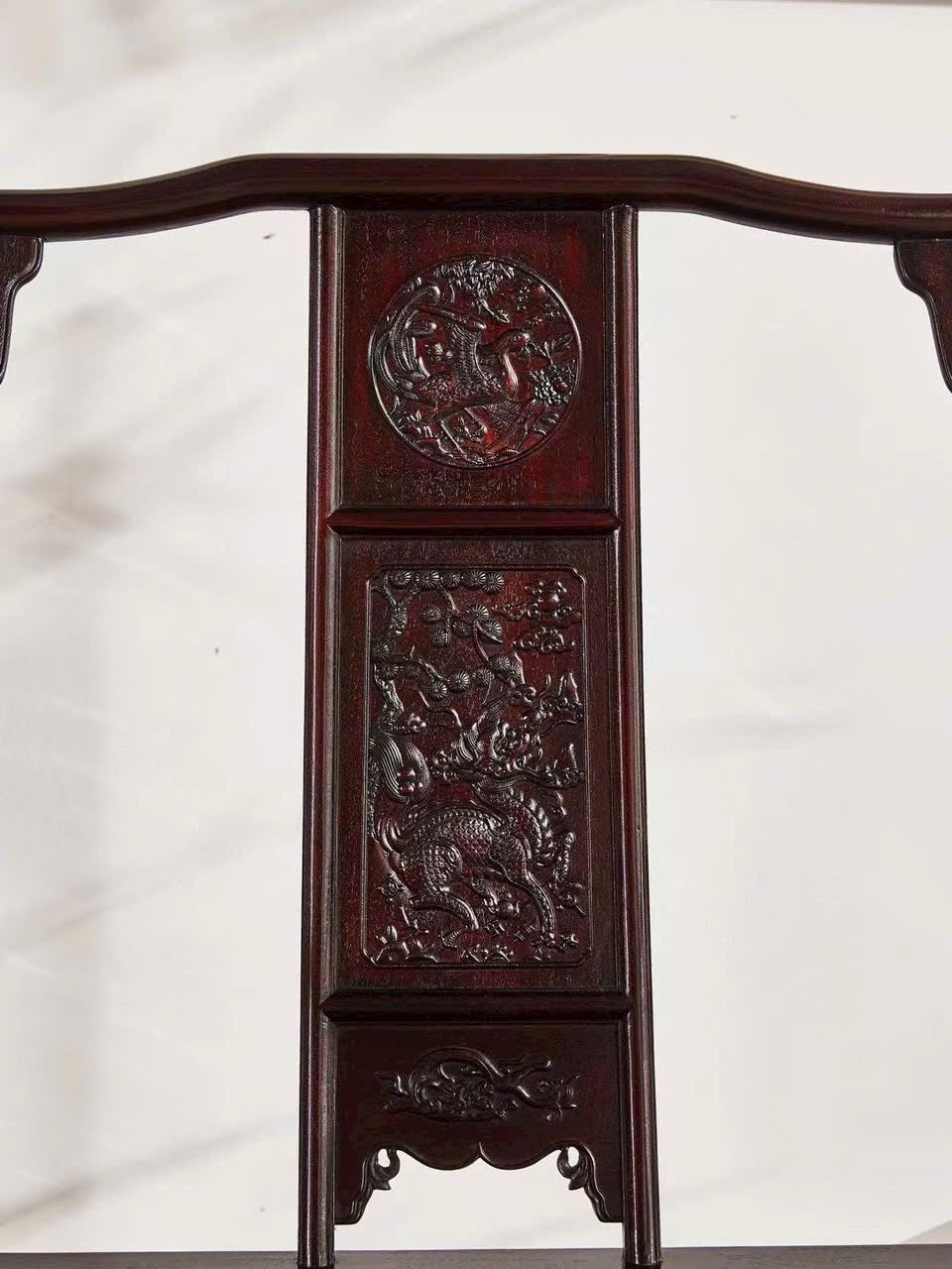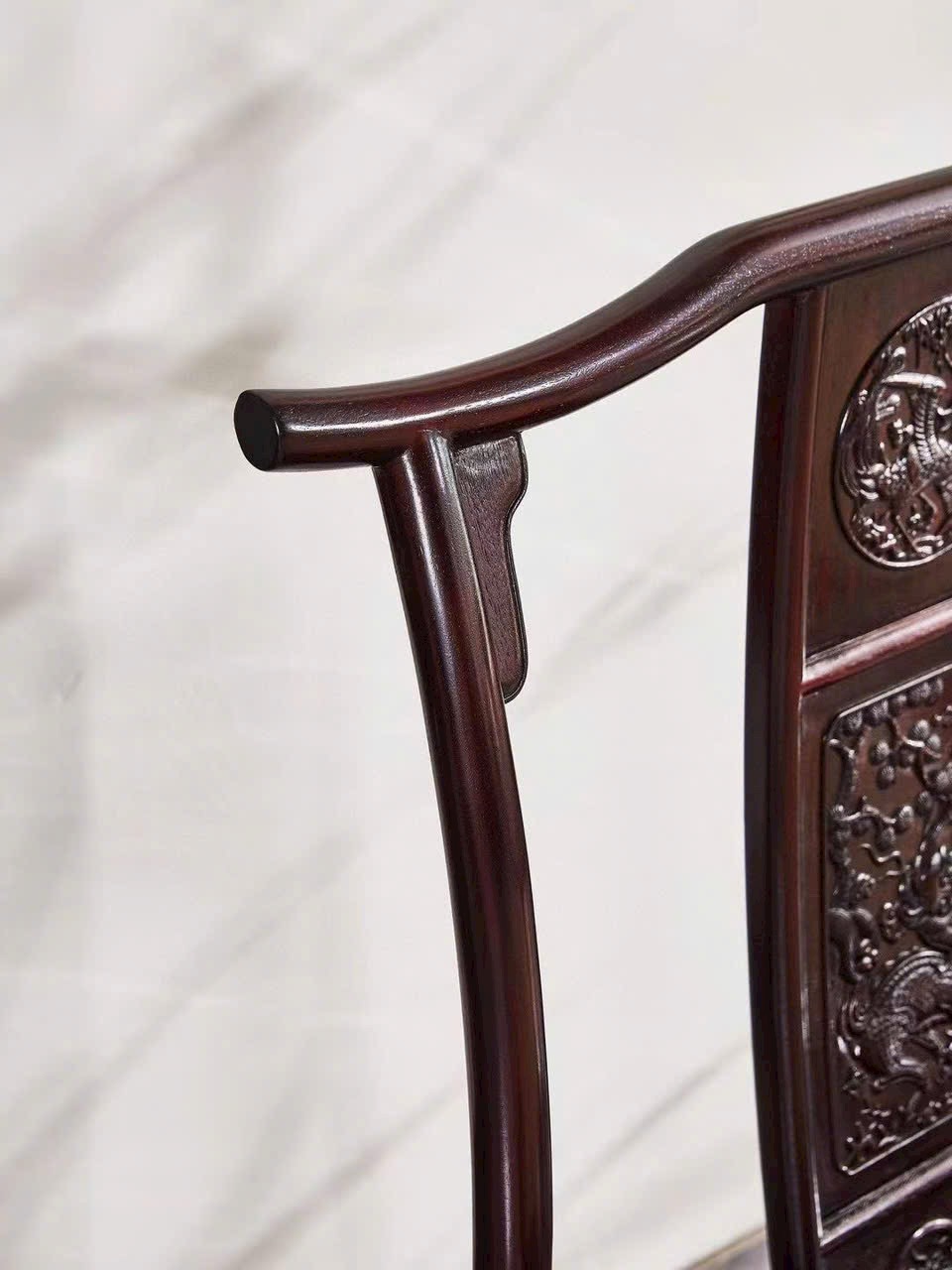 Dáng ghế quan mạo bề thế, lưng cao uy nghi, kết hợp họa tiết Kỳ Lân chạm khắc tinh xảo mang ý nghĩa cát tường và quyền quý. Tổng thể trang trọng, thích hợp bài trí phòng khách hoặc không gian tiếp khách mang phong vị cổ điển sang trọng.