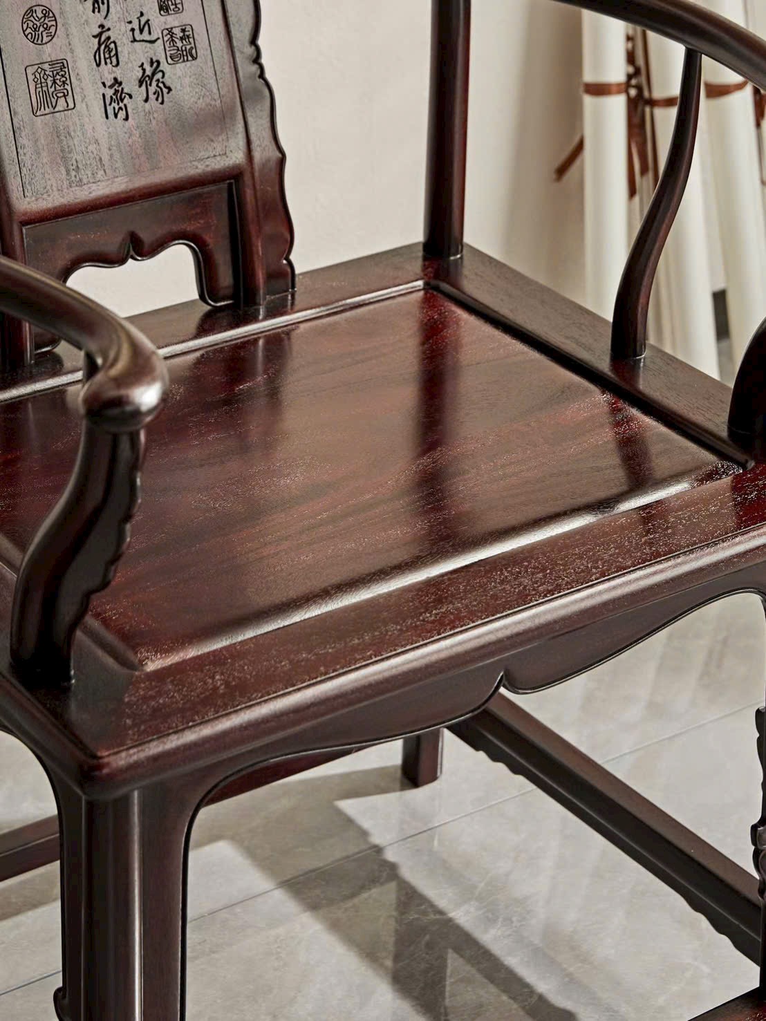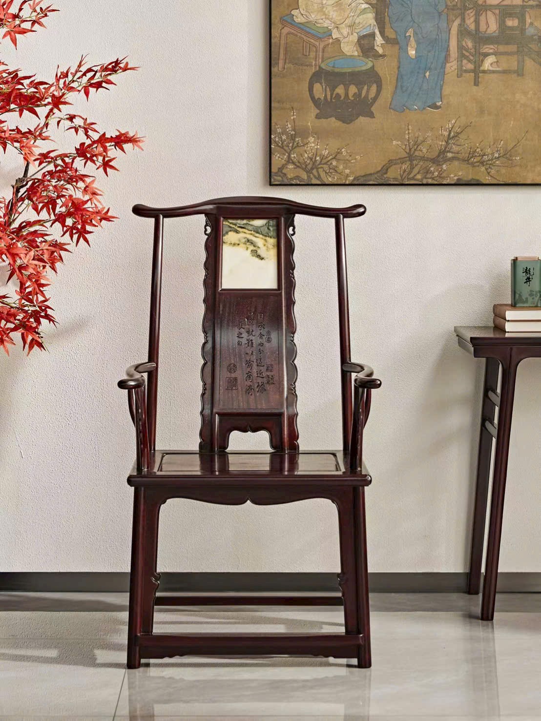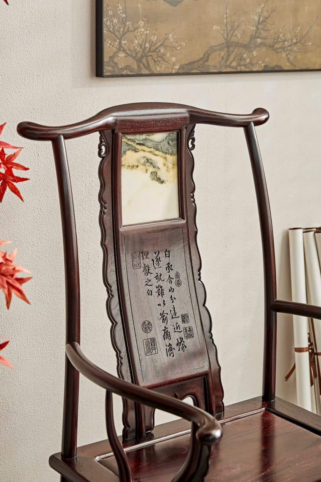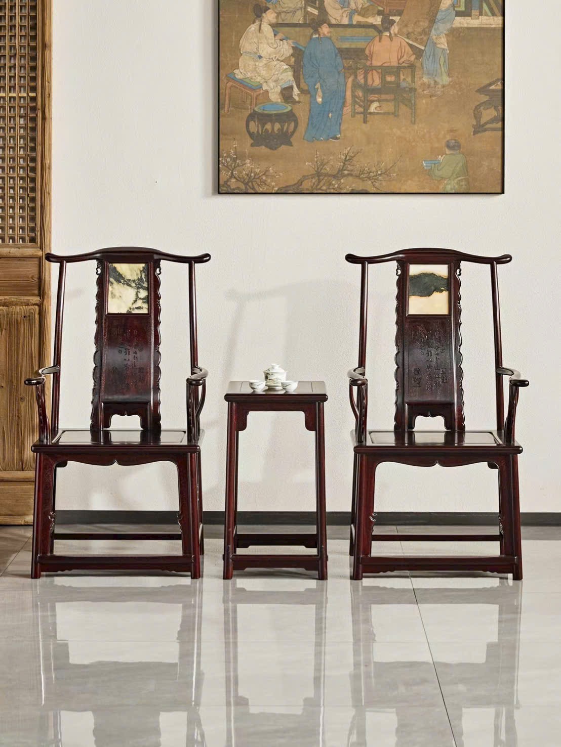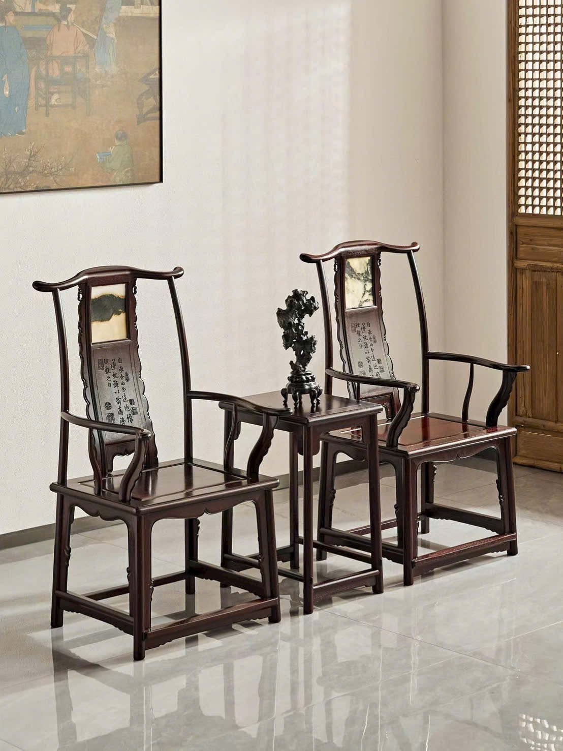 Thiết kế ghế quan mạo kết hợp mặt tựa/điểm nhấn vân thạch sang trọng, tạo chiều sâu và điểm nhấn nổi bật cho không gian. Dáng ghế bề thế, lưng cao uy nghi, tổng thể vừa cổ điển vừa trang nhã, thích hợp bài trí phòng khách hoặc phòng trà cao cấp.