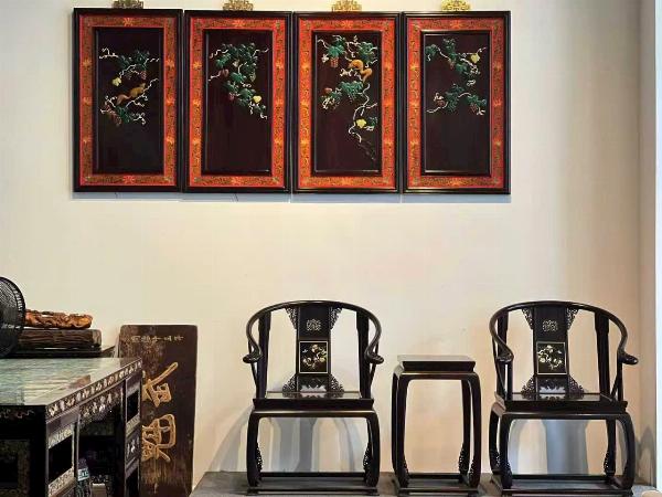 Khung treo làm từ gỗ Tử Đàn Zambia theo lối cổ, dạng treo tường truyền thống. Mặt màn sơn then, ứng dụng kỹ thuật khảm bách bảo tinh xảo, đính các loại ngọc thạch tạo hình hoa văn thanh nhã theo phong cách cổ điển. Bày tại phòng khách hoặc sảnh, tôn lên vẻ trang trọng, thanh lịch, đậm khí chất quý phái Trung Hoa.