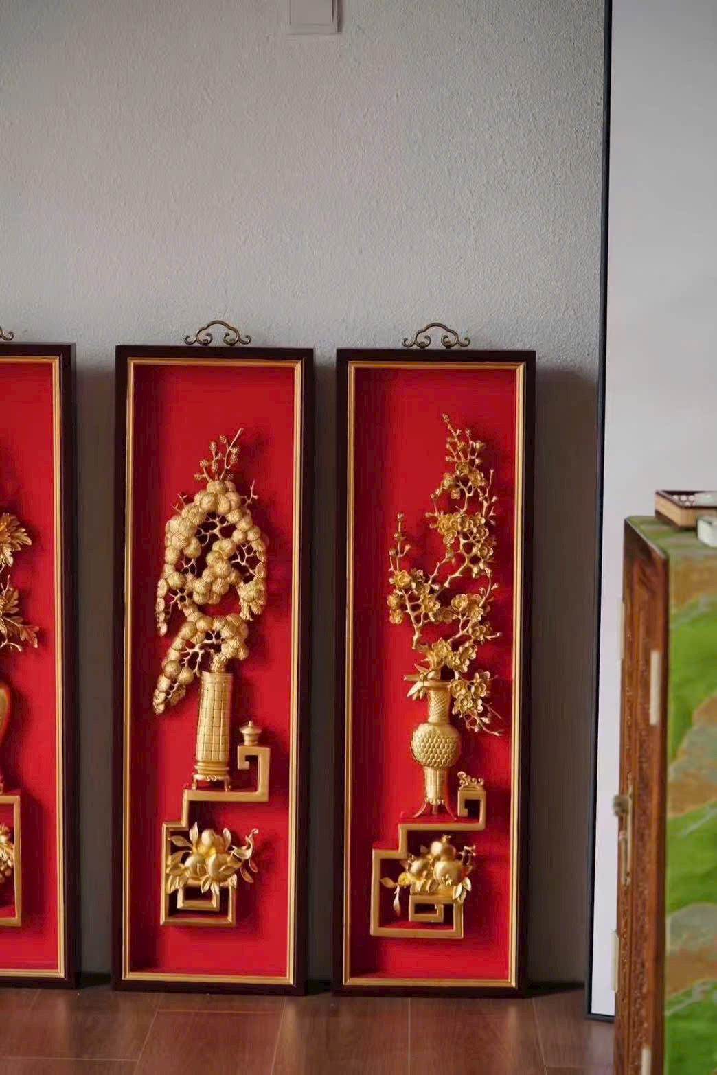 Mỗi tấm đều phủ nền đỏ tươi rực rỡ, sắc đỏ nồng nhiệt như lời chúc năm mới, lập tức làm bừng sáng không gian, tràn đầy ý vị hỷ sự – cát tường – phú vinh.