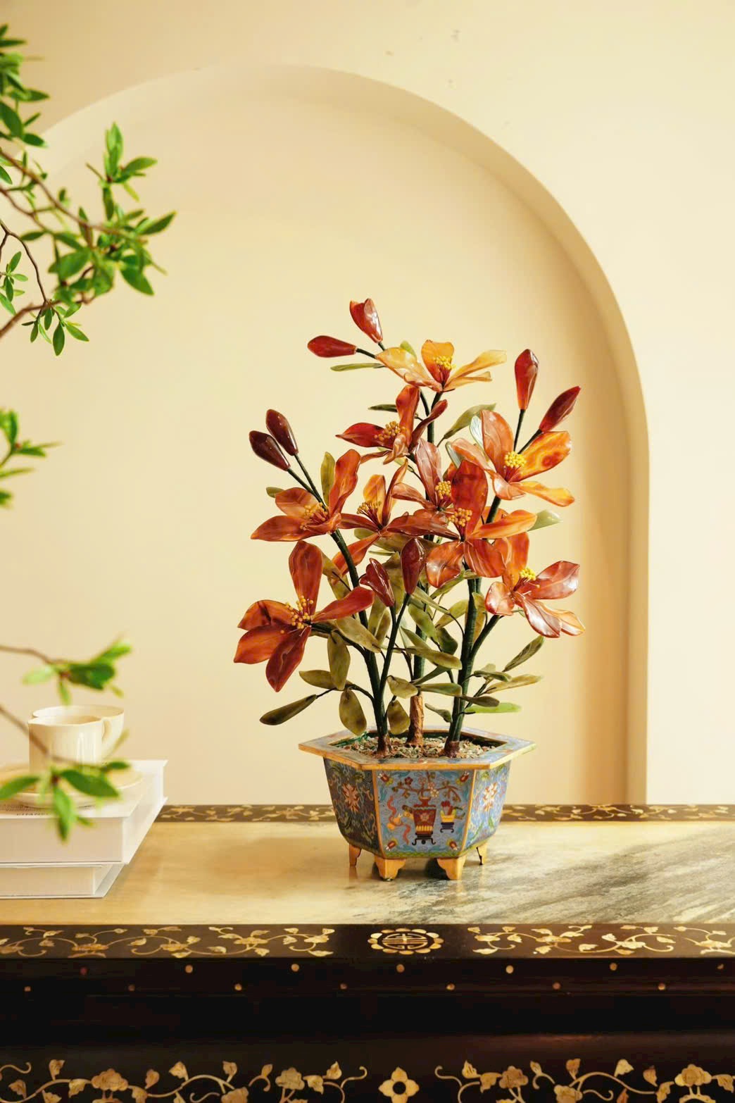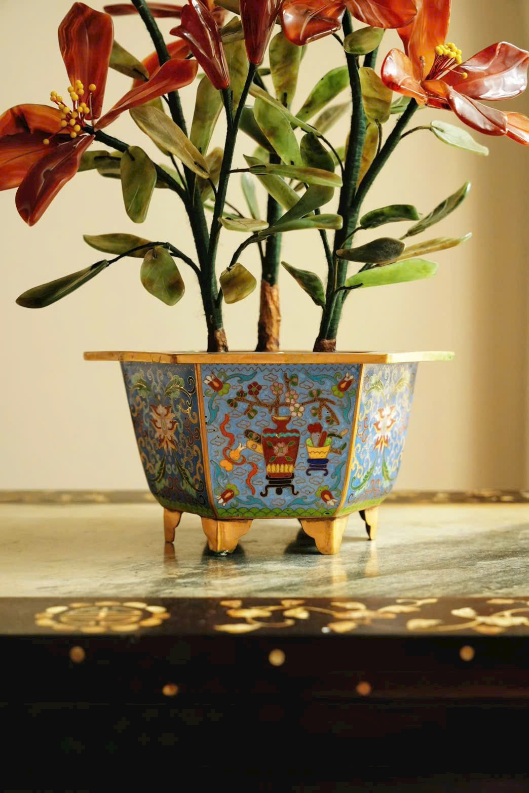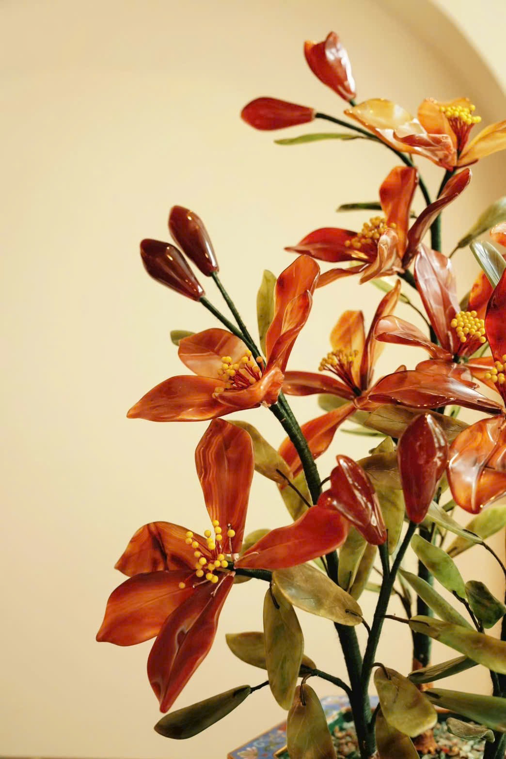 Tác phẩm bồn cảnh hoa ly tượng sinh được chế tác từ đá tự nhiên, sắc mã não đỏ nổi bật trên nền lá bích ngọc xanh thẫm. Chậu Cảnh Thái Lam cổ điển càng làm tổng thể thêm sang trọng.