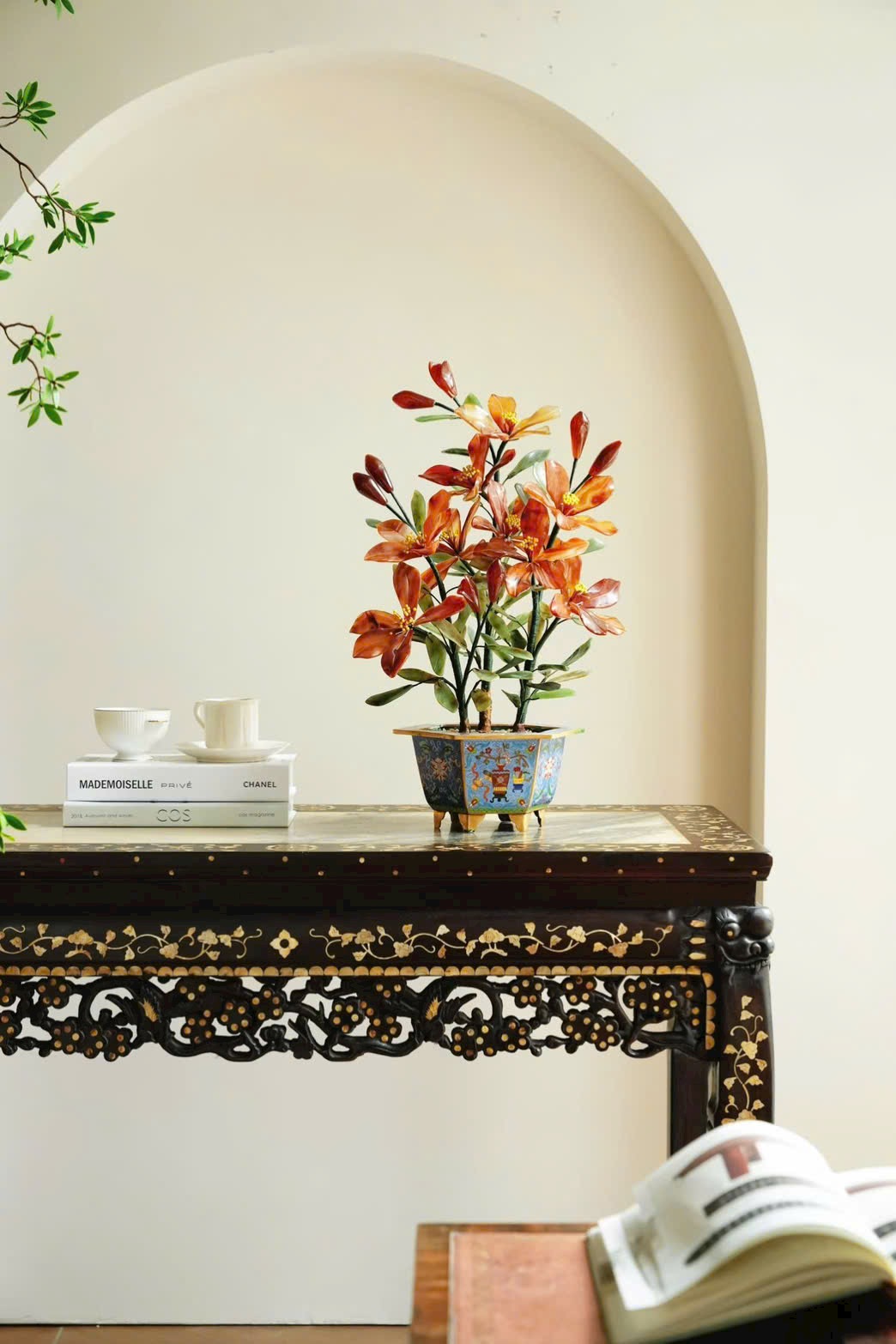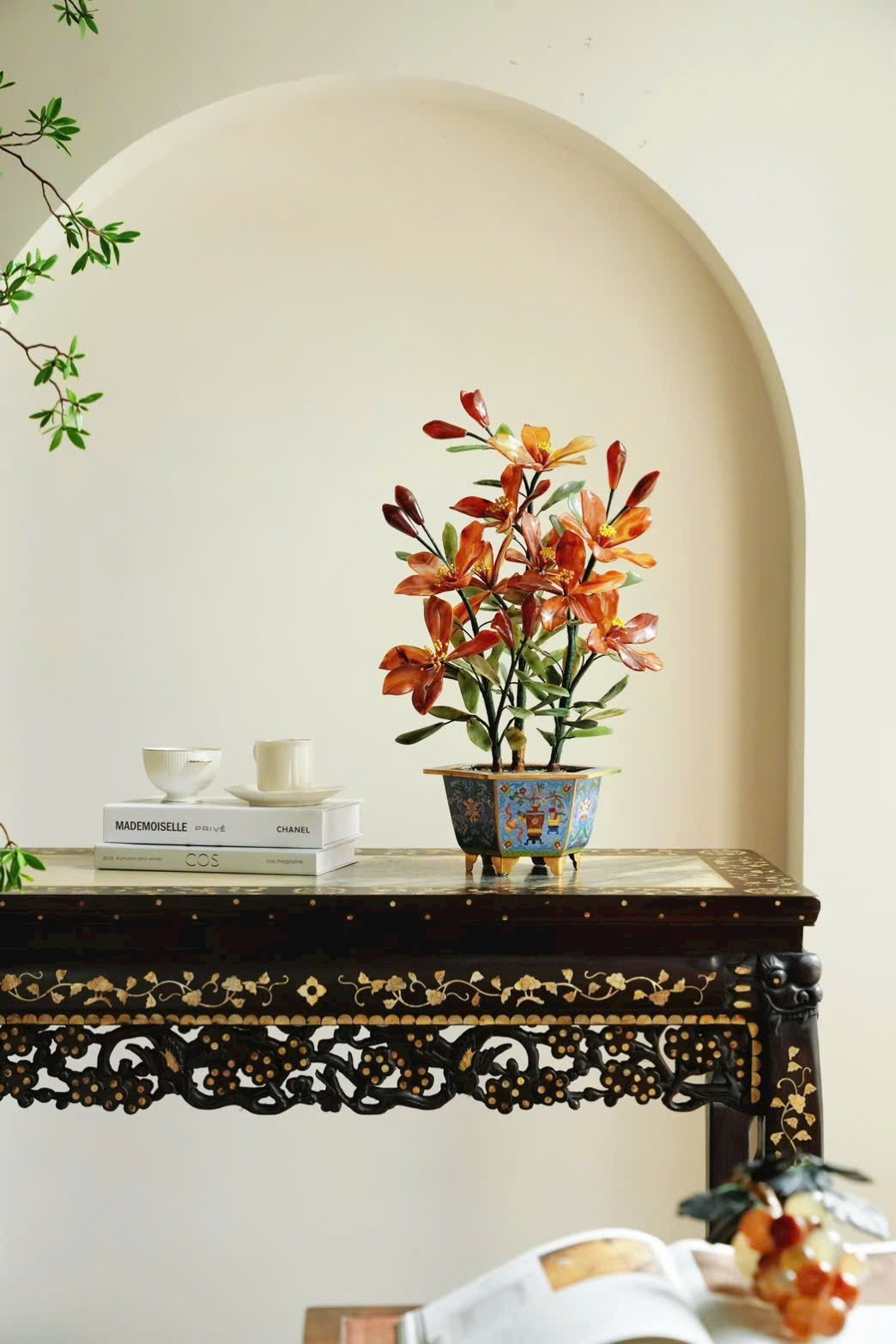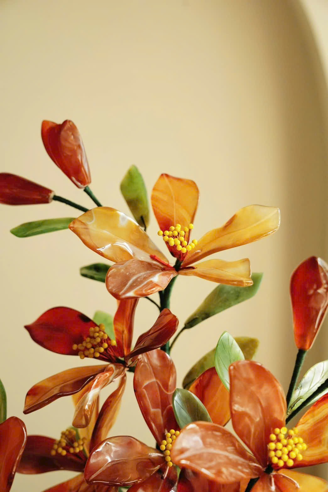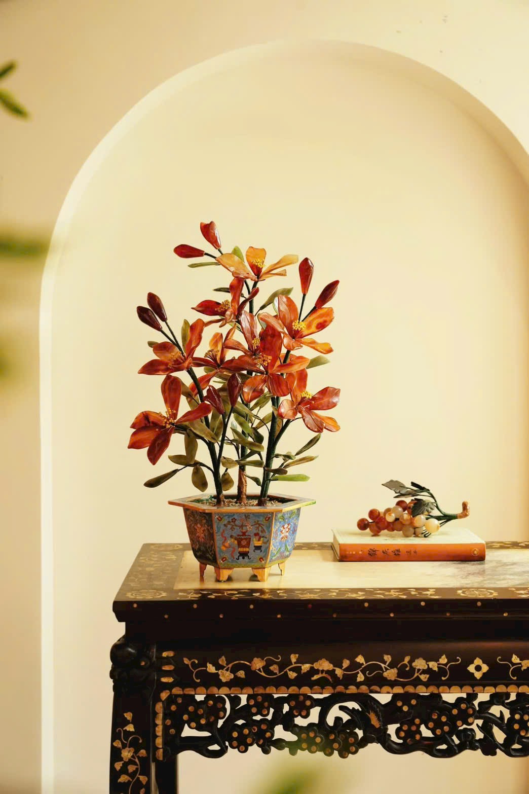 Tác phẩm bồn cảnh hoa ly tượng sinh được chế tác từ đá tự nhiên, sắc mã não đỏ nổi bật trên nền lá bích ngọc xanh thẫm. Chậu Cảnh Thái Lam cổ điển càng làm tổng thể thêm sang trọng.