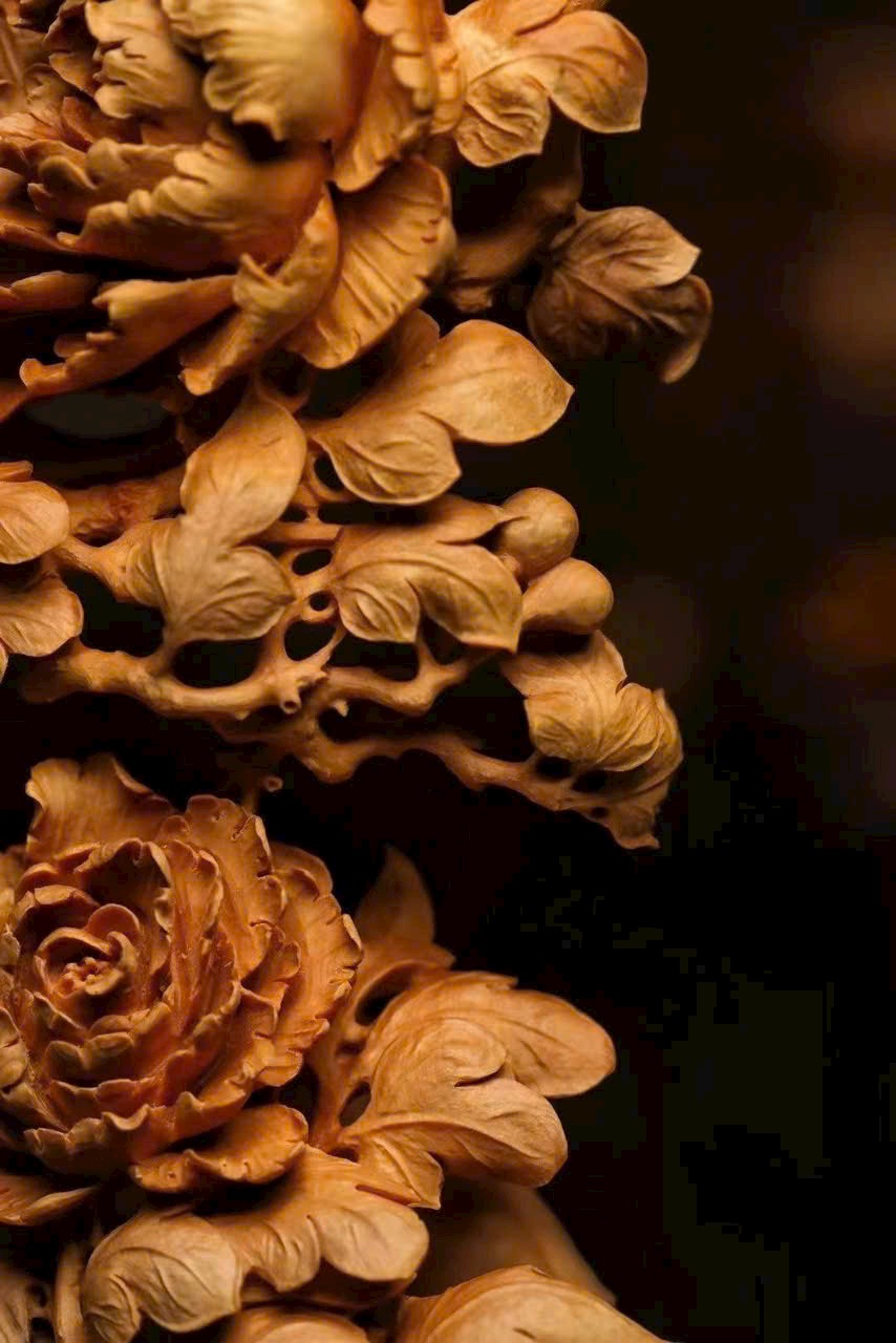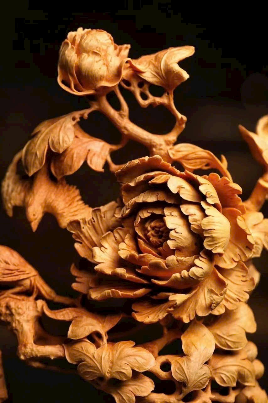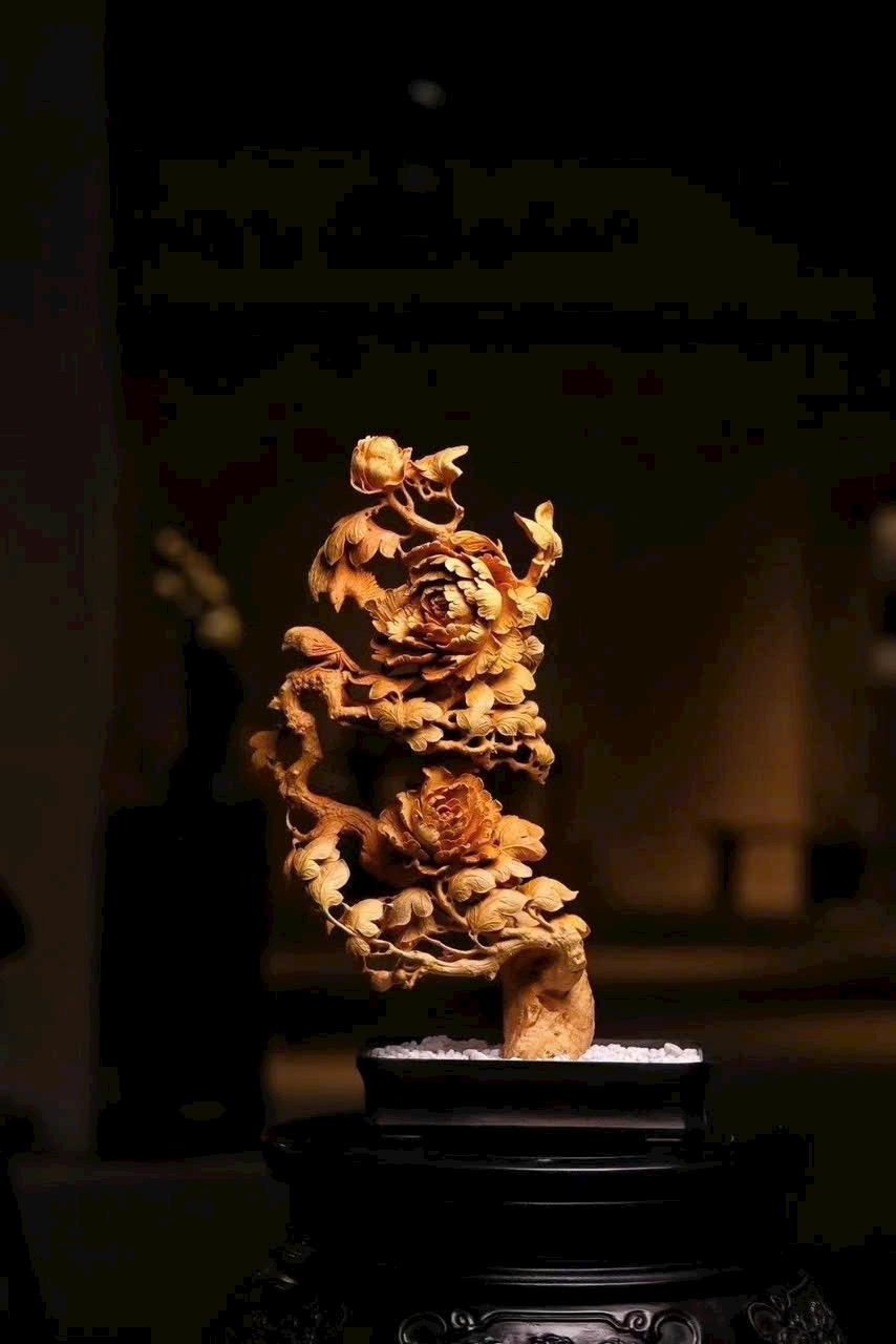 Một khối gỗ khắc nên cảnh mẫu đơn nở rộ, chim hoa quấn quýt. Cánh hoa tinh xảo như thật, cành lá đan xen hàm chứa tâm ý thợ tài. Vẻ đẹp sống động của mùa xuân được gom lại trong tác phẩm duy mỹ này – thanh nhã và vĩnh cửu.