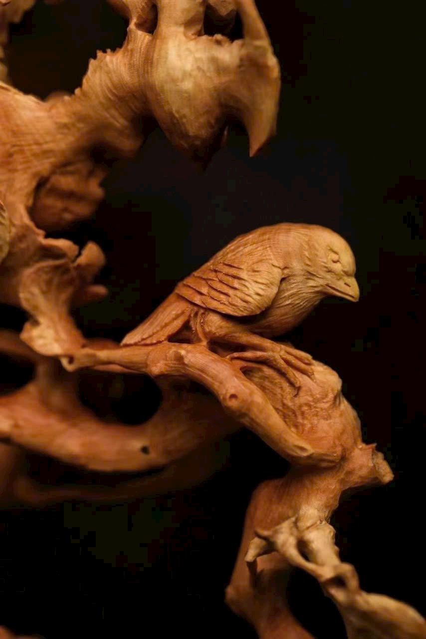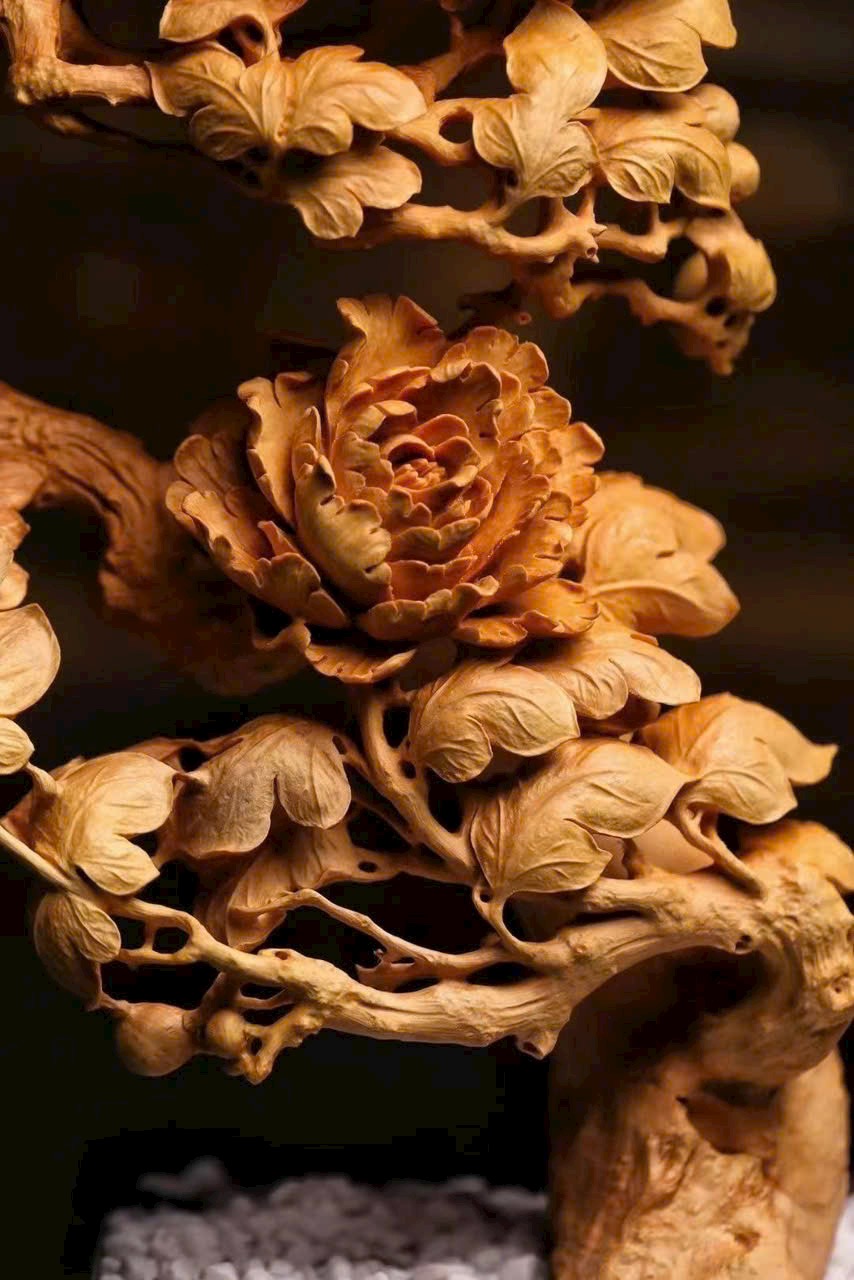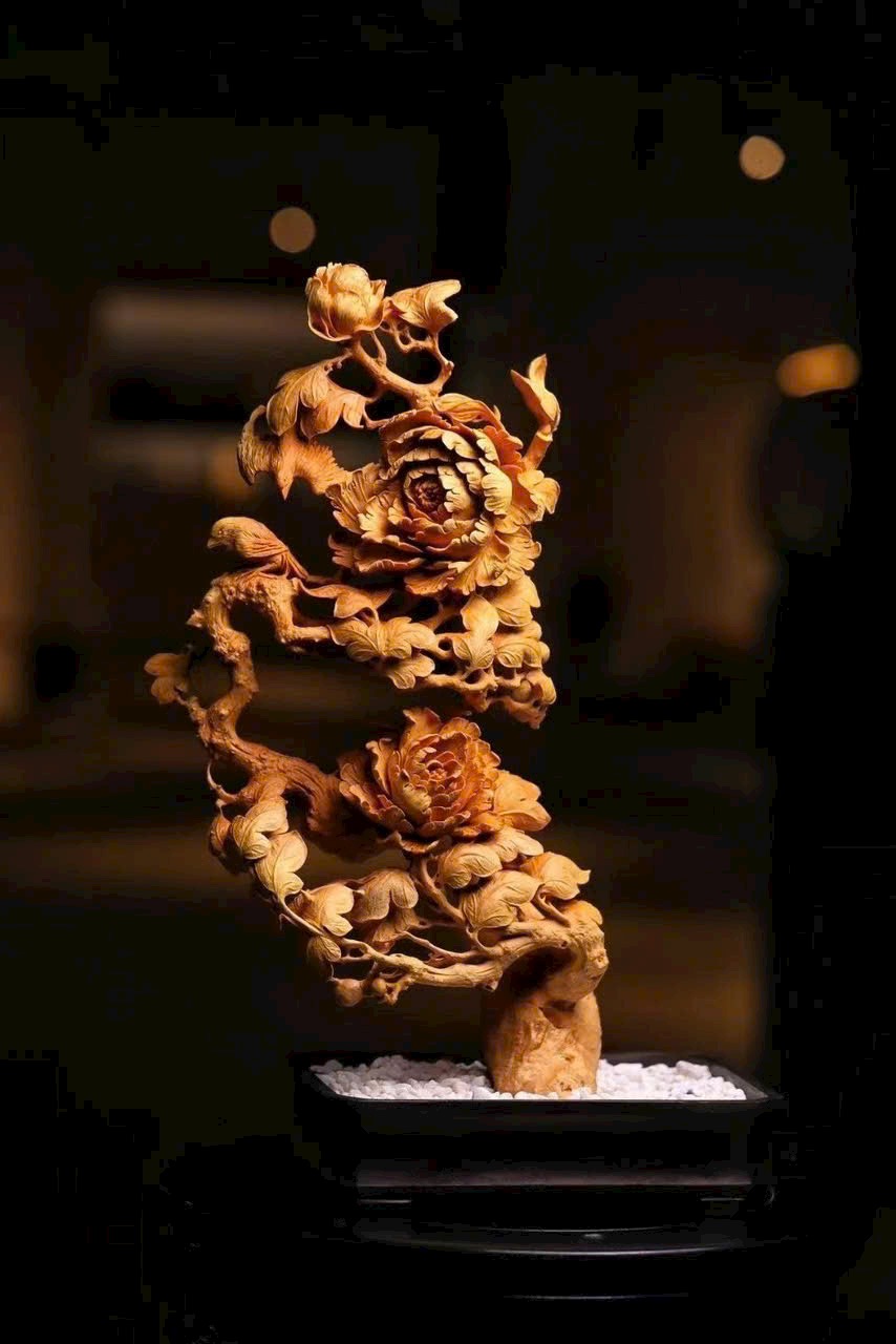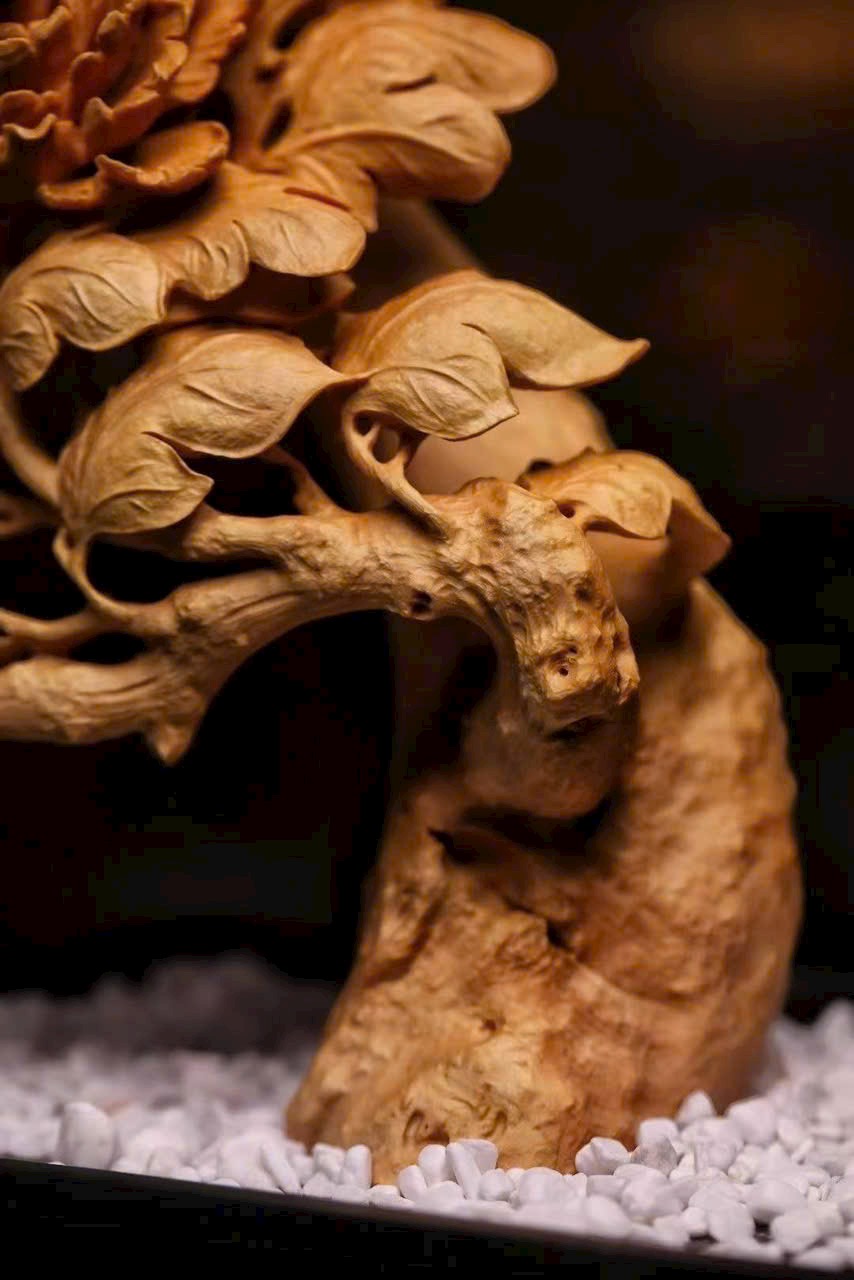 Một khối gỗ khắc nên cảnh mẫu đơn nở rộ, chim hoa quấn quýt. Cánh hoa tinh xảo như thật, cành lá đan xen hàm chứa tâm ý thợ tài. Vẻ đẹp sống động của mùa xuân được gom lại trong tác phẩm duy mỹ này – thanh nhã và vĩnh cửu.
