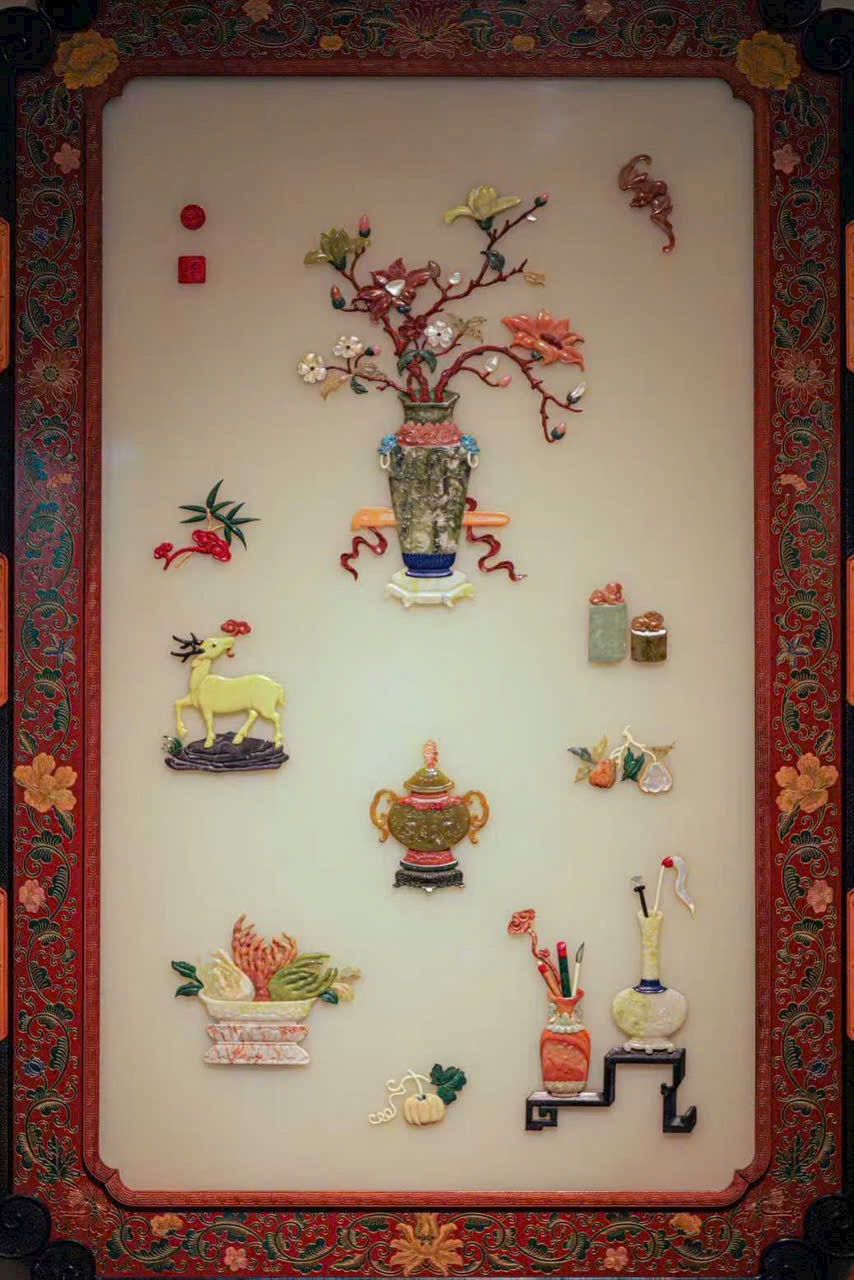 Tác phẩm sử dụng ngọc thạch làm nền, thể hiện đồ án “Bách bảo bác cổ” – biểu trưng cho văn nhã, phú quý và trí tuệ. Khung được chế tác từ tử đàn Zambia, nền là phiến ngọc lớn, trên đó khảm chạm bách bảo ngọc thạch tinh xảo bằng kỹ pháp điêu khắc và nạm khảm truyền thống.