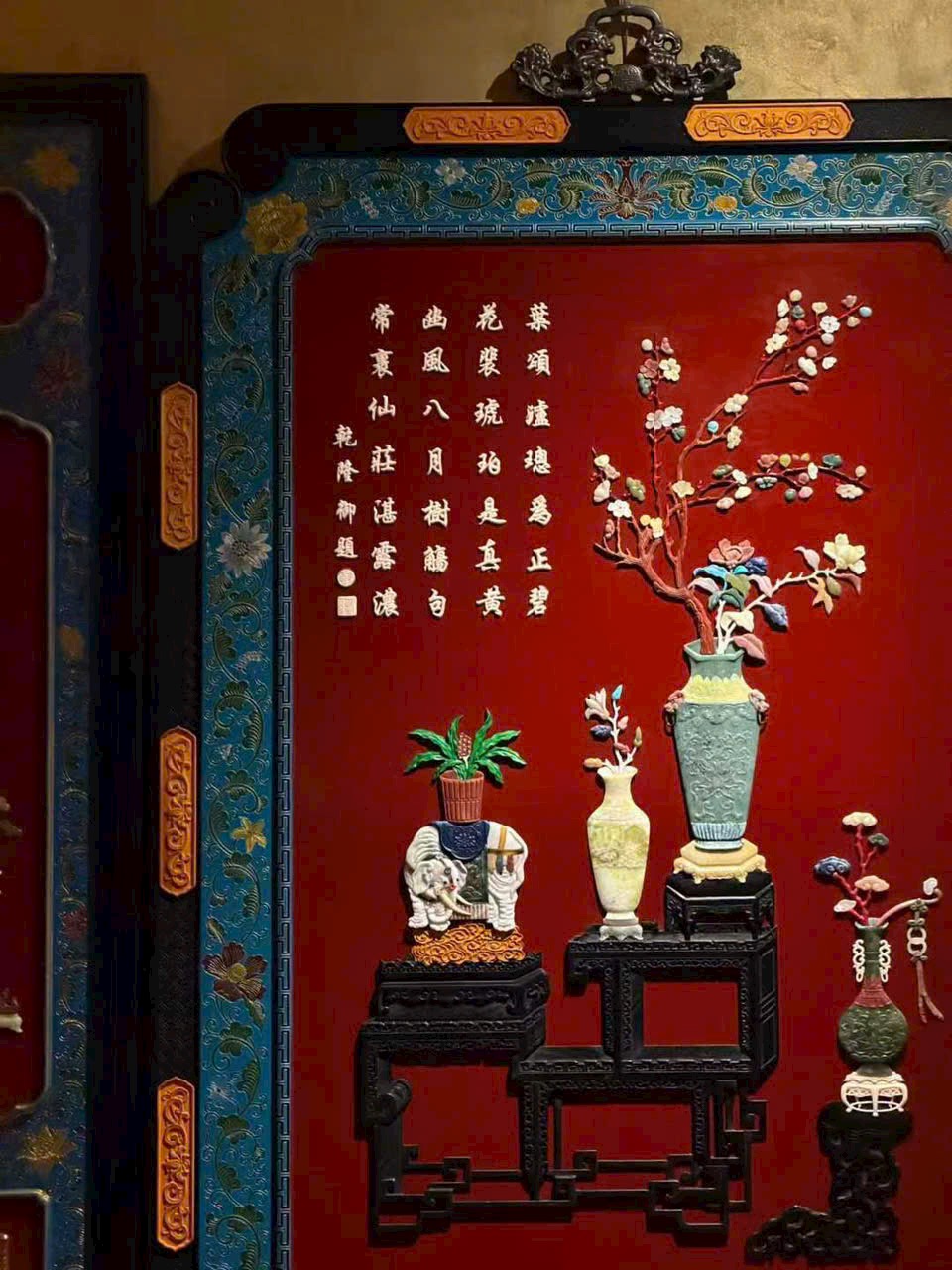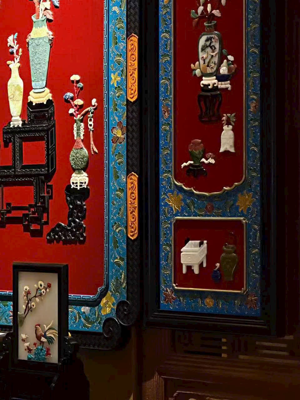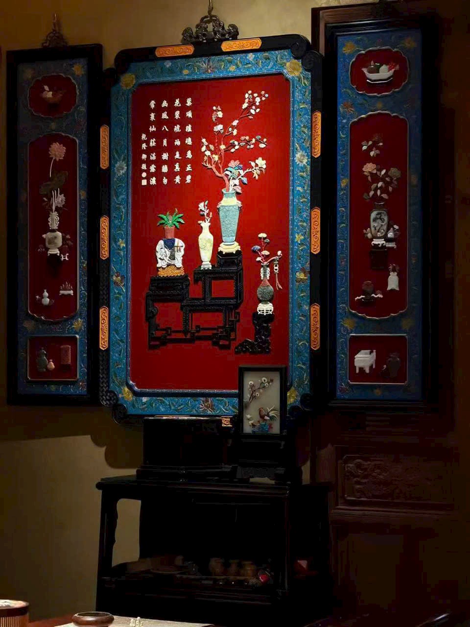 Khung làm từ gỗ huyết đàn Zambia, nền phủ sơn mài, khảm ghép các vật báu trong đề tài “bác cổ thanh cống”.