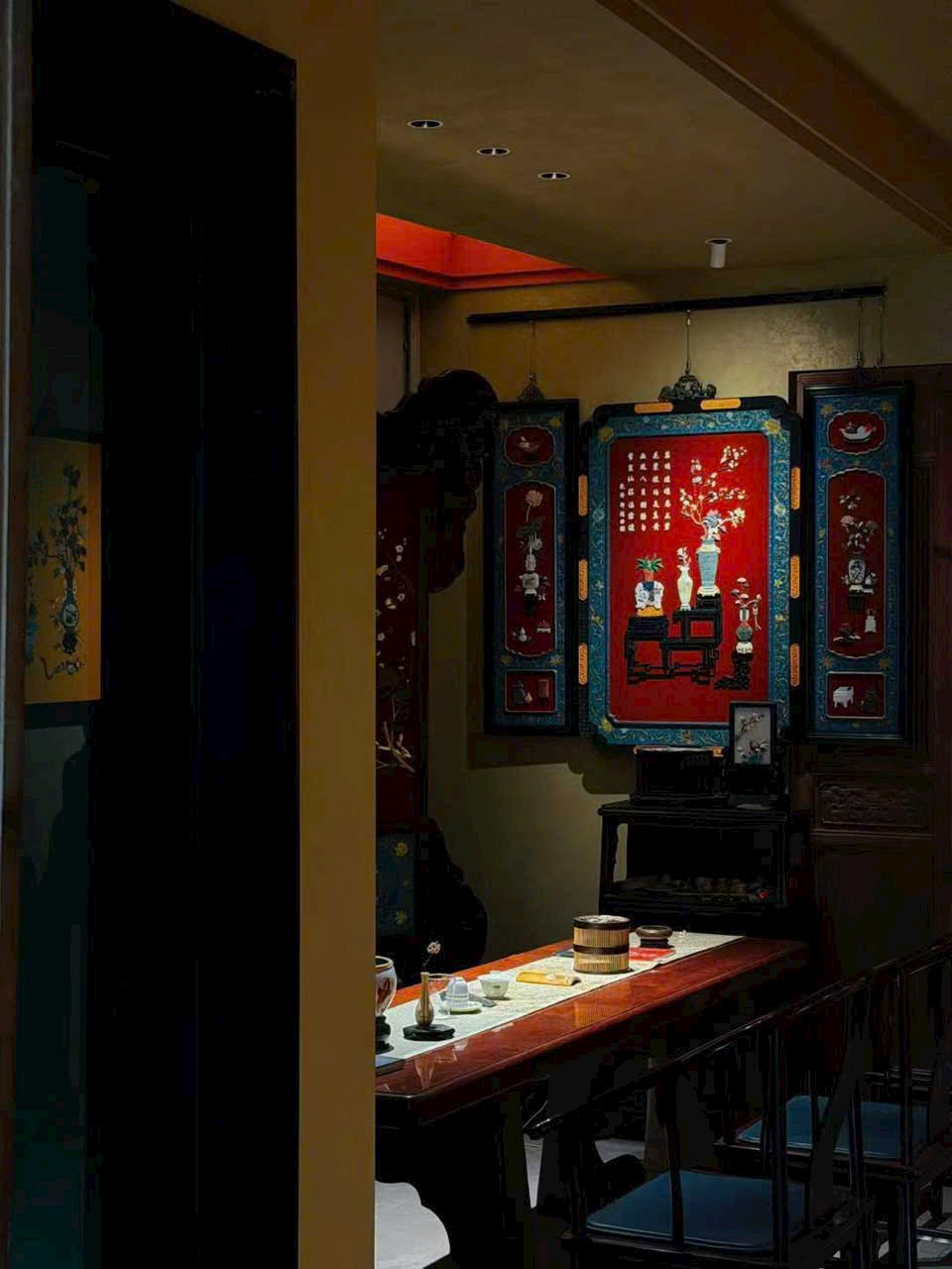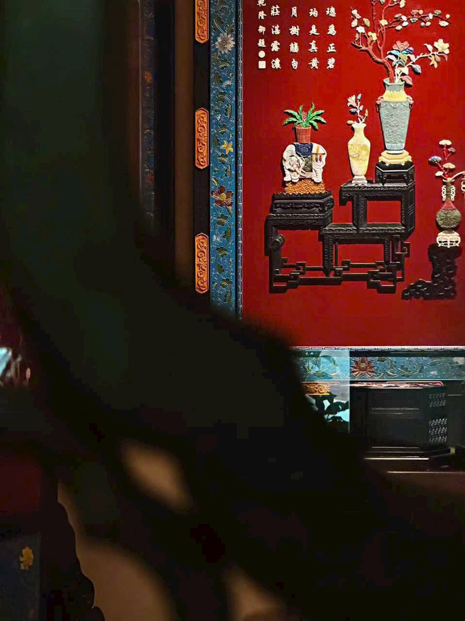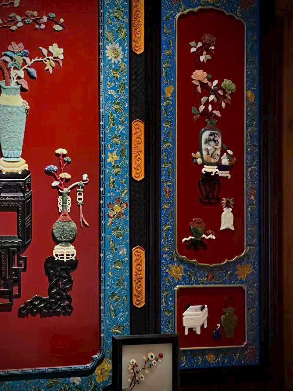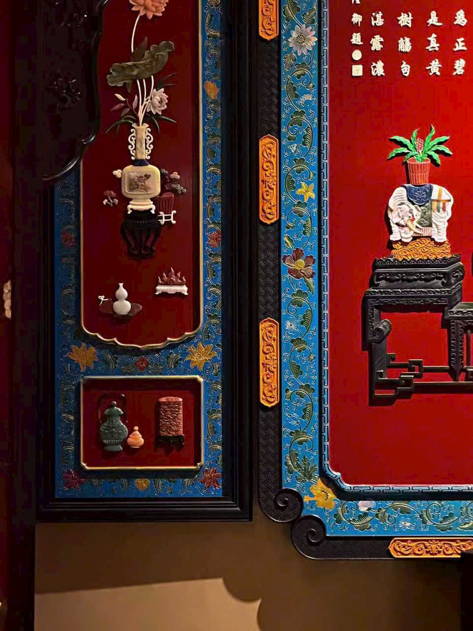 Khung làm từ gỗ huyết đàn Zambia, nền phủ sơn mài, khảm ghép các vật báu trong đề tài “bác cổ thanh cống”.