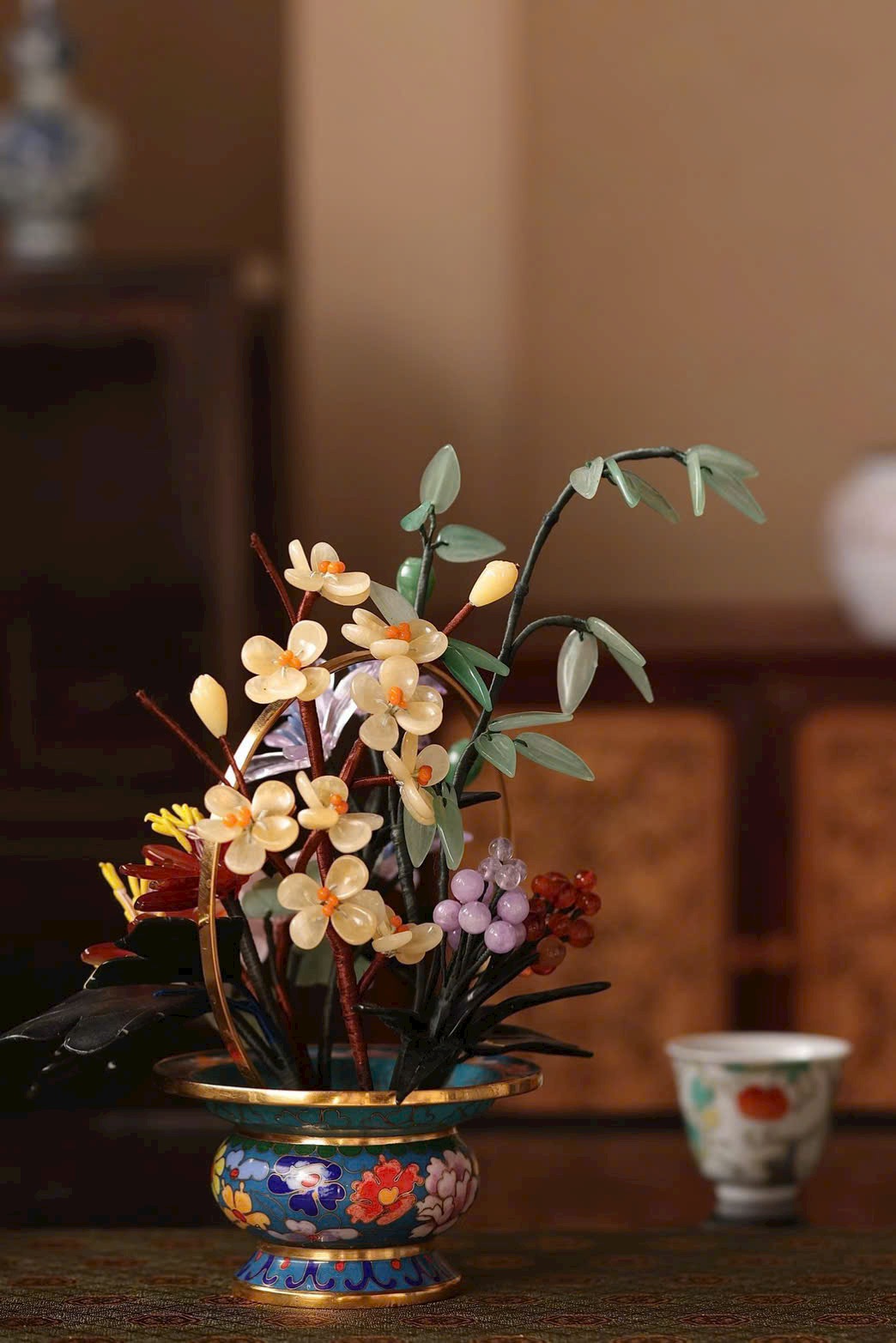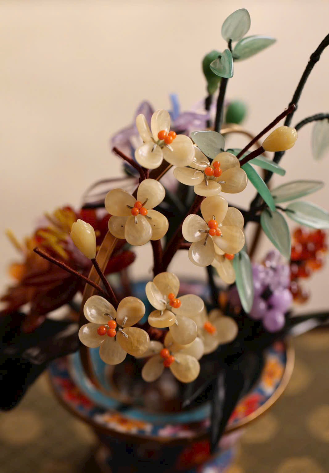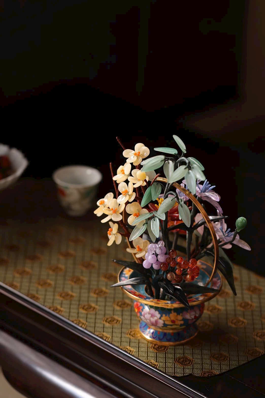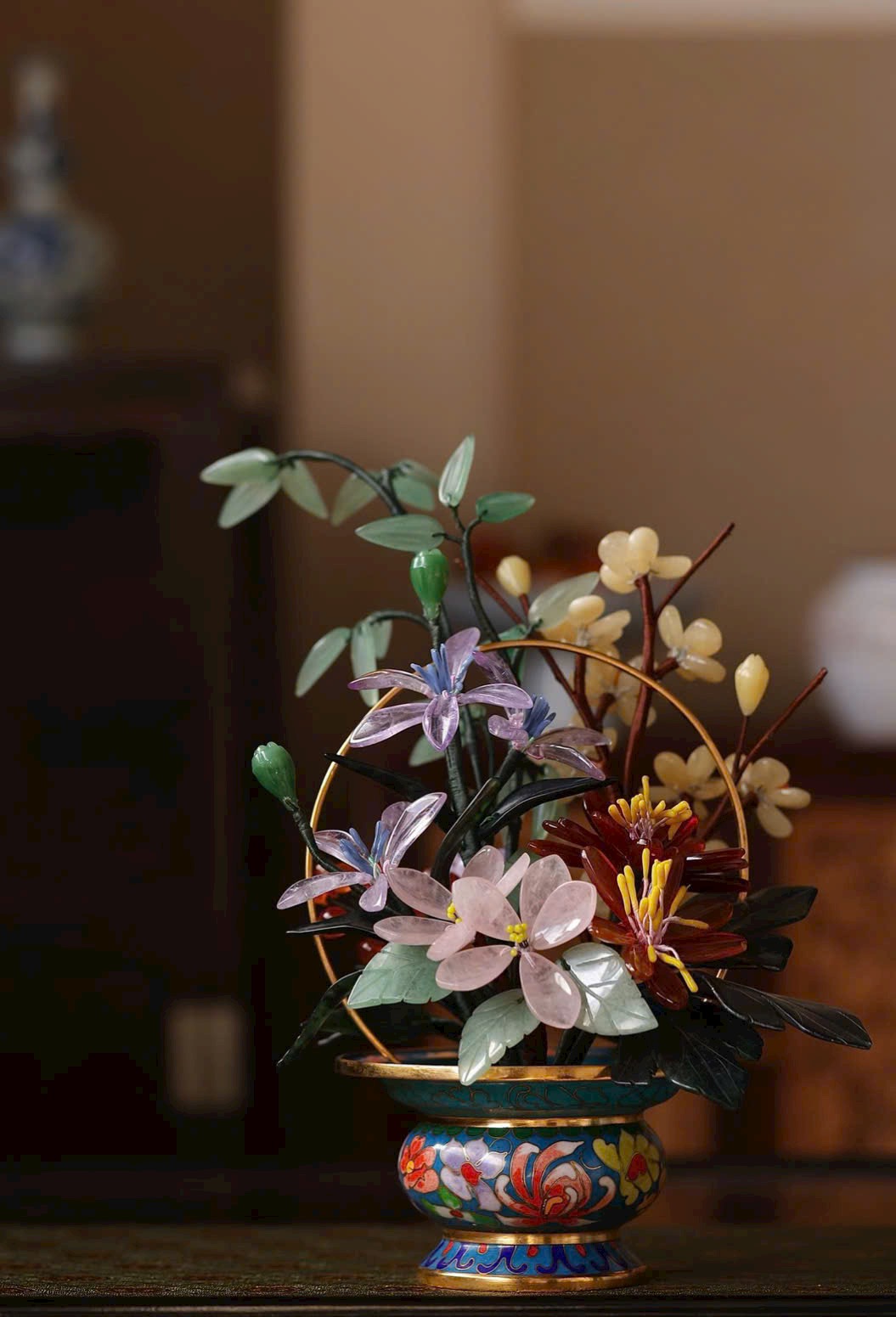 Tác phẩm: “Bước Bước Sinh Hoa” – Cảnh Thái Lam khảm sợi men màu · Chậu hoa ngọc