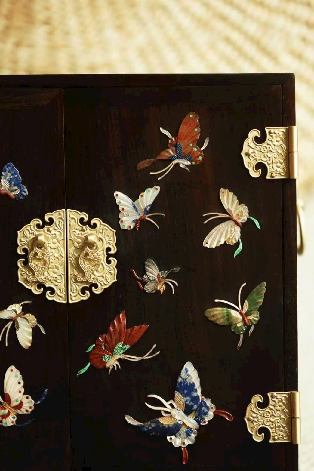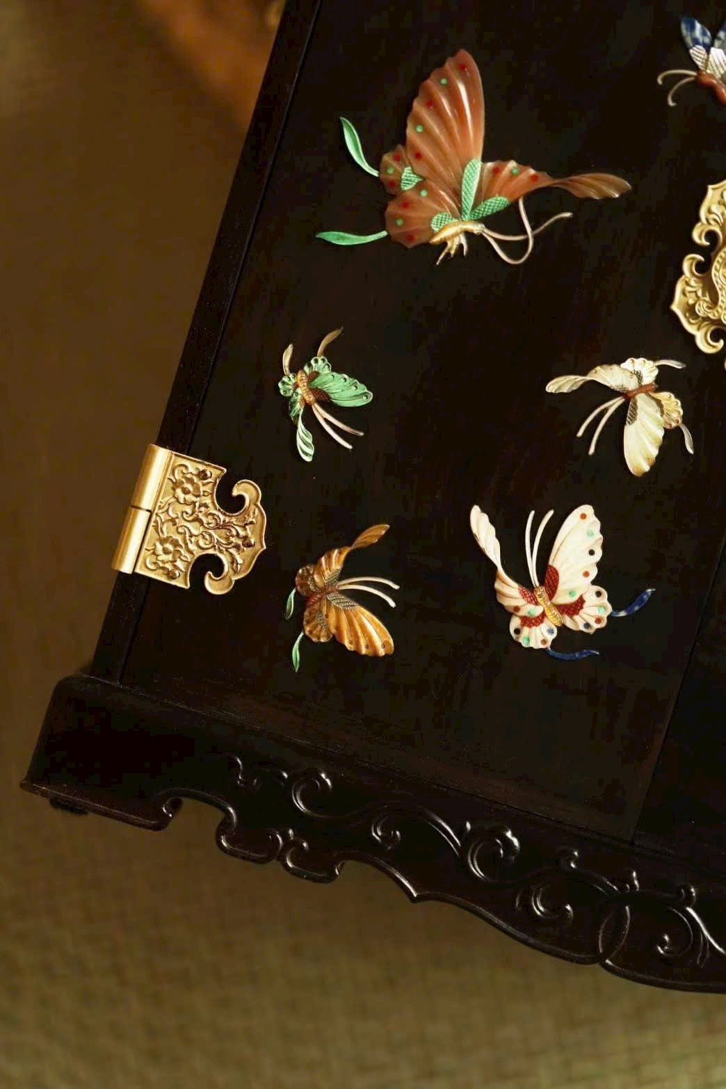 Tác phẩm được chế tác từ gỗ trắc đỏ lão liệu, kết cấu mộng gỗ truyền thống, chắc chắn và bền bỉ theo thời gian. Cánh tủ ứng dụng kỹ nghệ khảm bách bảo ngọc – đá, tạo nên bức họa bướm xuân sinh động, tràn đầy khí xuân, sắc màu hài hòa, tinh tế. Phụ kiện đồng thủ công được gia công tỉ mỉ, góp phần hoàn thiện vẻ đẹp cổ điển.