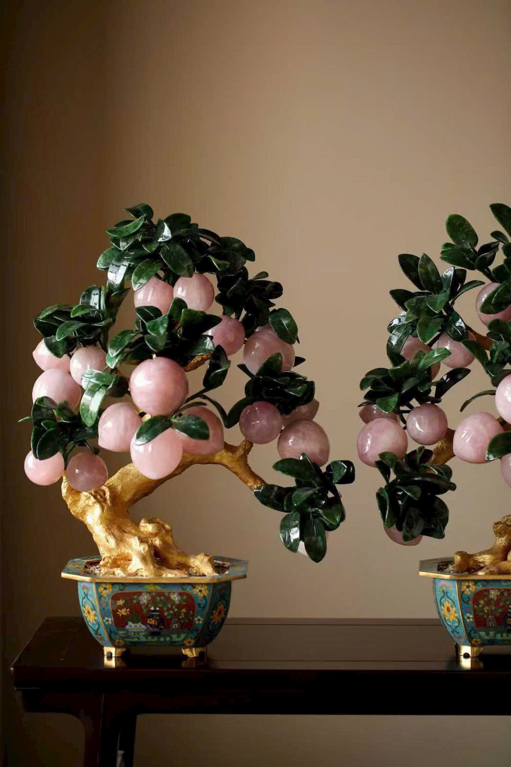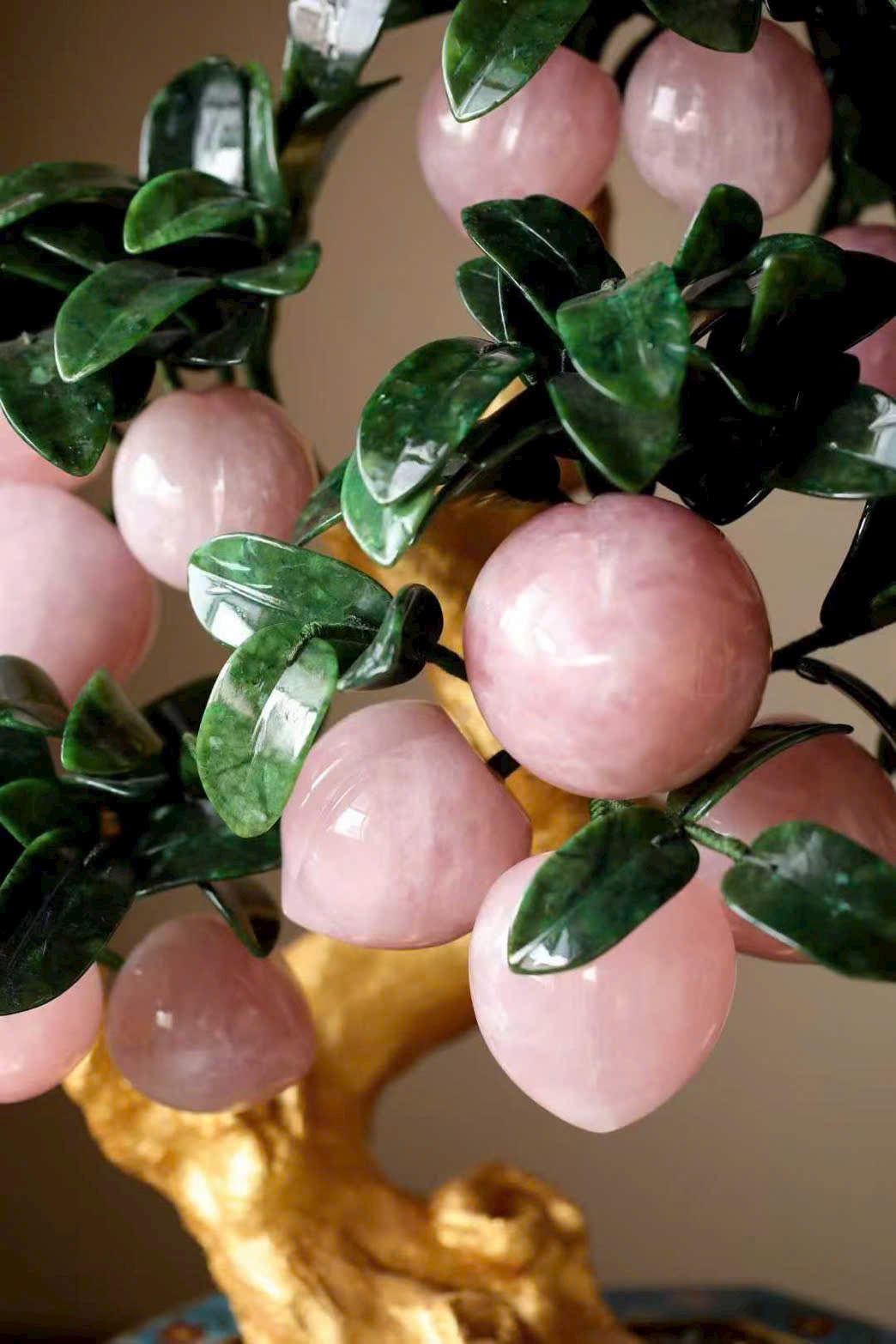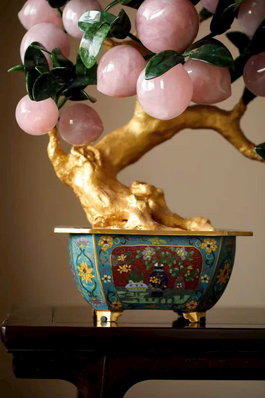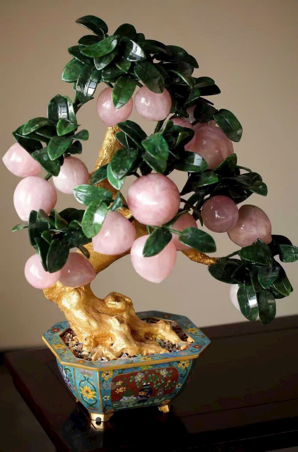 Những trái đào tiên được chạm khắc hoàn toàn từ ngọc thạch, hội tụ linh khí tự nhiên và tâm huyết của nghệ nhân, đặt trọn trong chậu Cảnh Thái Lam tinh xảo, tạo nên một tác phẩm bồn cảnh vừa thanh nhã, vừa cát tường, mang ý nghĩa trường thọ – phúc lành – viên mãn.