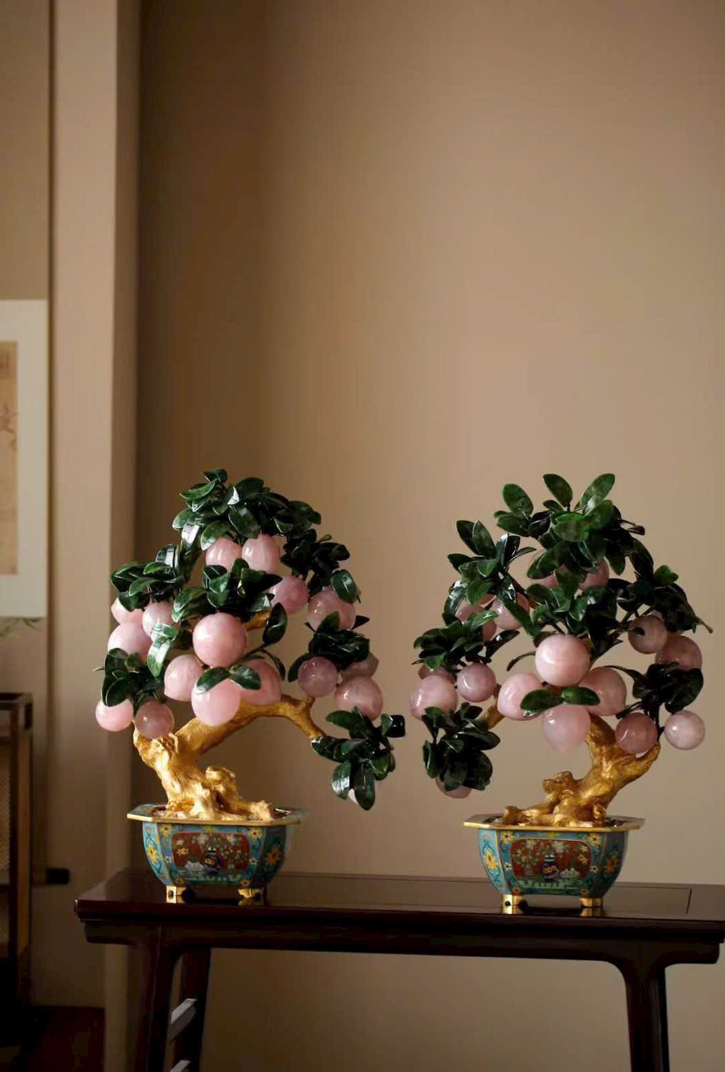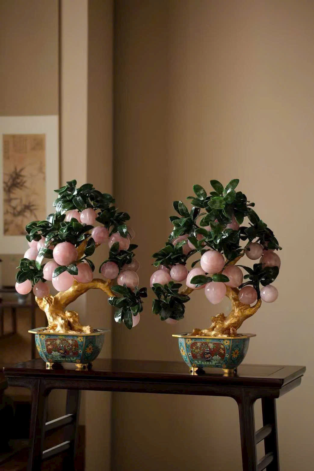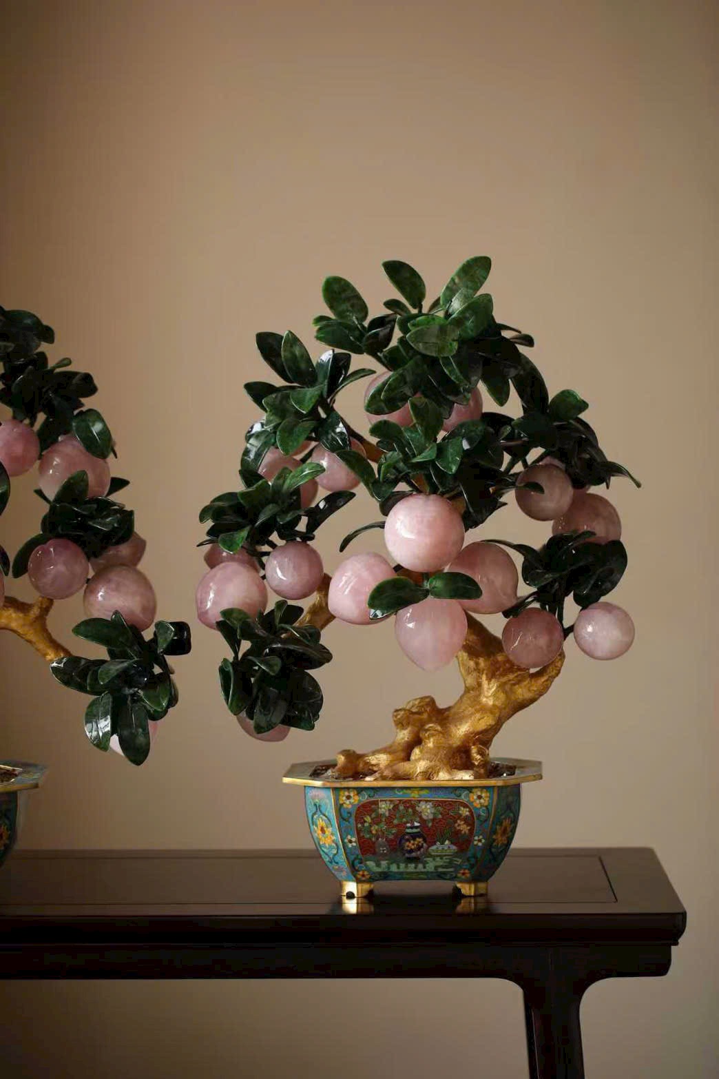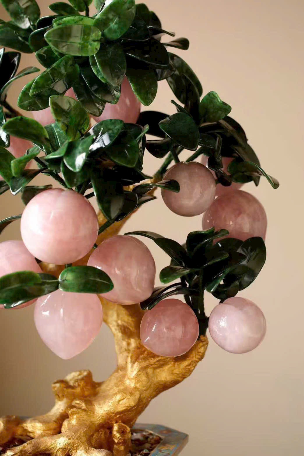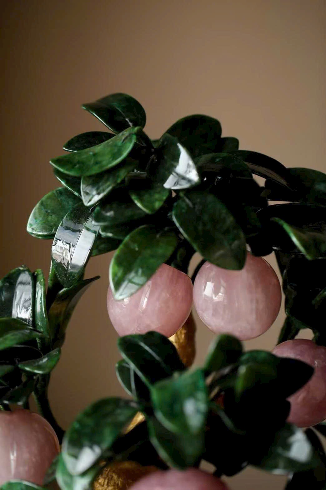 Những trái đào tiên được chạm khắc hoàn toàn từ ngọc thạch, hội tụ linh khí tự nhiên và tâm huyết của nghệ nhân, đặt trọn trong chậu Cảnh Thái Lam tinh xảo, tạo nên một tác phẩm bồn cảnh vừa thanh nhã, vừa cát tường, mang ý nghĩa trường thọ – phúc lành – viên mãn.
