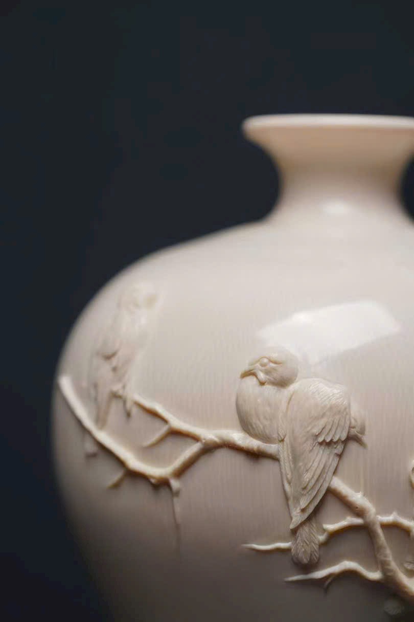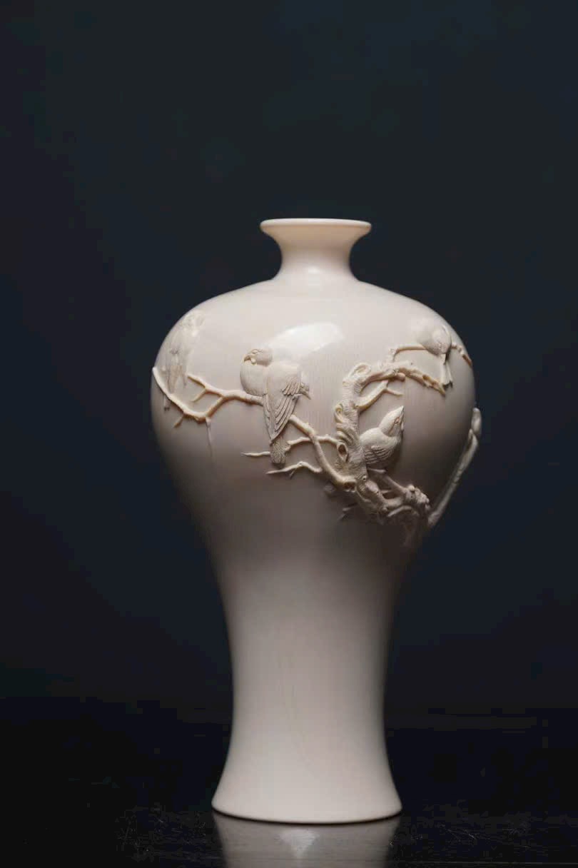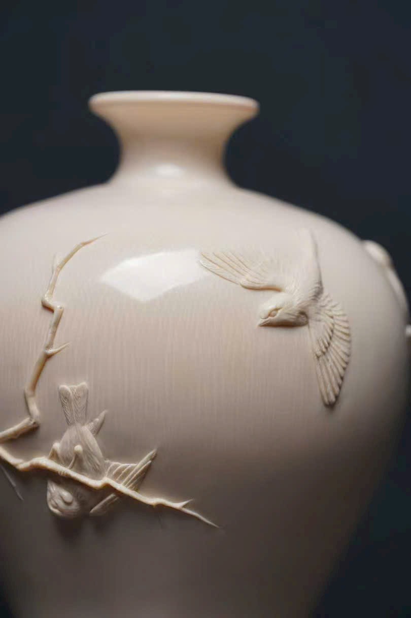 Bình hoa được chế tác tinh xảo, tỷ lệ hài hòa, đường nét thanh thoát; hoa mai nở rộ, từng cánh mềm mại tự nhiên, kết hợp cùng thân bình trơn bóng, tạo nên vẻ đẹp cao nhã mà sinh động.
