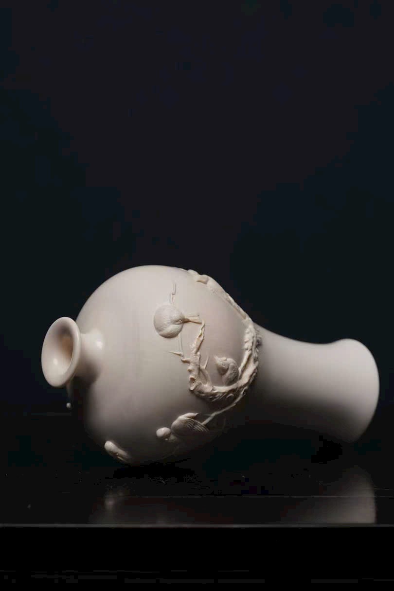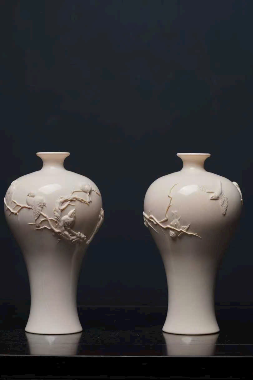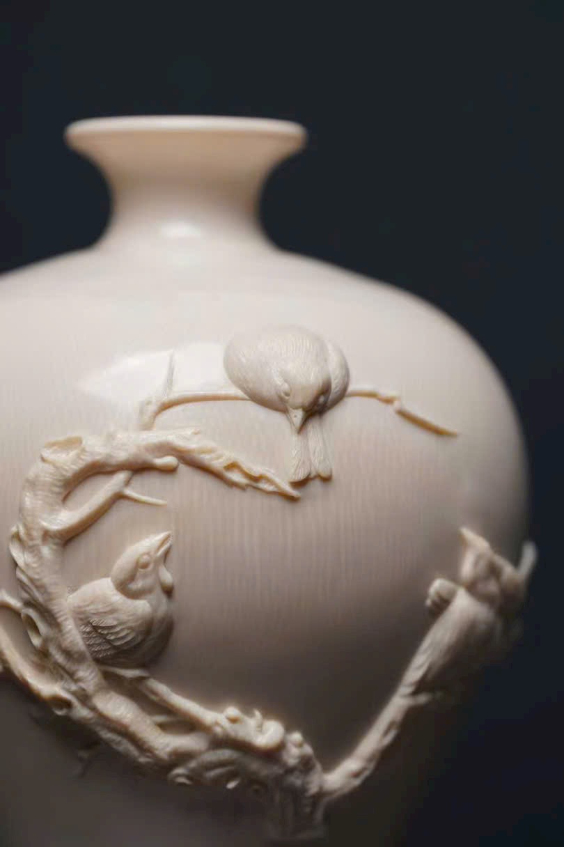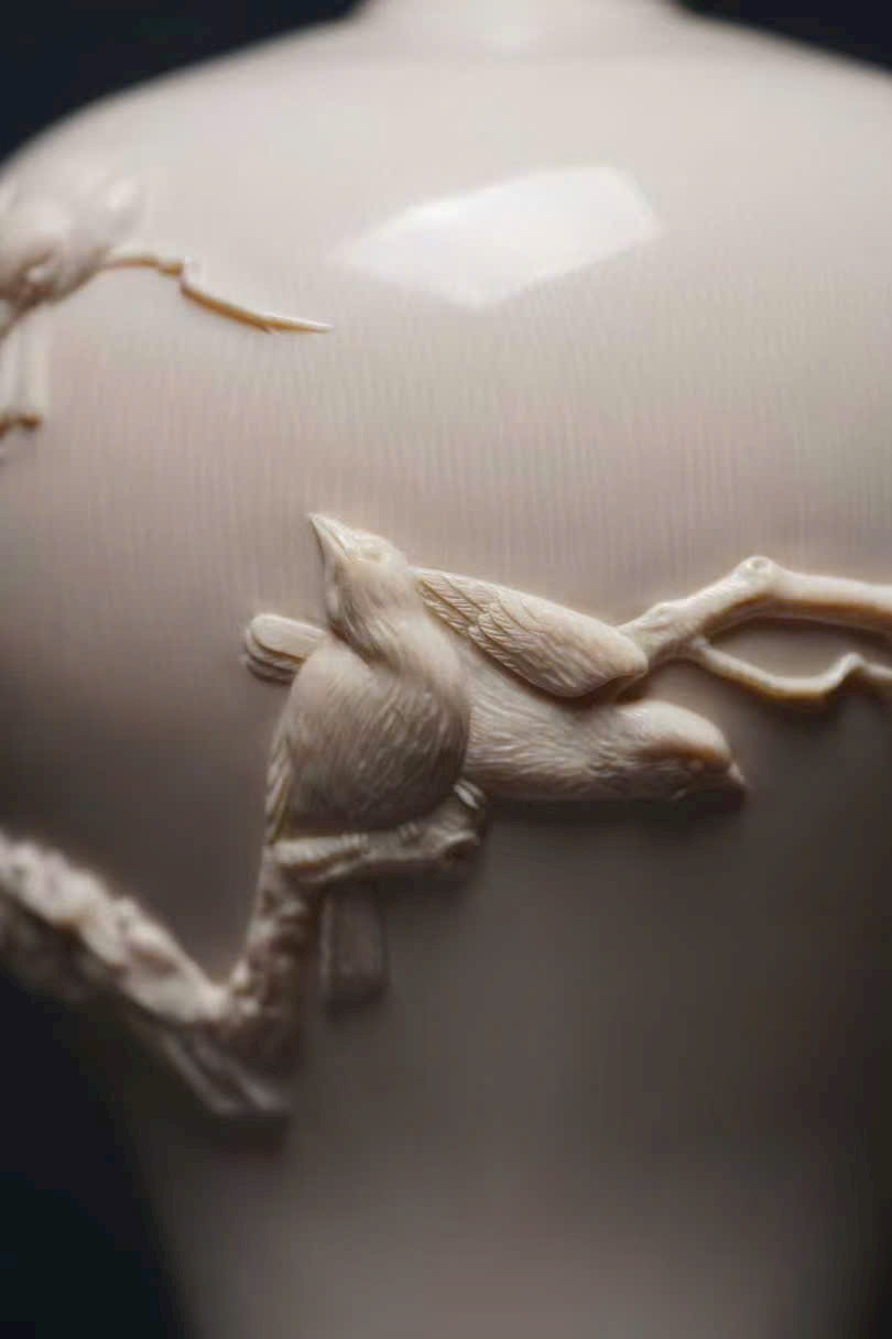 Bình hoa được chế tác tinh xảo, tỷ lệ hài hòa, đường nét thanh thoát; hoa mai nở rộ, từng cánh mềm mại tự nhiên, kết hợp cùng thân bình trơn bóng, tạo nên vẻ đẹp cao nhã mà sinh động.
