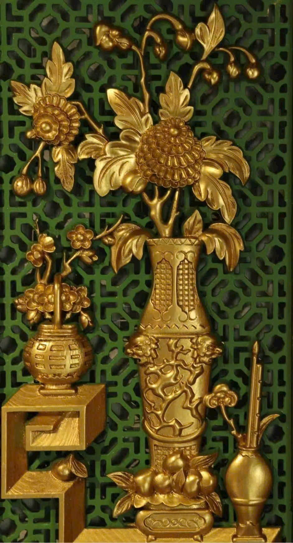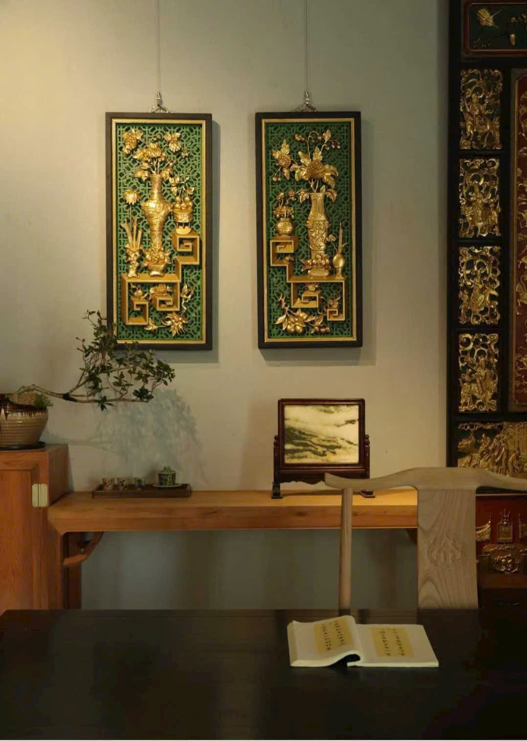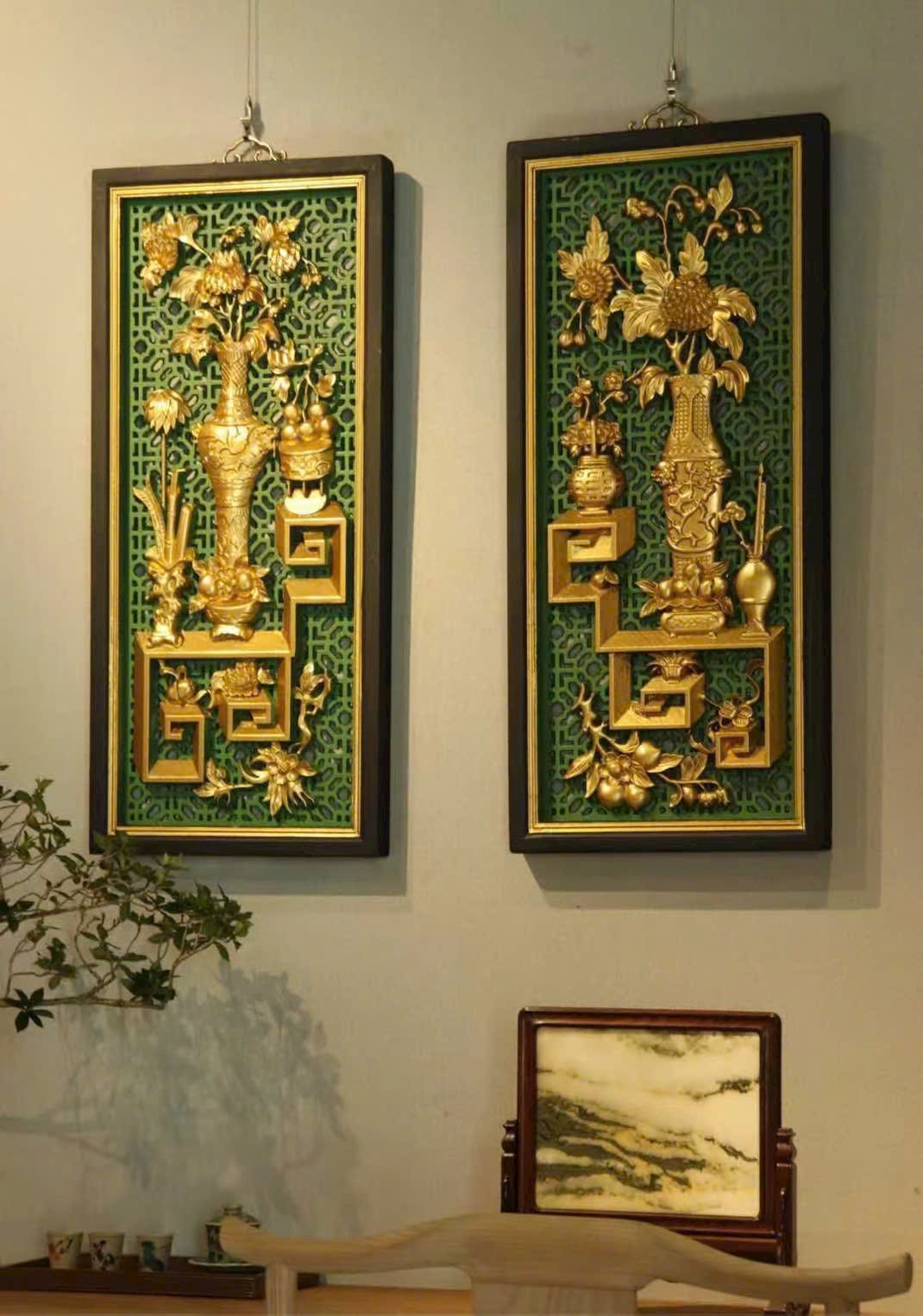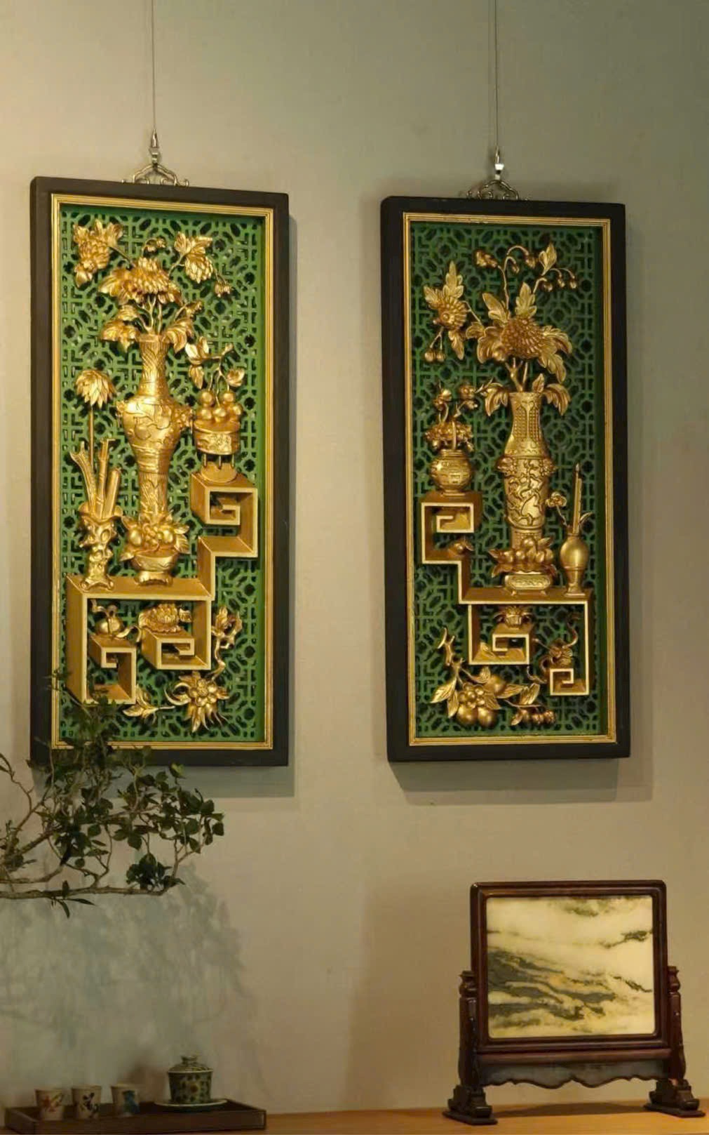 Một cặp ván hoa Bác cổ sơn son thếp vàng, hiệu quả trang trí nổi bật. Từ xưa đến nay, giới văn nhân mặc khách luôn say mê hoa văn Bác cổ – không chỉ thể hiện thẩm mỹ nho nhã mà còn là sự tự tin về nền tảng văn hóa. Bác cổ là một trong những đồ án cát tường truyền thống tiêu biểu, thường mang ý nghĩa may mắn, điềm lành.
