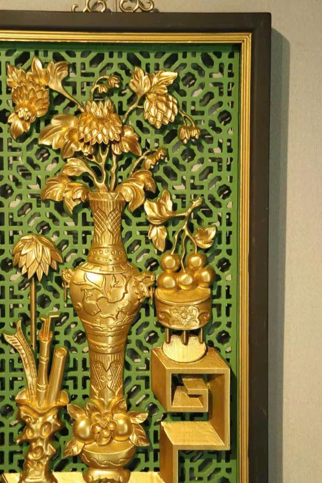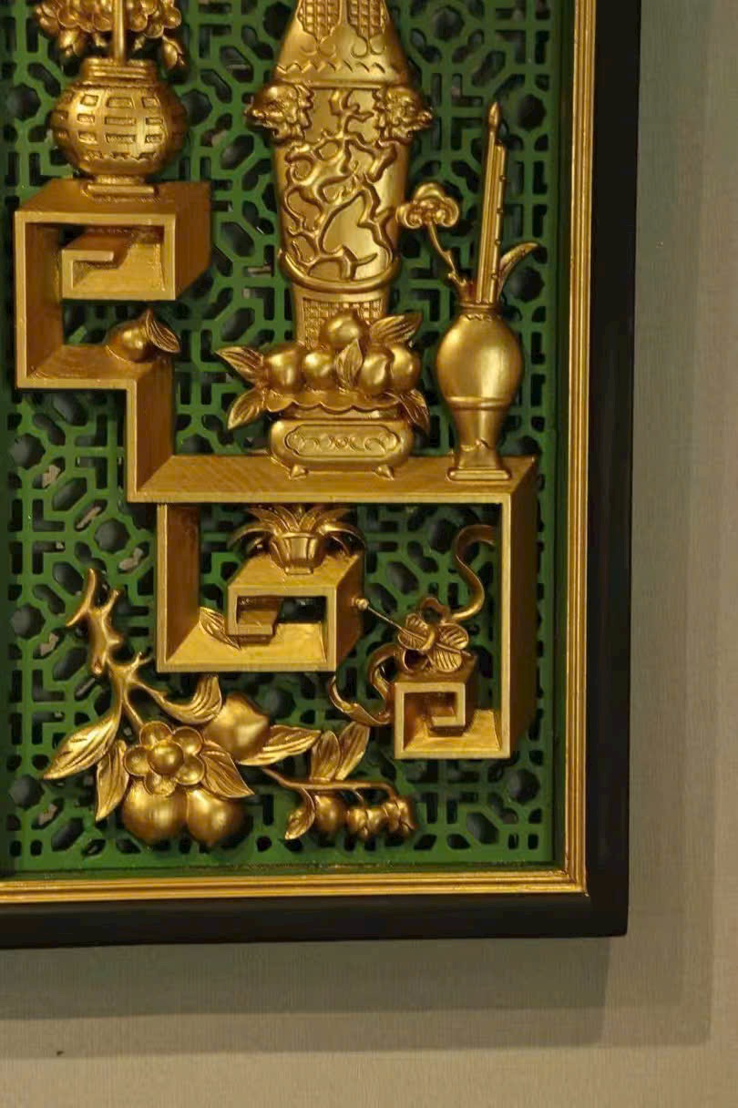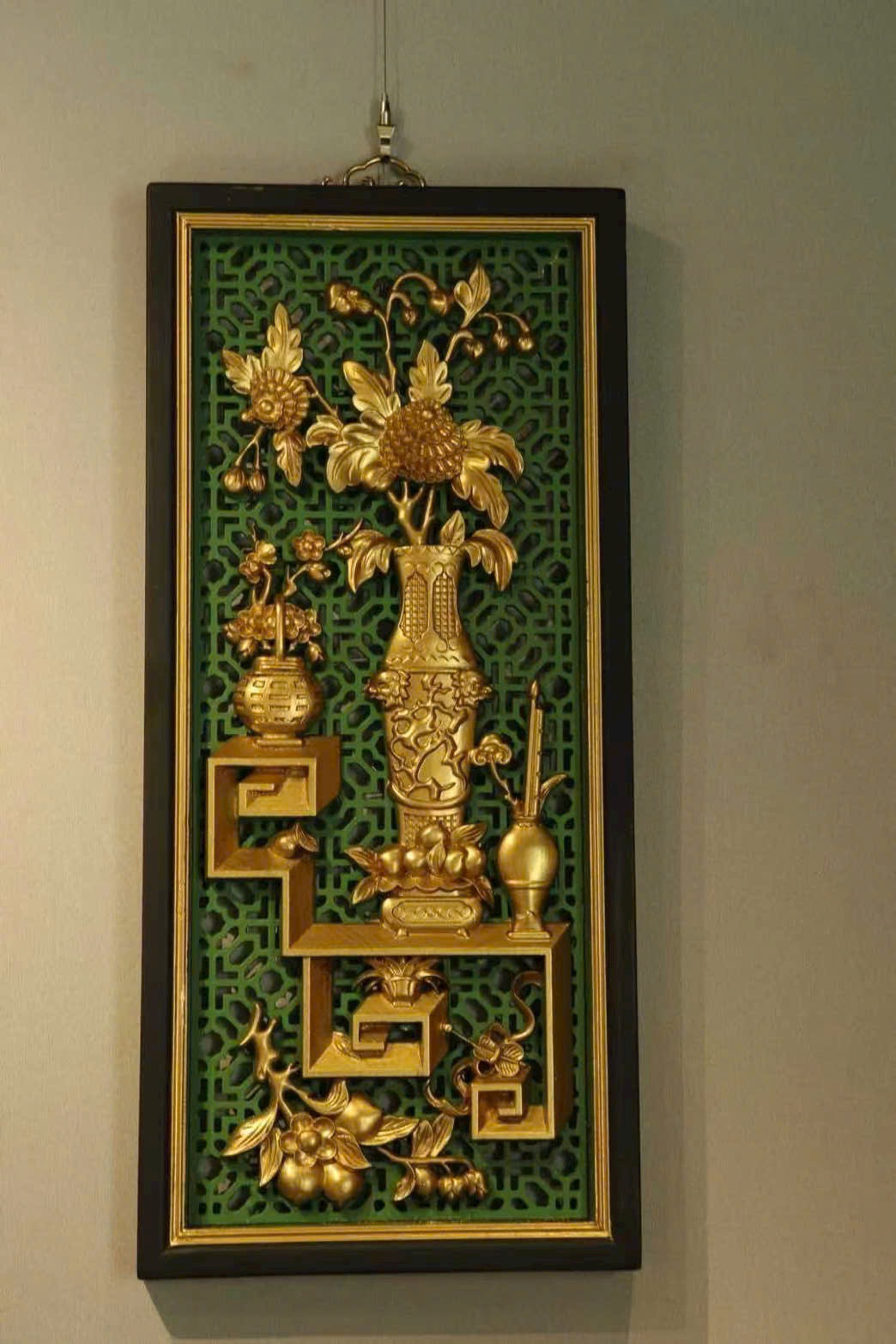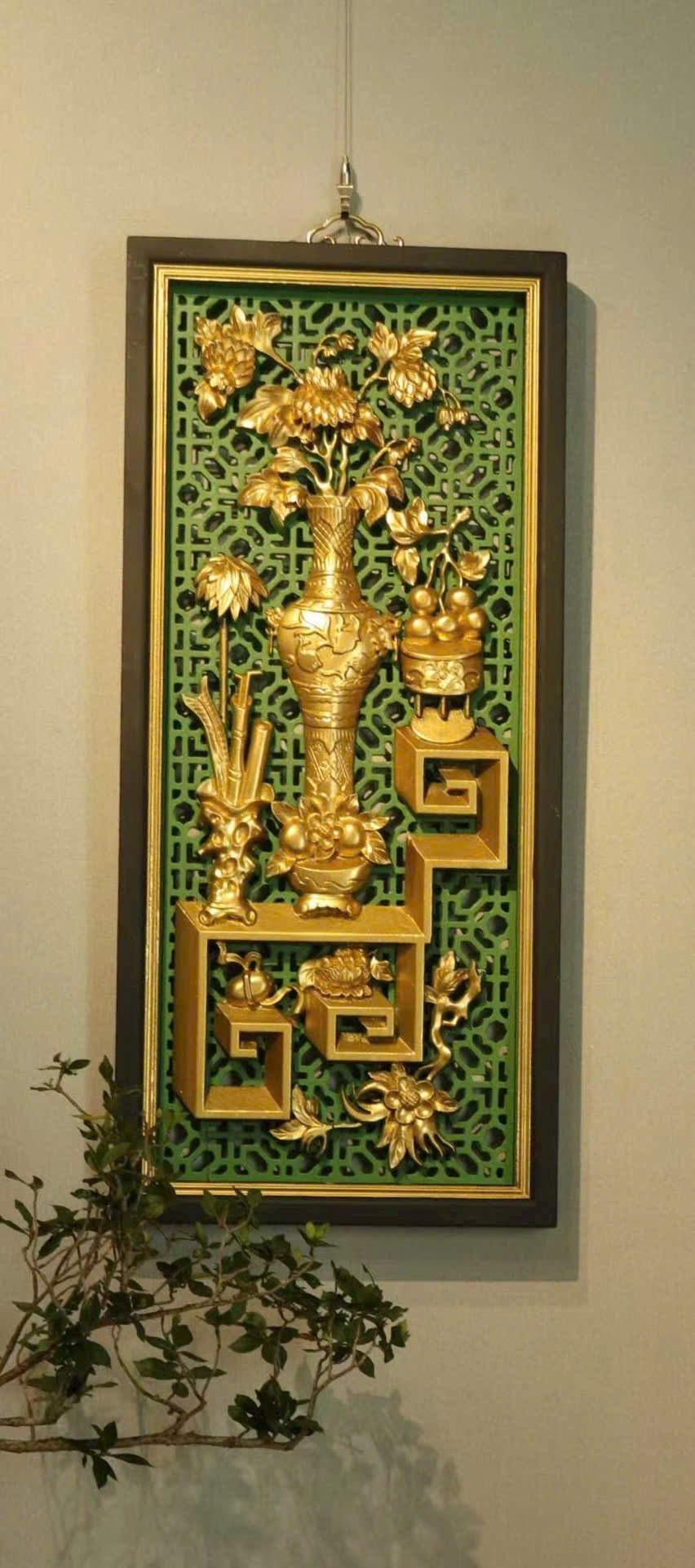 Bình phong treo hoa văn sơn son thếp vàng, treo tại sảnh đường, cổ phác nhã nhặn.
