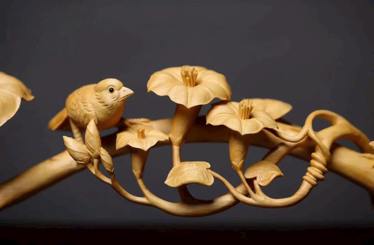 Hoa nở từng lớp, cánh bung mềm mại như tỏa hương. Dây leo uốn lượn tự nhiên, hai chú chim nhỏ sinh động, làm tăng vẻ tươi vui và sinh khí cho tác phẩm – tái hiện vẻ đẹp tự nhiên đầy thi vị.