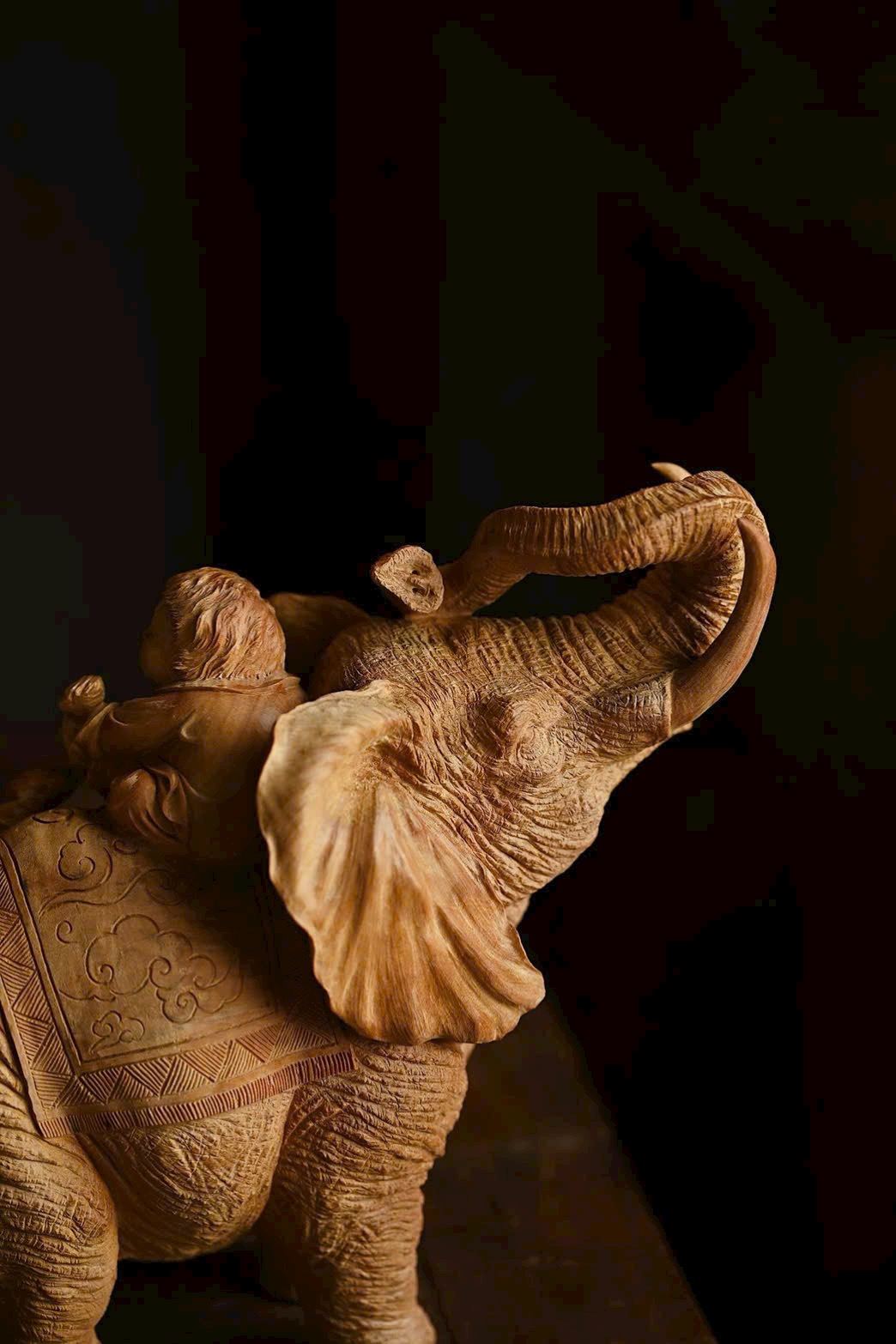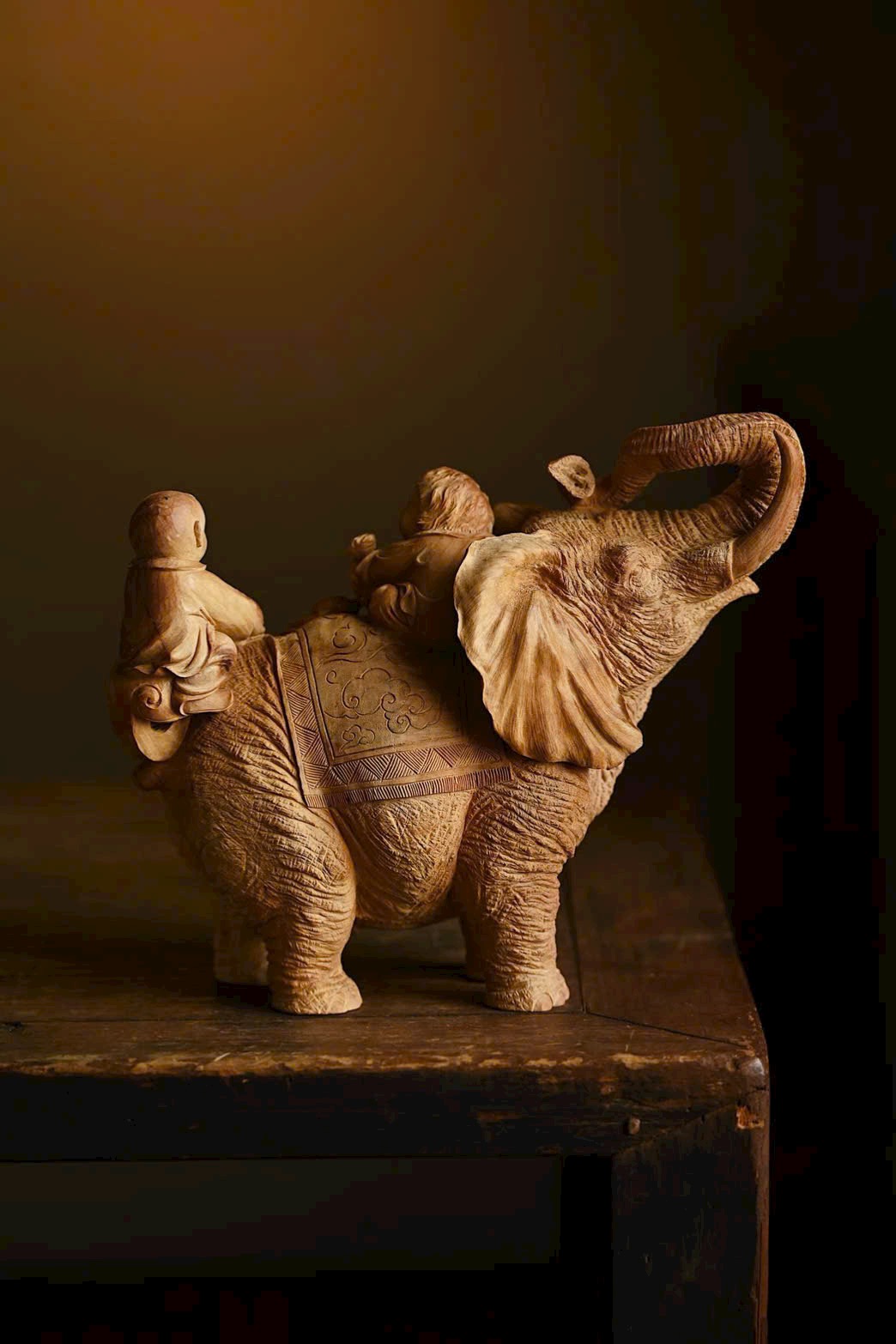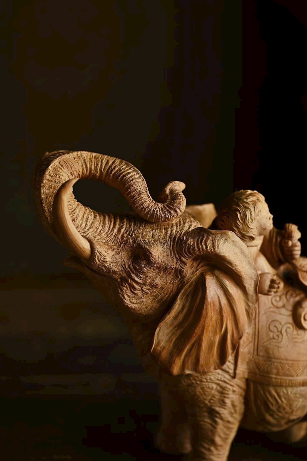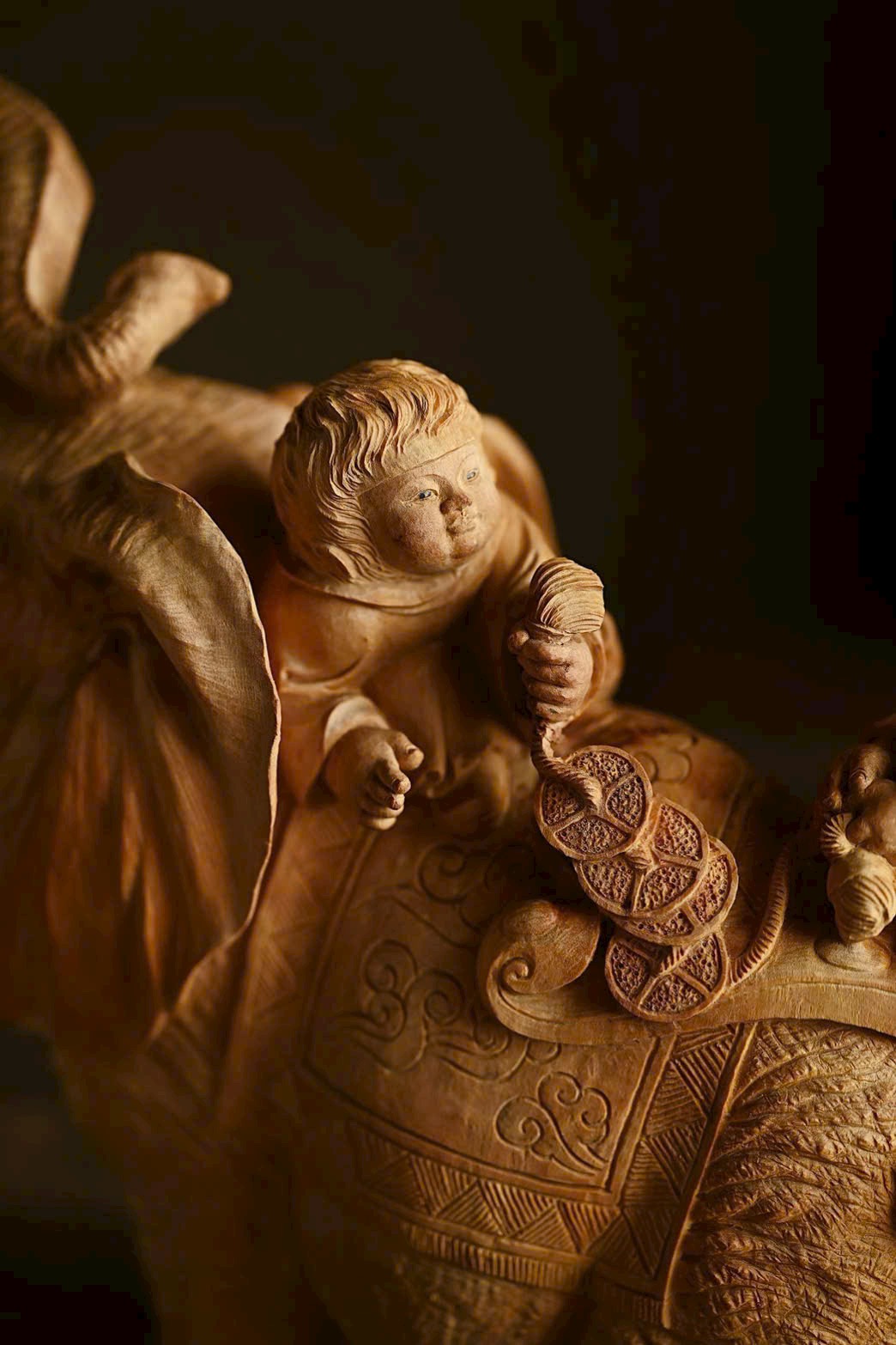 Tác phẩm được chạm khắc từ nguyên khối trầm hương Lão Sơn, chất liệu ấm áp, mịn màng. Điêu khắc sống động và nổi bật, voi cát tường ngà cong, đôi tai như quạt; thiếu nhi cầm xâu tiền, chân đạp như ý, biểu cảm khác nhau, hồn nhiên vui vẻ, tạo nên bức tranh sinh động và truyền cảm.
