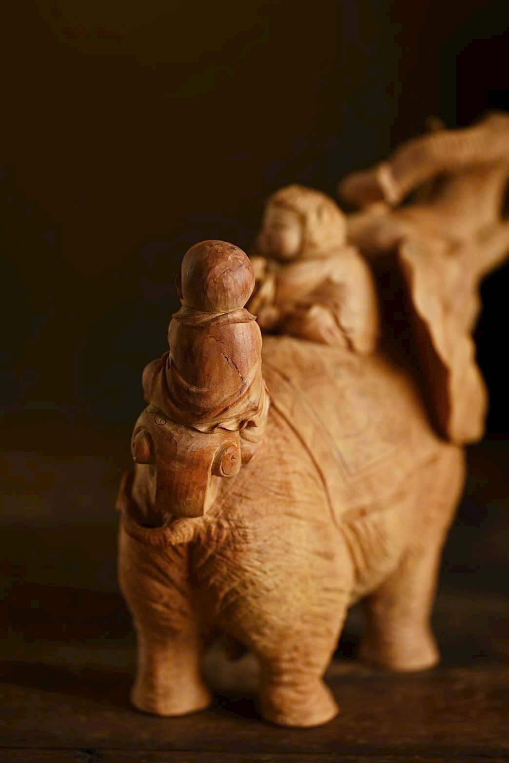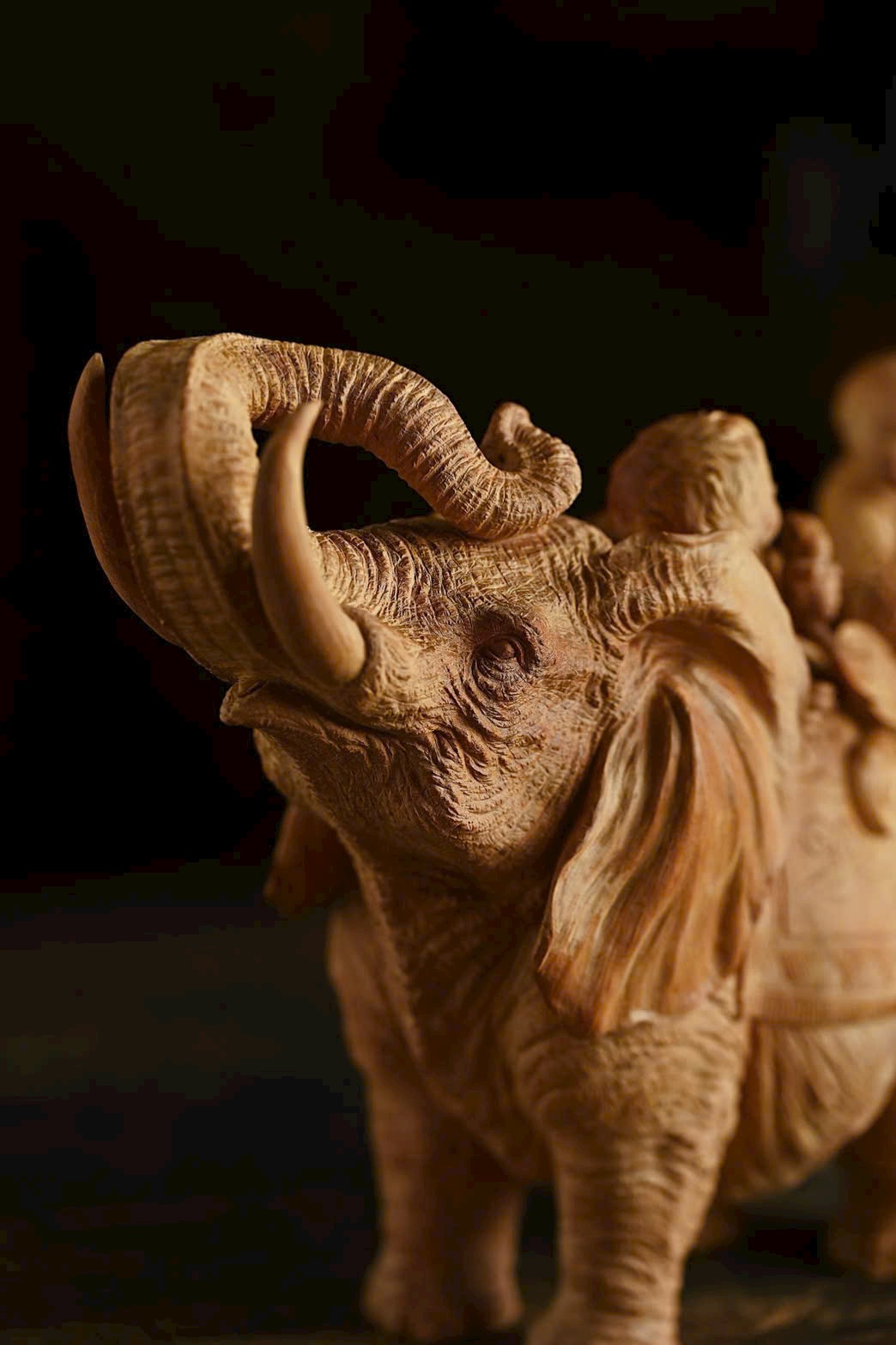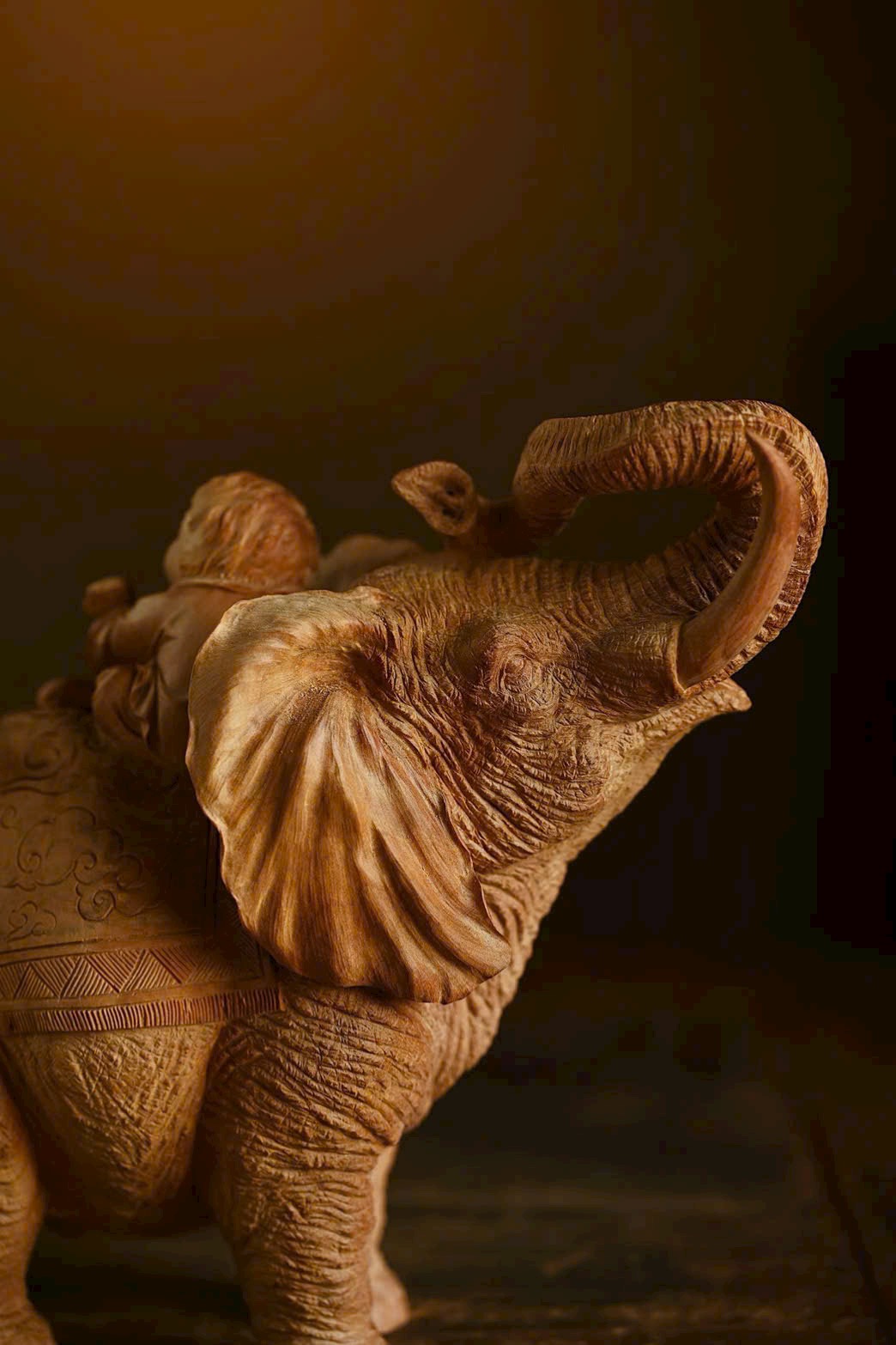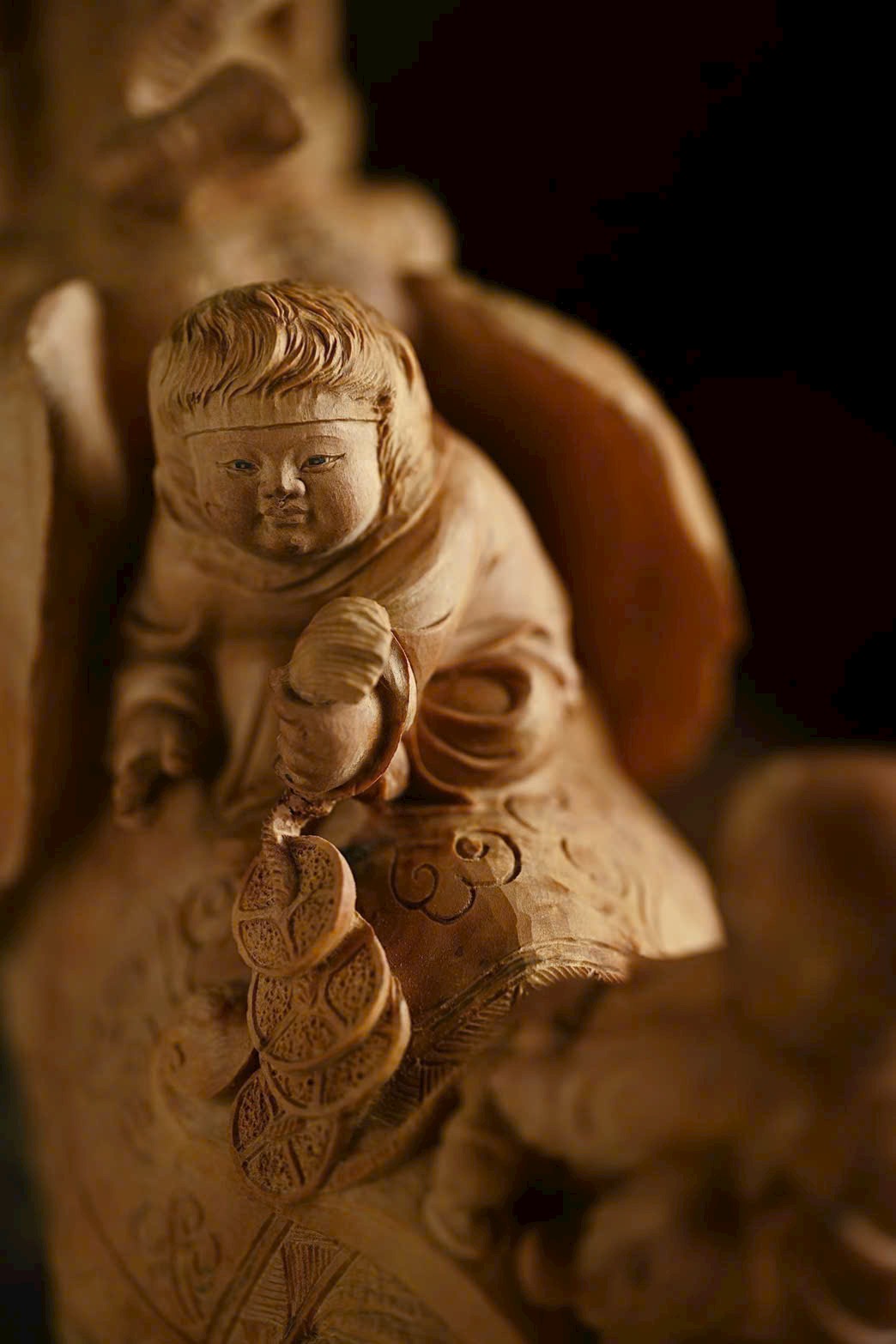 Tác phẩm được chạm khắc từ nguyên khối trầm hương Lão Sơn, chất liệu ấm áp, mịn màng. Điêu khắc sống động và nổi bật, voi cát tường ngà cong, đôi tai như quạt; thiếu nhi cầm xâu tiền, chân đạp như ý, biểu cảm khác nhau, hồn nhiên vui vẻ, tạo nên bức tranh sinh động và truyền cảm.