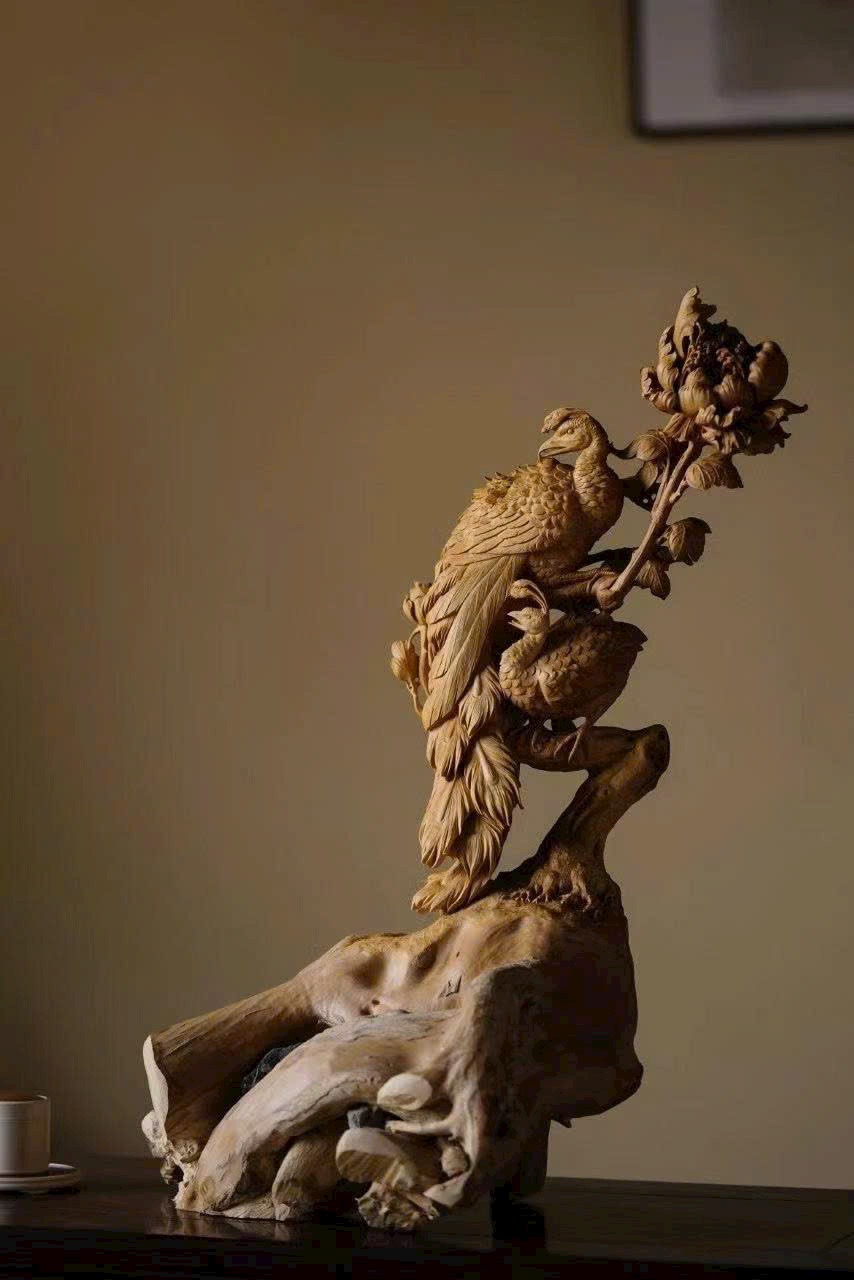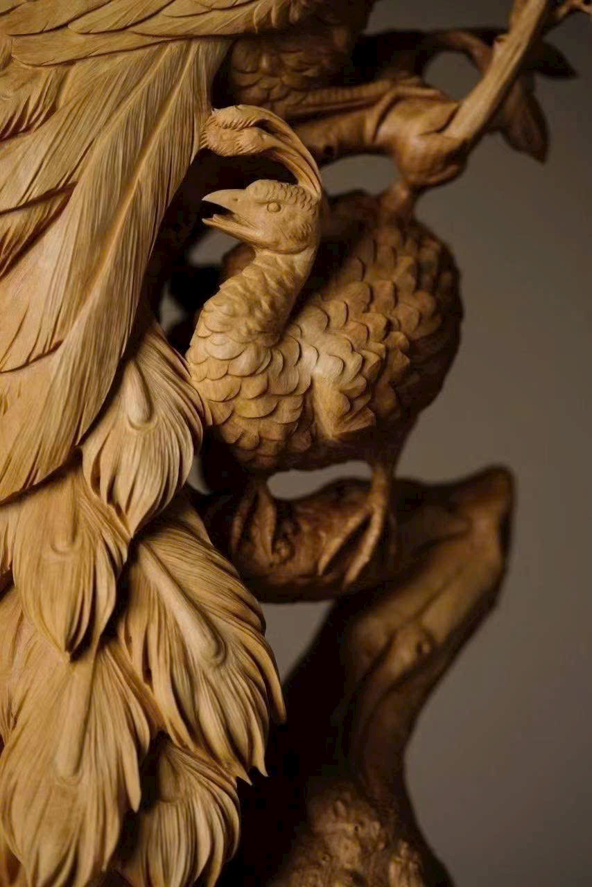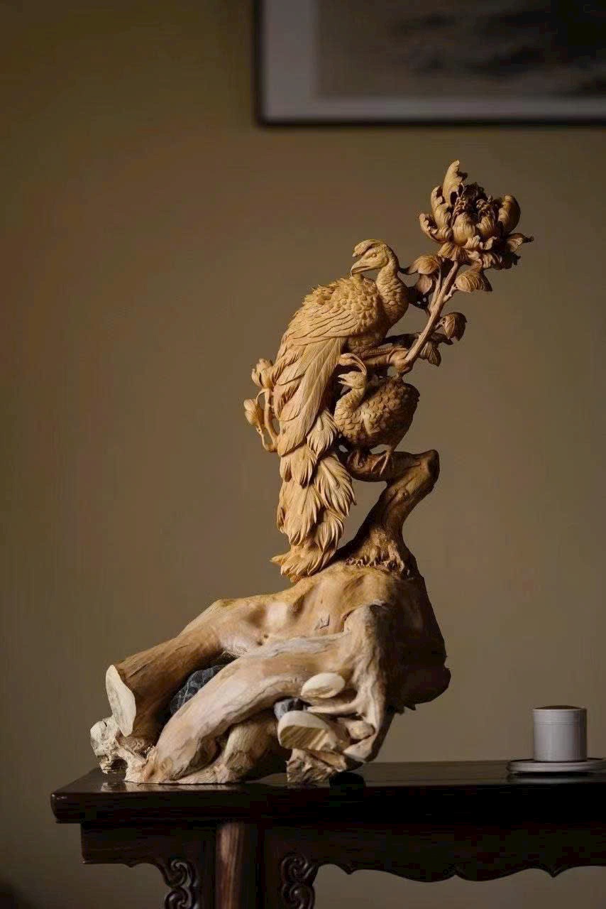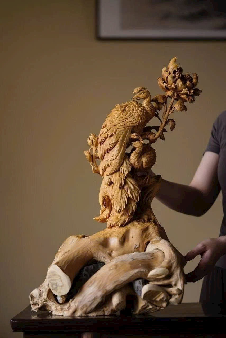 Gỗ màu mật ong, bóng sáng tự nhiên. Chim công nhẹ đậu giữa vườn hoa, đuôi xòe tầng tầng lớp lớp, hoa văn tinh xảo. Từng cánh lông, nhành hoa đều ẩn chứa ý nghĩa phú quý cát tường.