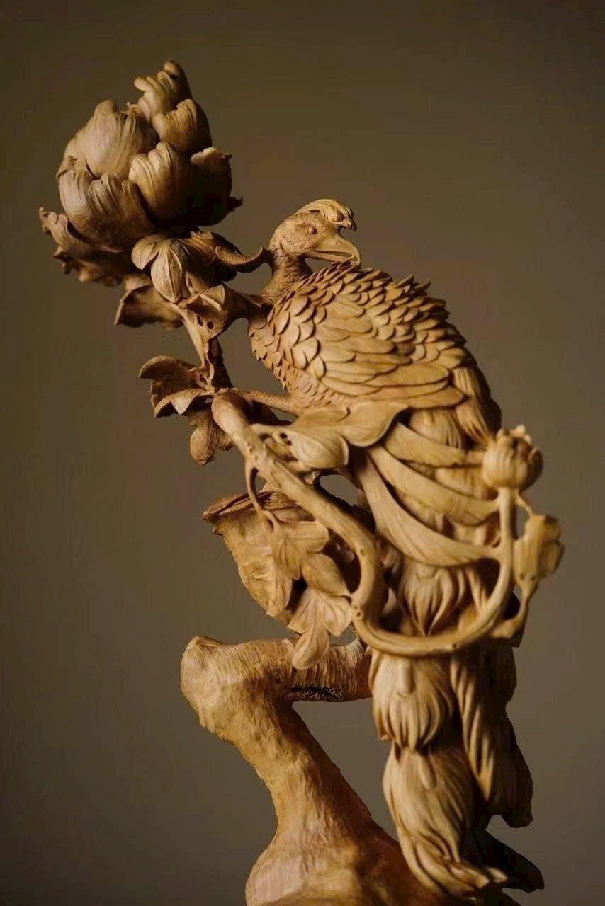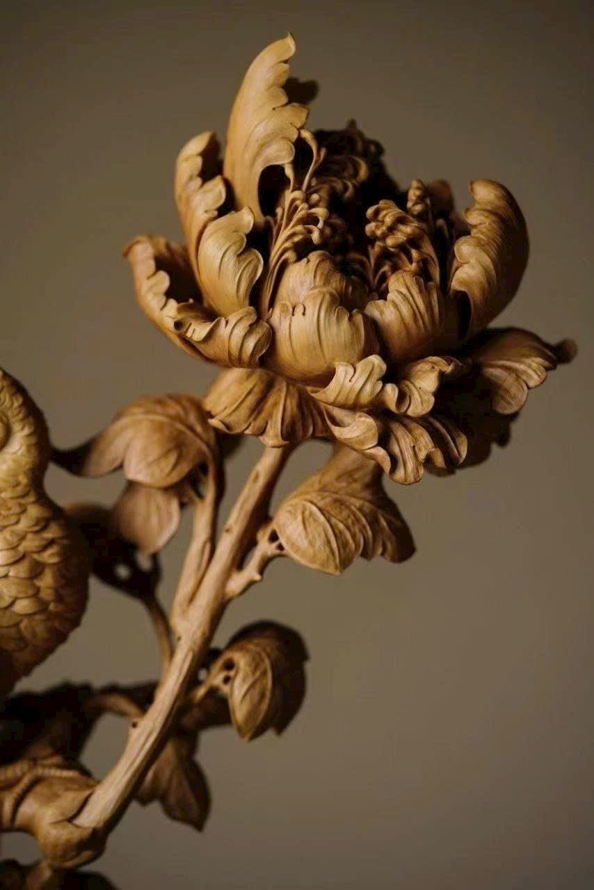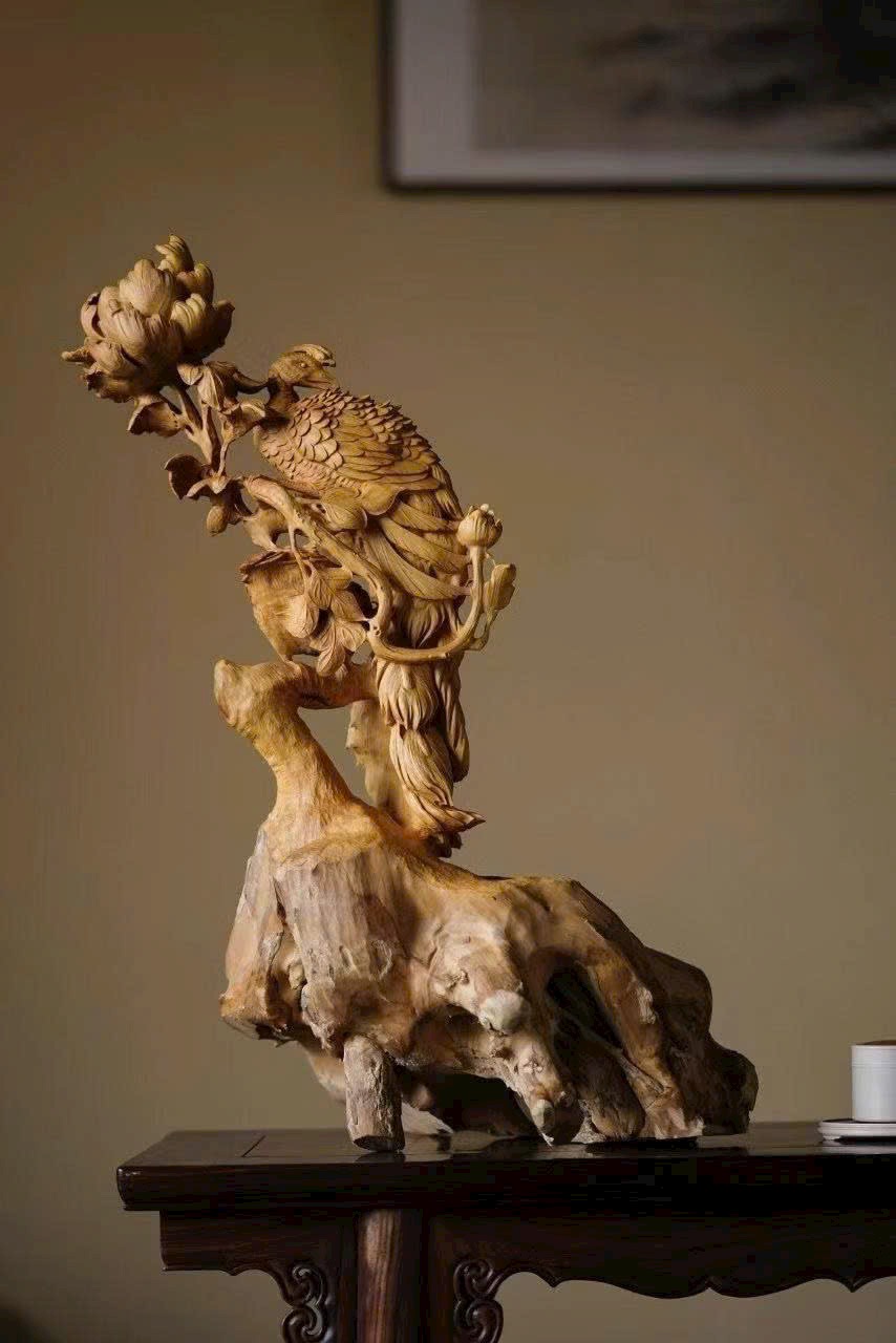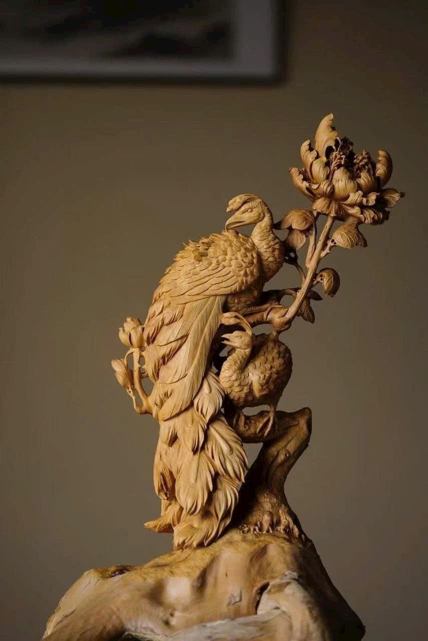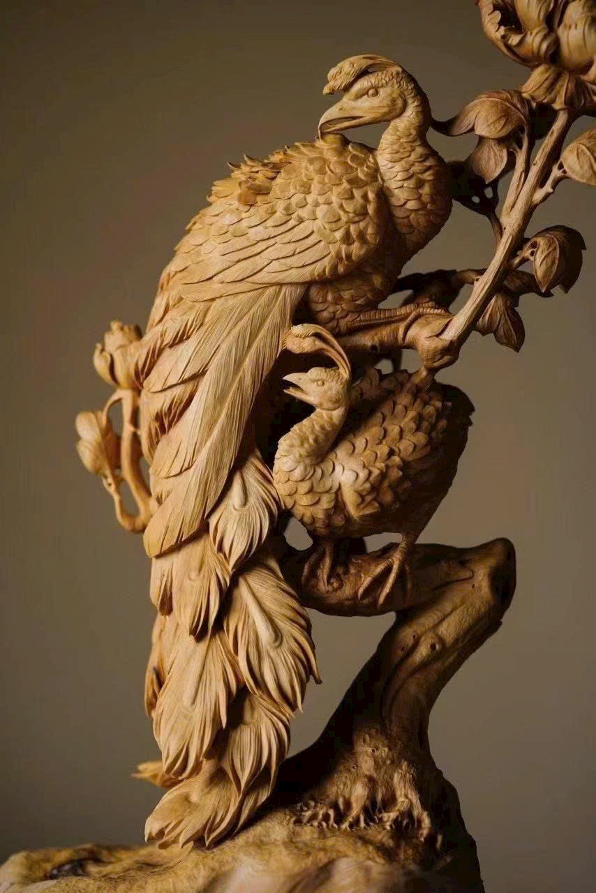 Gỗ màu mật ong, bóng sáng tự nhiên. Chim công nhẹ đậu giữa vườn hoa, đuôi xòe tầng tầng lớp lớp, hoa văn tinh xảo. Từng cánh lông, nhành hoa đều ẩn chứa ý nghĩa phú quý cát tường.