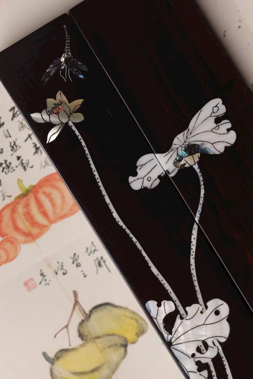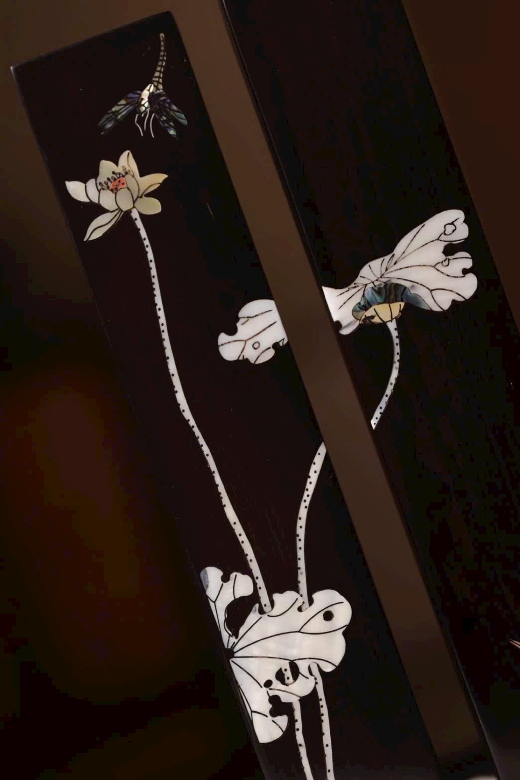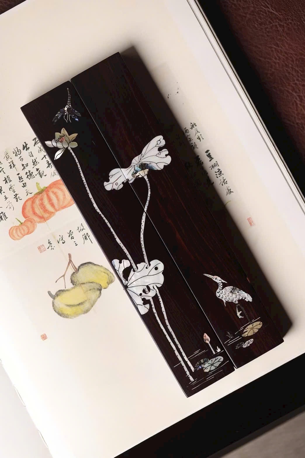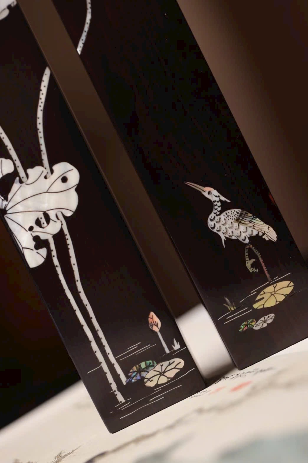 Khảm xà cừ tạo hình hoa sen và chim cò, lấp lánh rực rỡ.