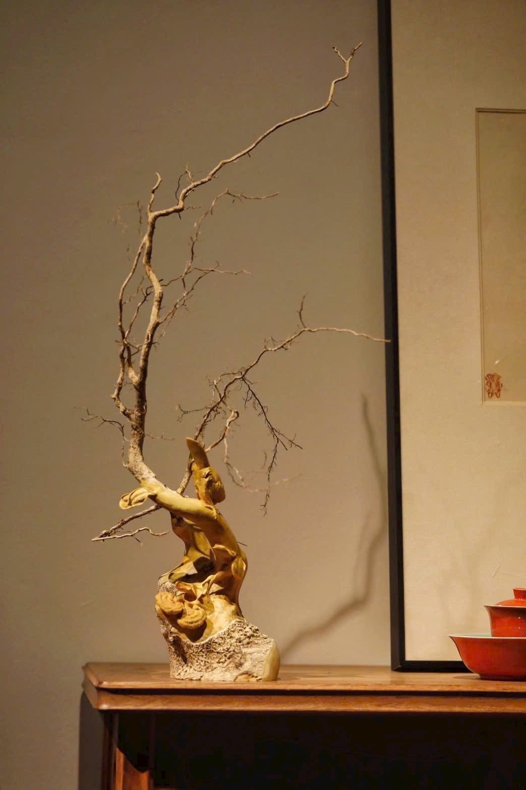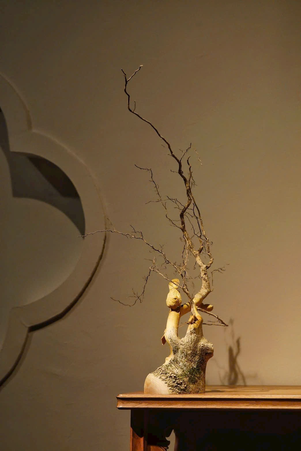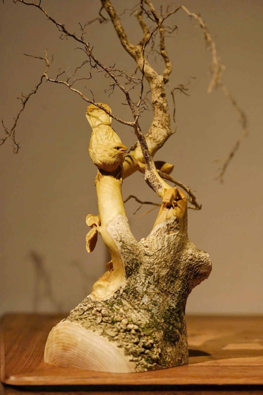 Toàn khối nguyên liệu được chạm theo dáng tự nhiên, tận dụng hình thế rễ gỗ uốn lượn sẵn có để tạo thành cành.