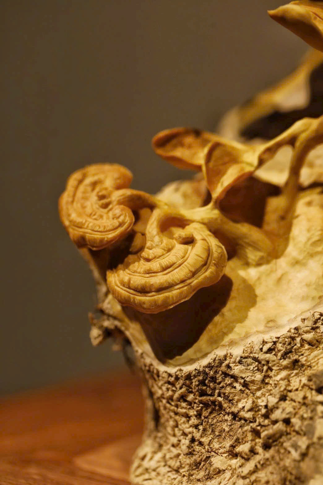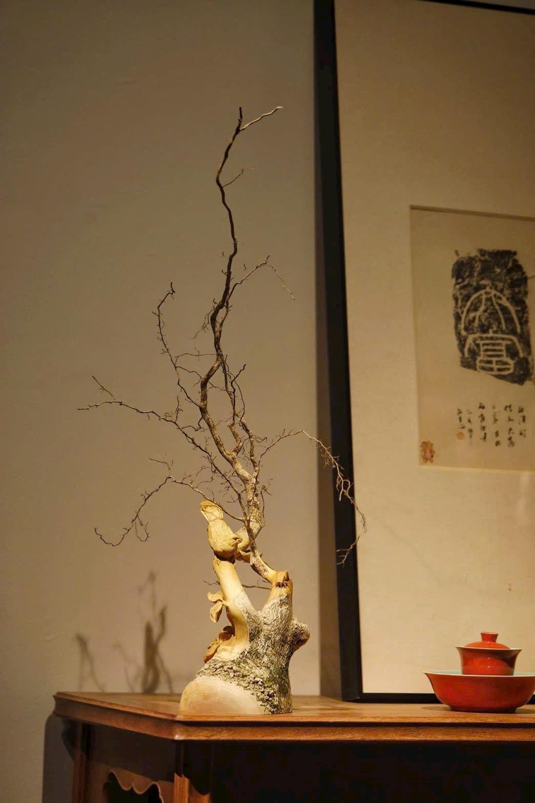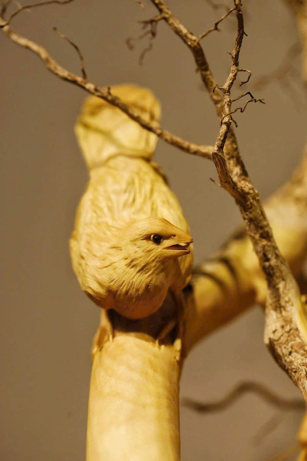 Toàn khối nguyên liệu được chạm theo dáng tự nhiên, tận dụng hình thế rễ gỗ uốn lượn sẵn có để tạo thành cành.