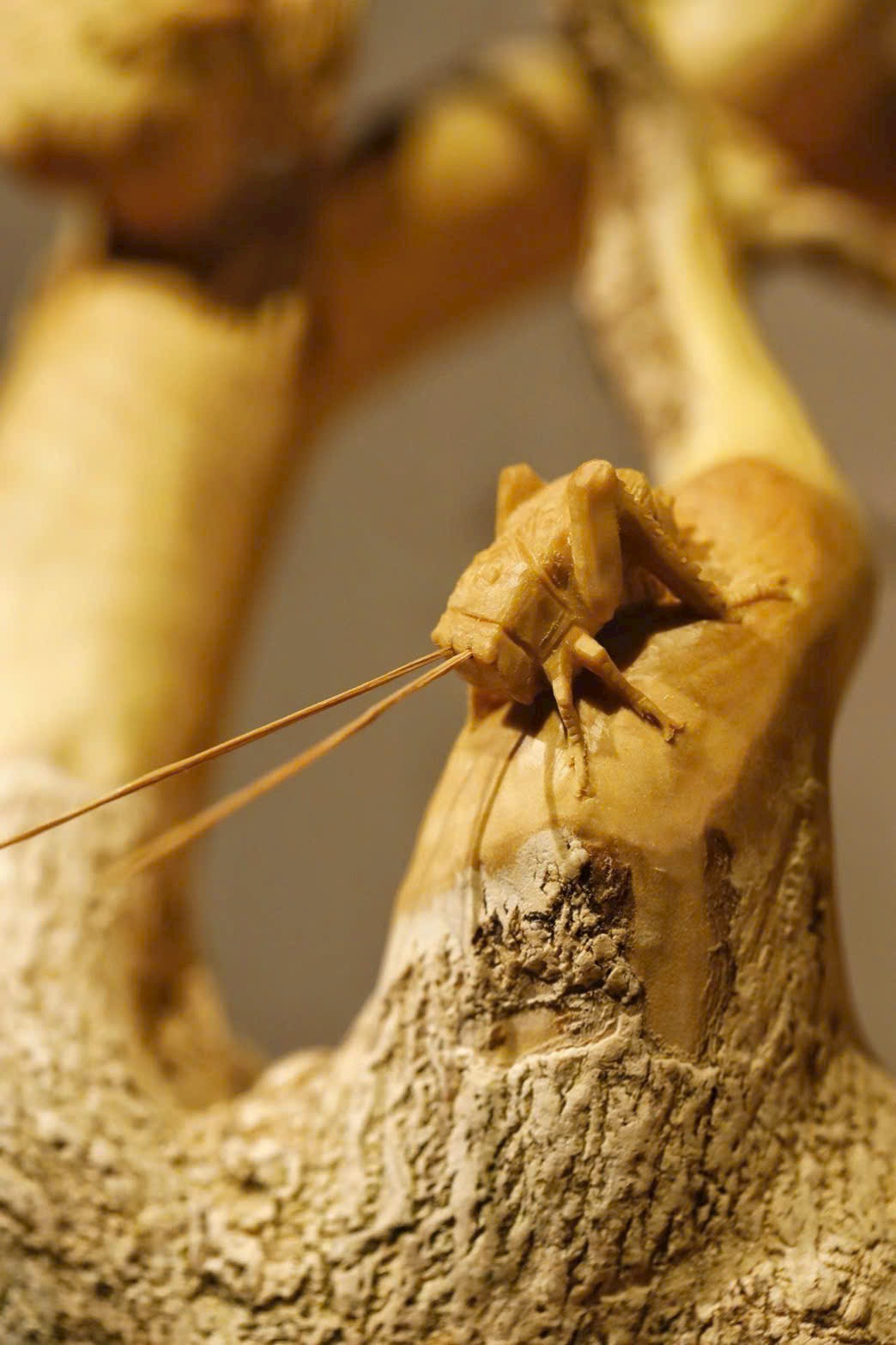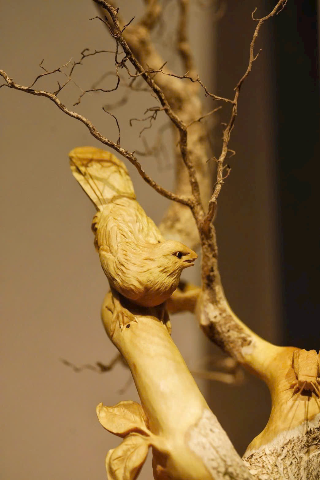Chim khách với đôi cánh mềm mại như thật, dế mang dáng vẻ linh động; khéo mượn thế gỗ để ẩn chứa thú vị hoang dã.