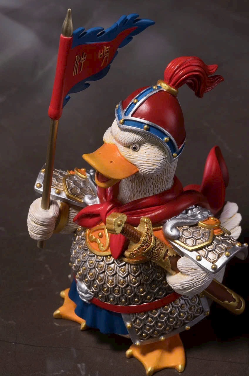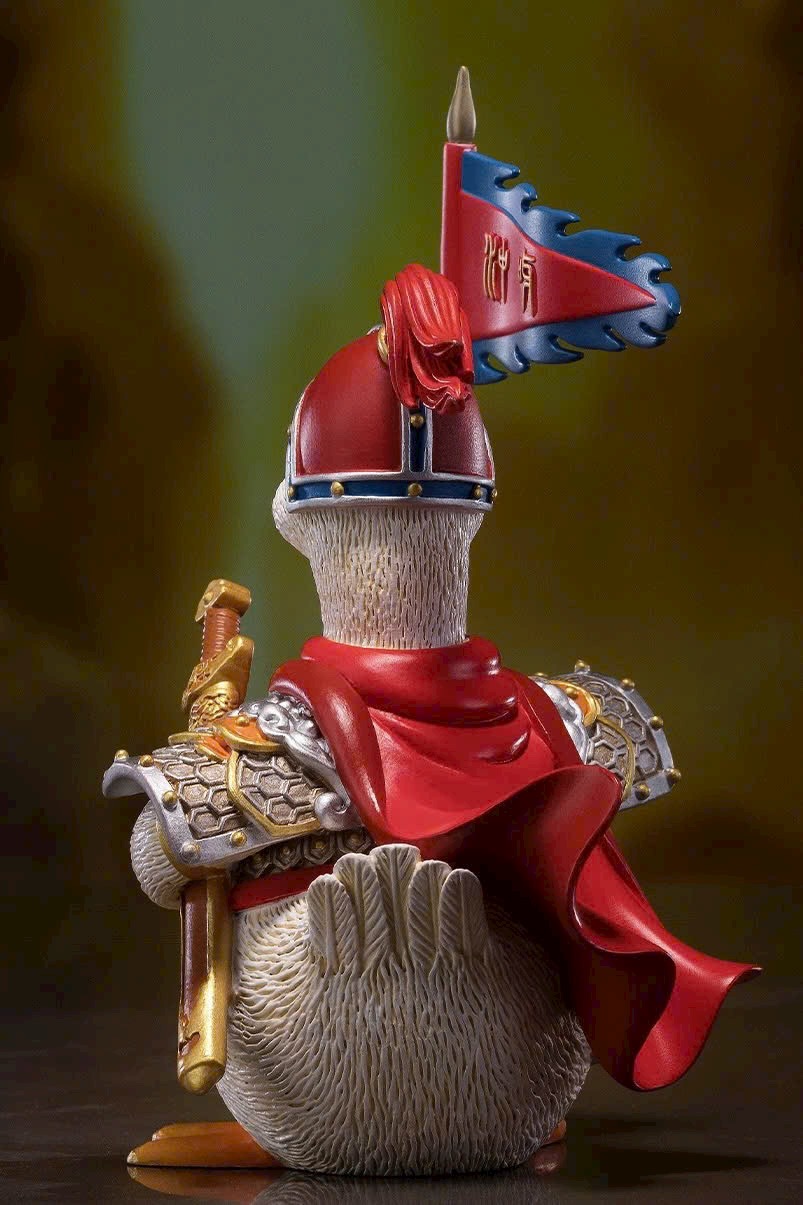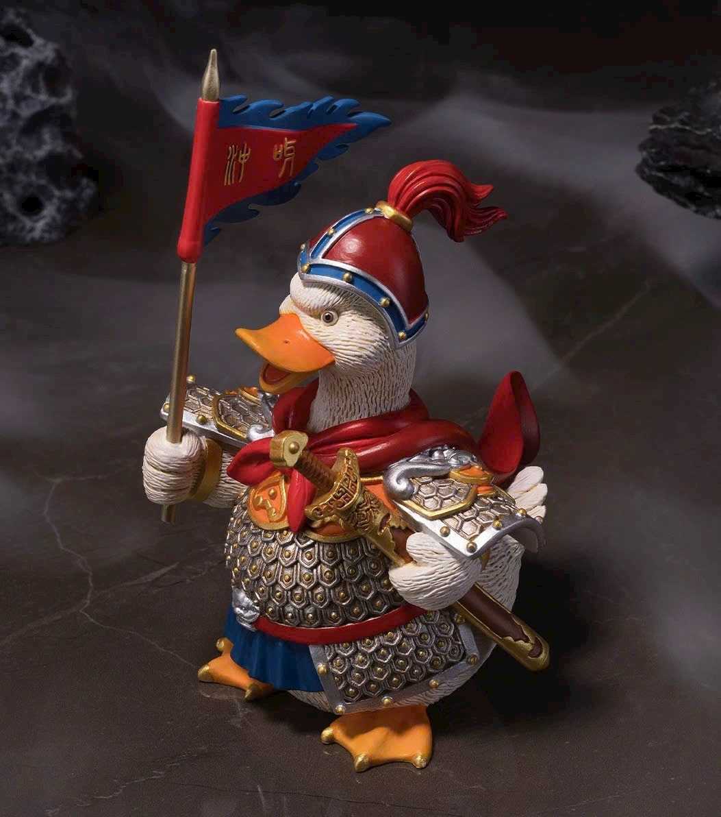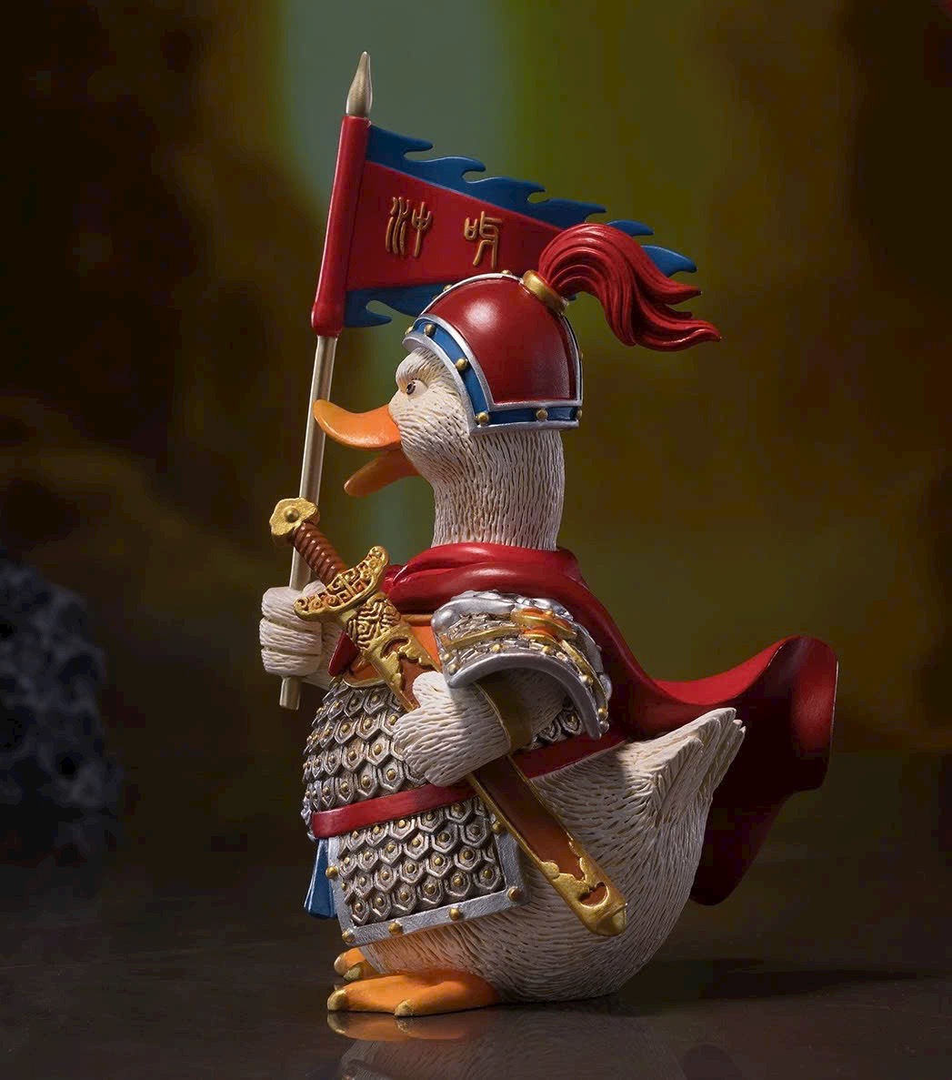Hình tượng chú vịt nhỏ tràn đầy sức sống, tinh thần chiến đấu hăng hái, khí thế hiên ngang; khoác áo giáp, tay cầm bảo kiếm, giương cao cờ lệnh và hô vang: Xông lên! 🦆⚔️🚩
