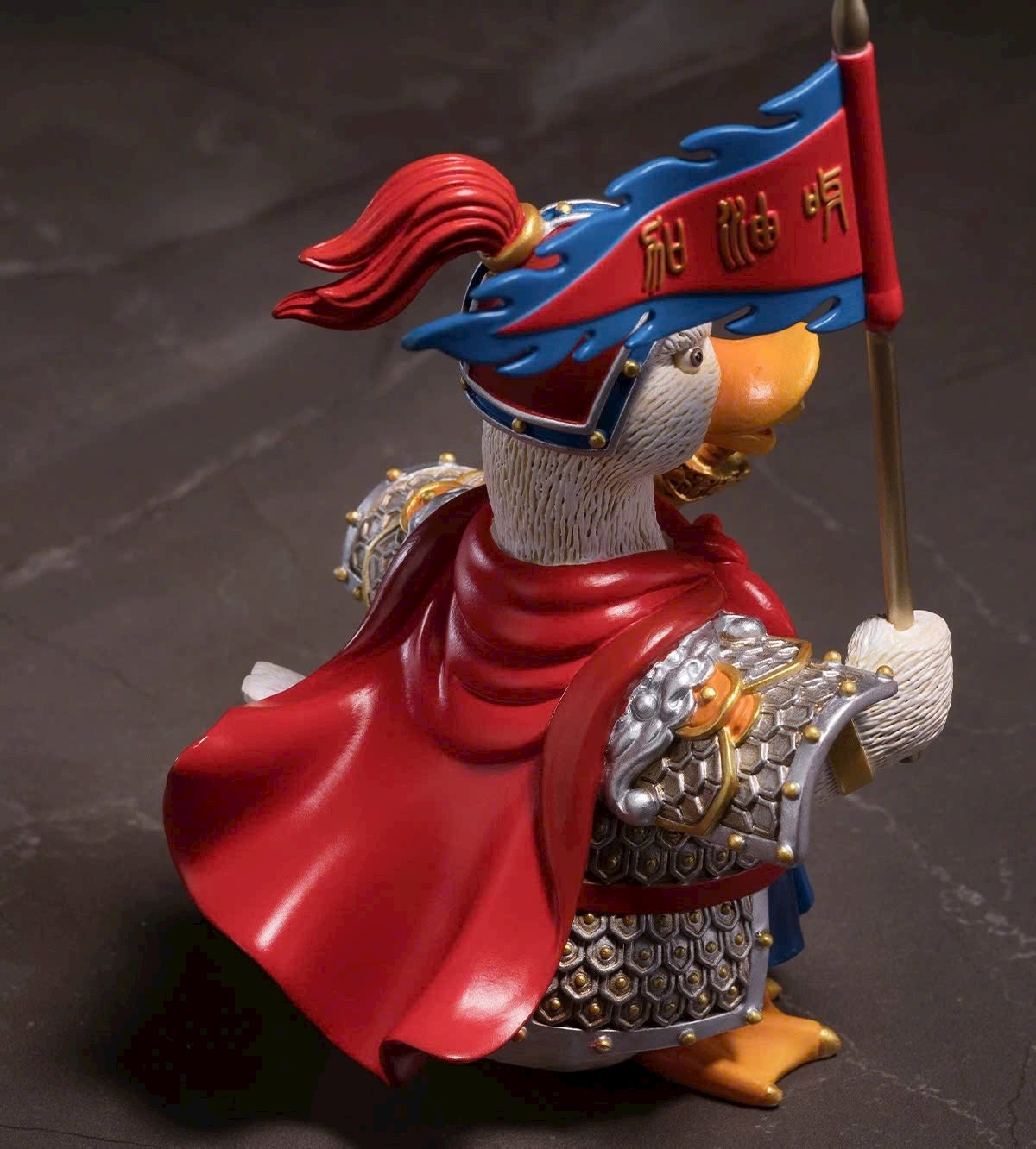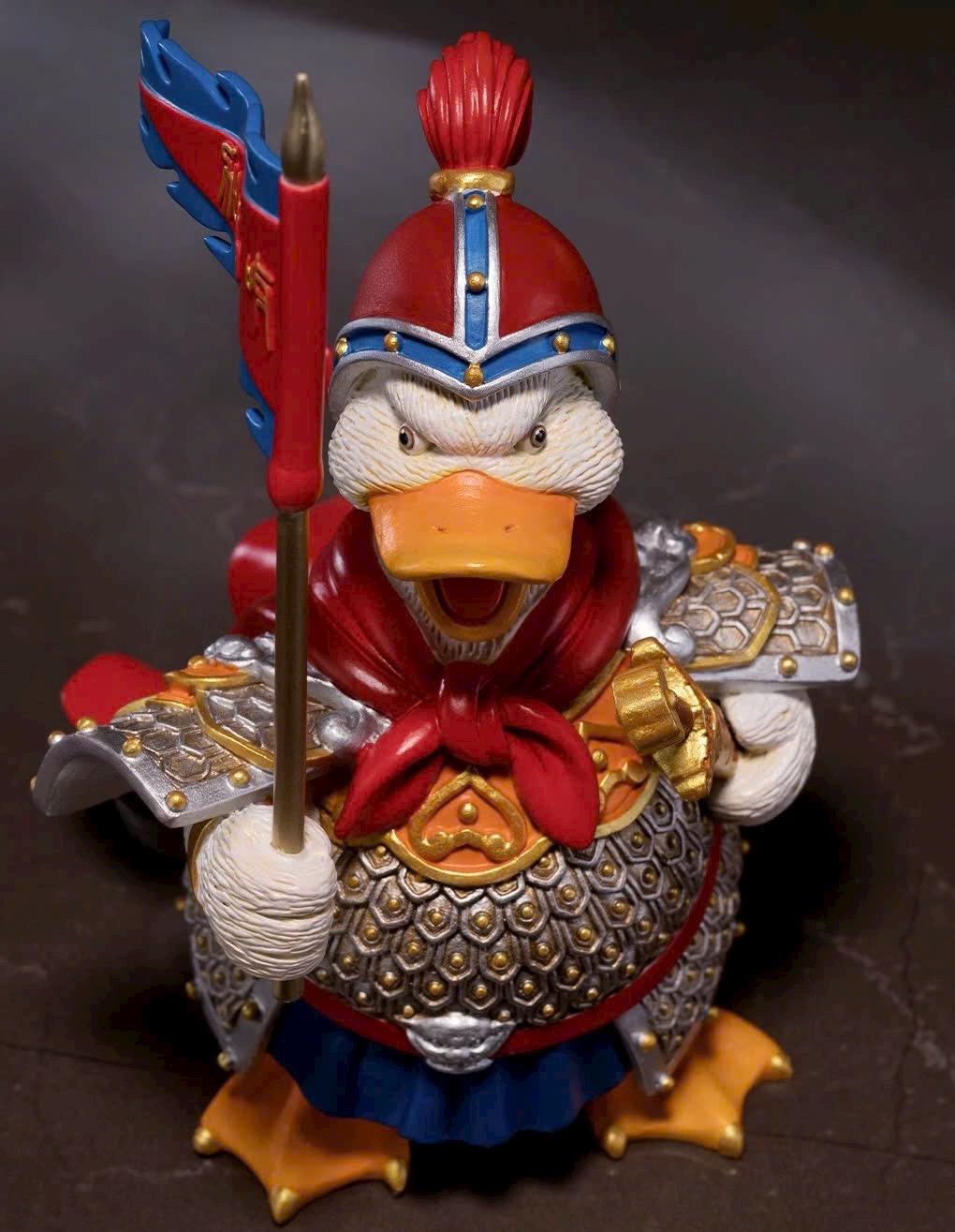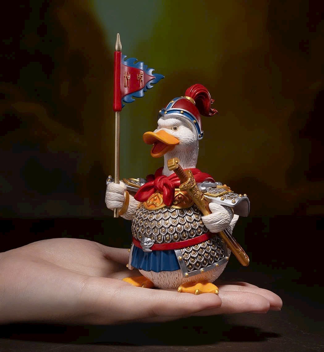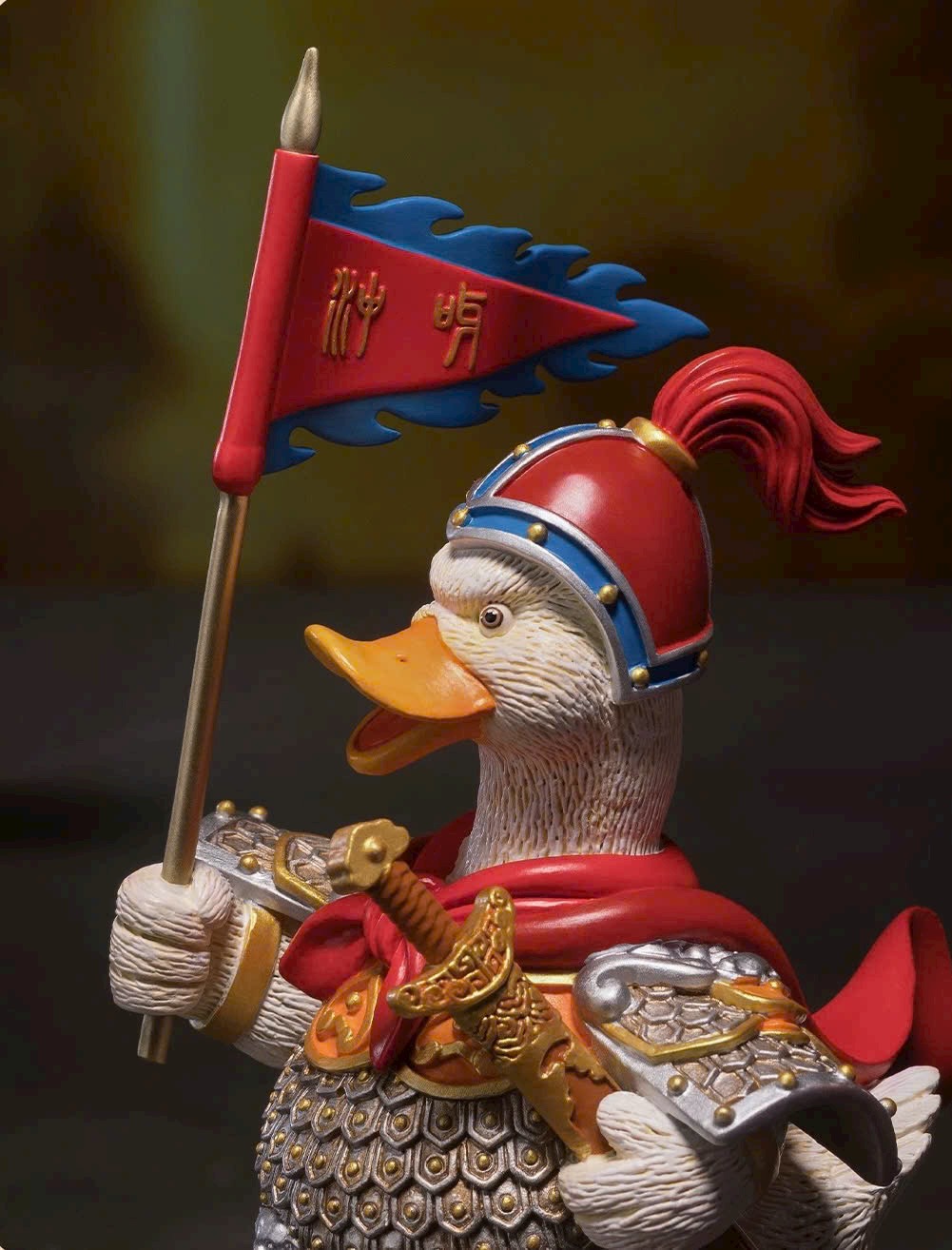 Hình tượng chú vịt nhỏ tràn đầy sức sống, tinh thần chiến đấu hăng hái, khí thế hiên ngang; khoác áo giáp, tay cầm bảo kiếm, giương cao cờ lệnh và hô vang: Xông lên! 🦆⚔️🚩
