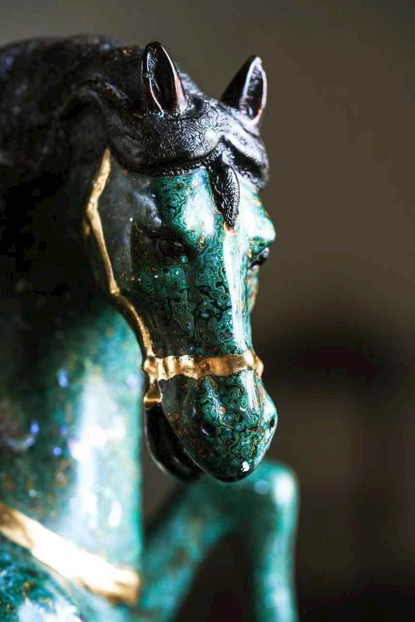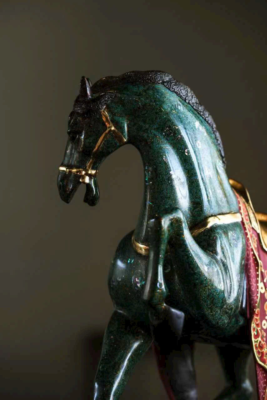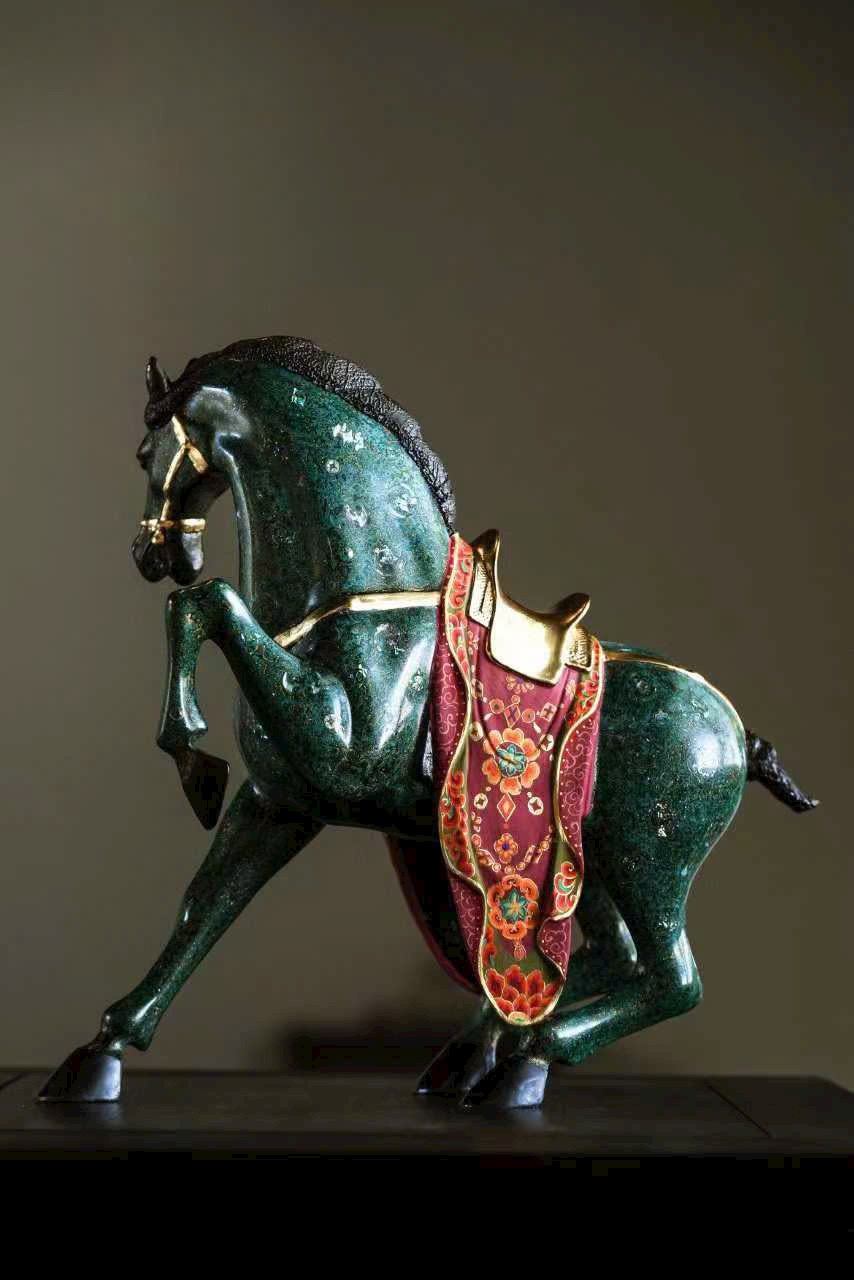 Lấy cảm hứng từ khí vận thịnh thế nhà Đường, chiến mã mang dáng vẻ đầy đặn, uy nghi và mạnh mẽ, như bước ra từ Trường An xưa. Thân ngựa đúc bằng đồng thau theo kỹ thuật đúc sáp thất truyền cổ pháp, đường nét sống động, bờm và cơ thể đều ẩn chứa tinh thần thủ công tinh tế của thời Thịnh Đường.