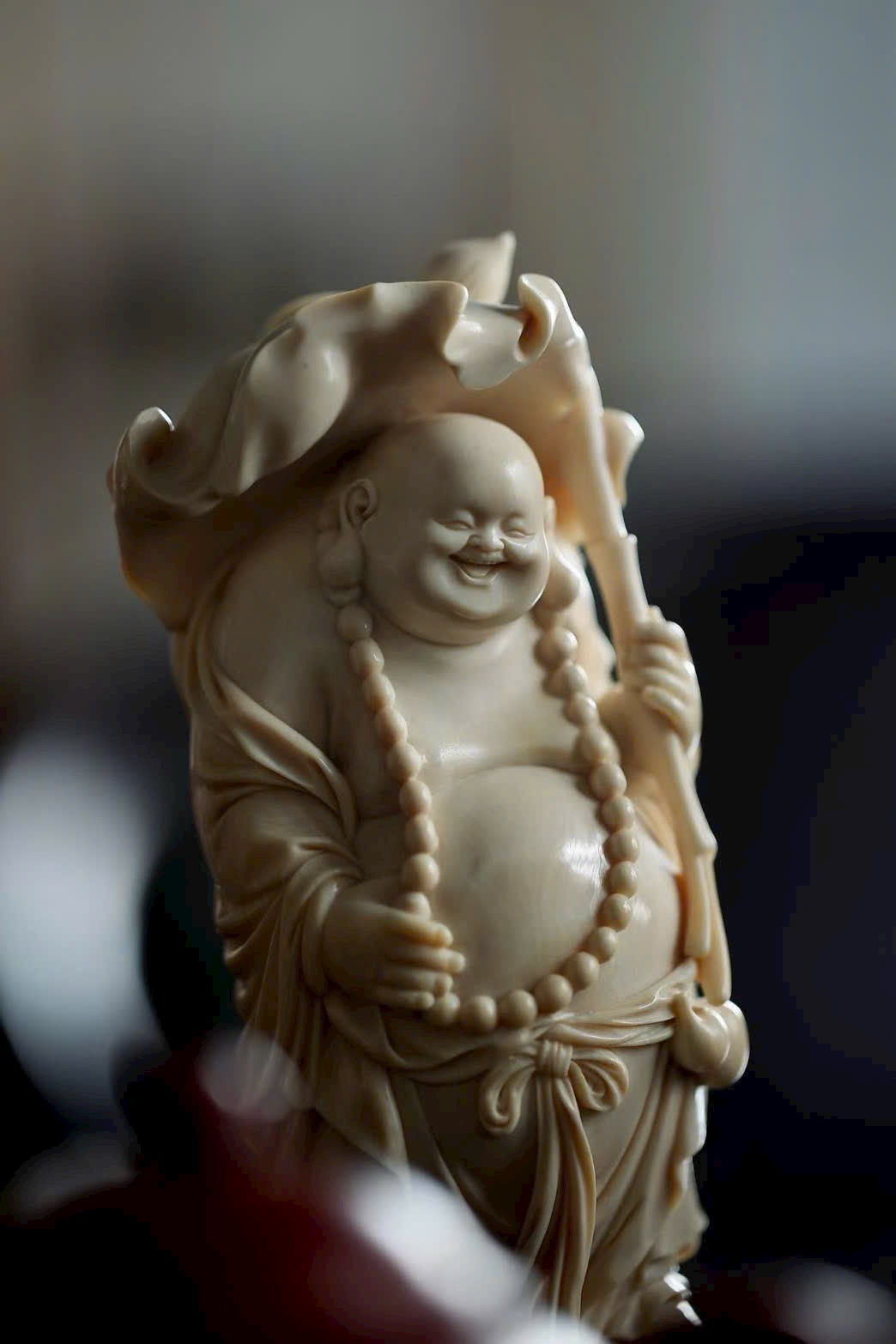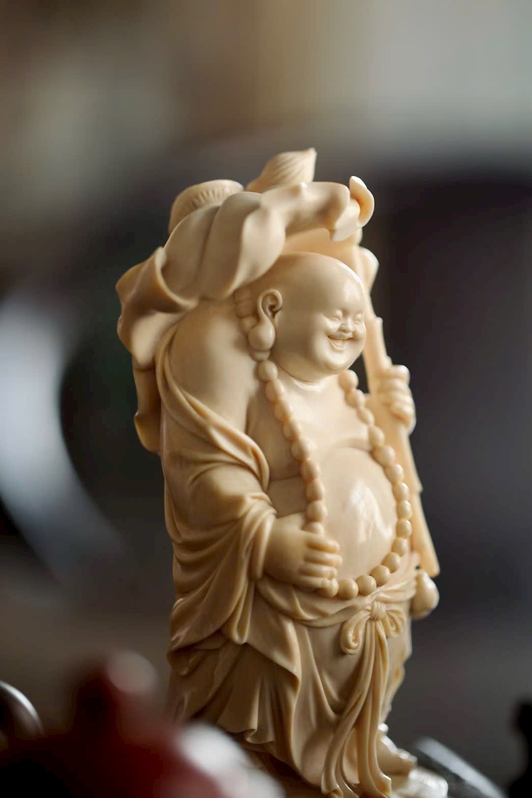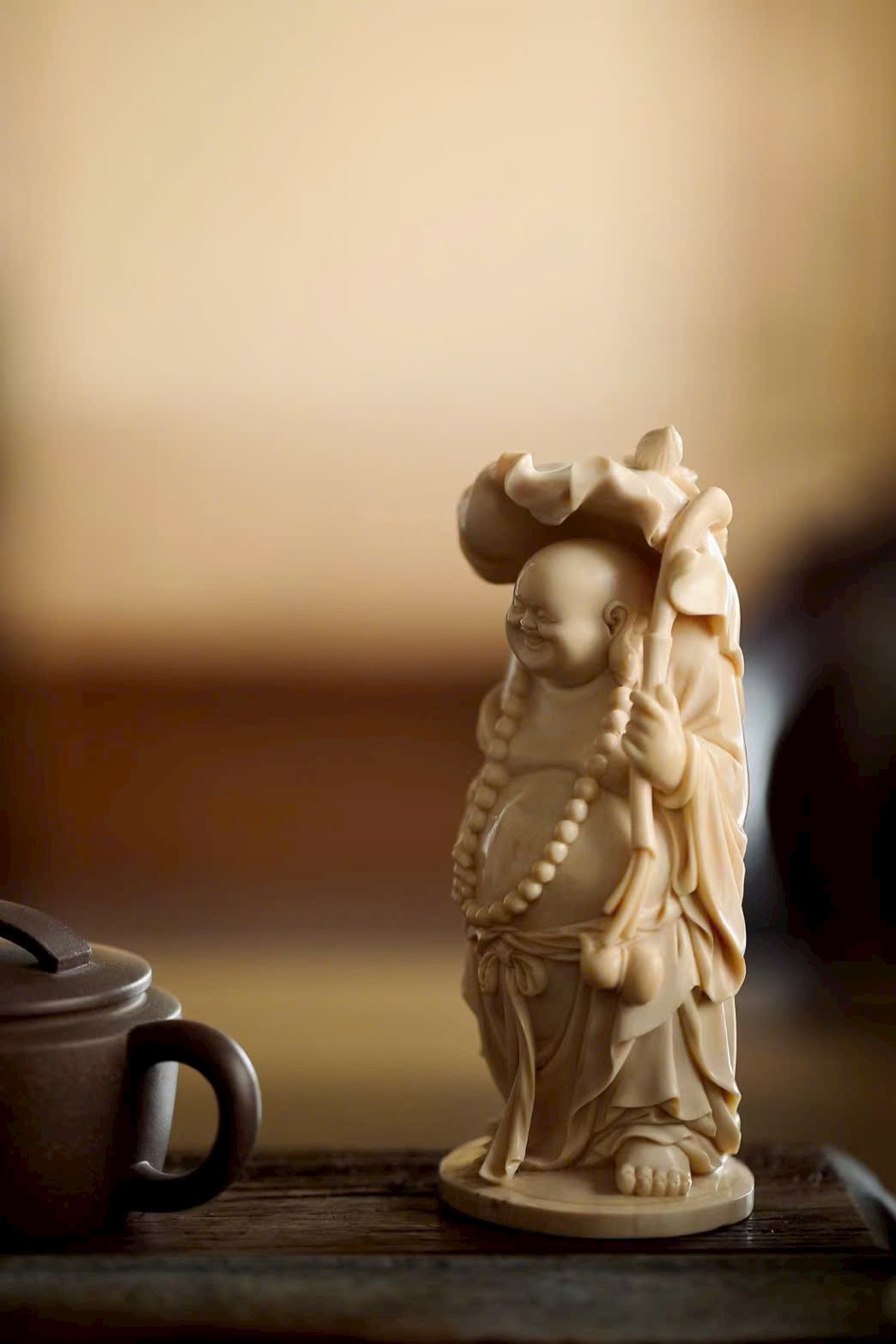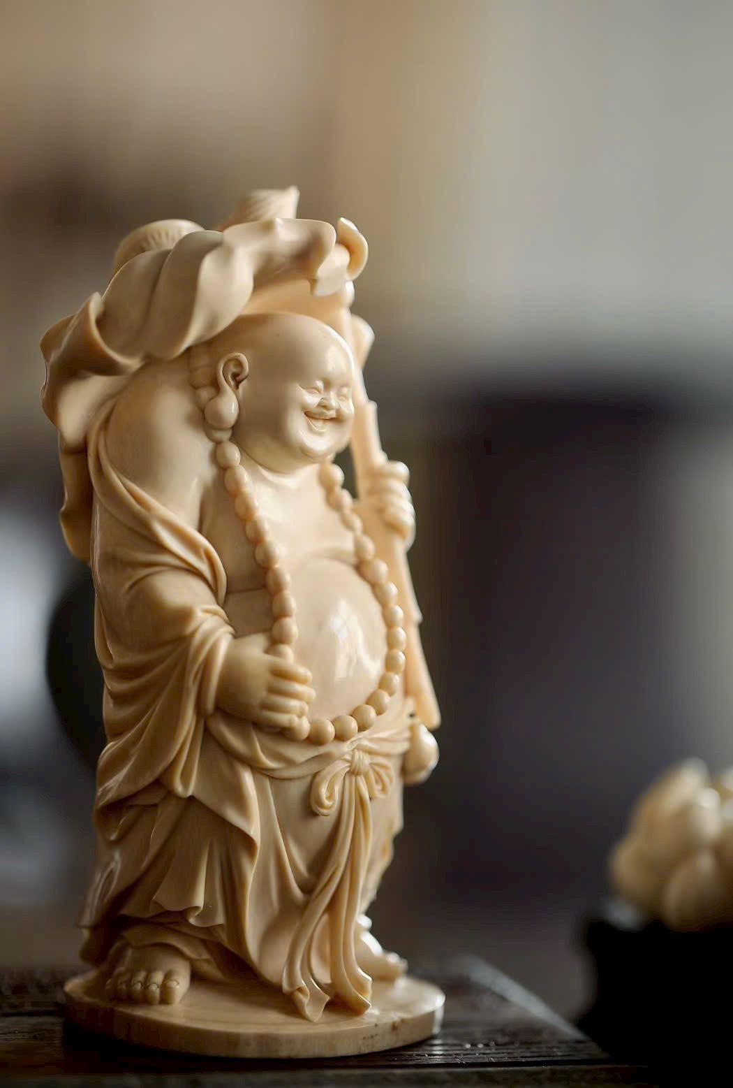 Nguyên khối điêu khắc, Di Lặc với gương mặt hoan hỷ tươi cười, hình thần đầy đủ, bụng lớn dung chứa, dáng vẻ tự tại phóng khoáng, phúc ý viên mãn. Bày trên án kỷ, mang ý nghĩa cát tường, vui vẻ và mỹ mãn.