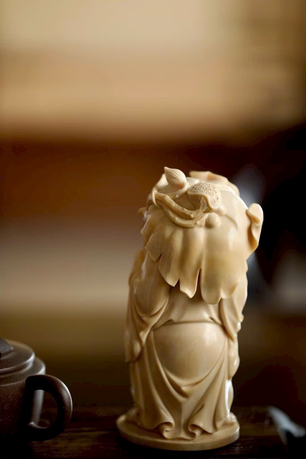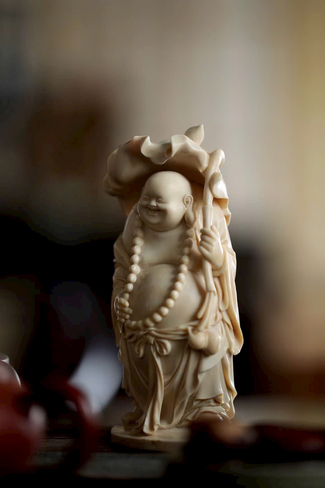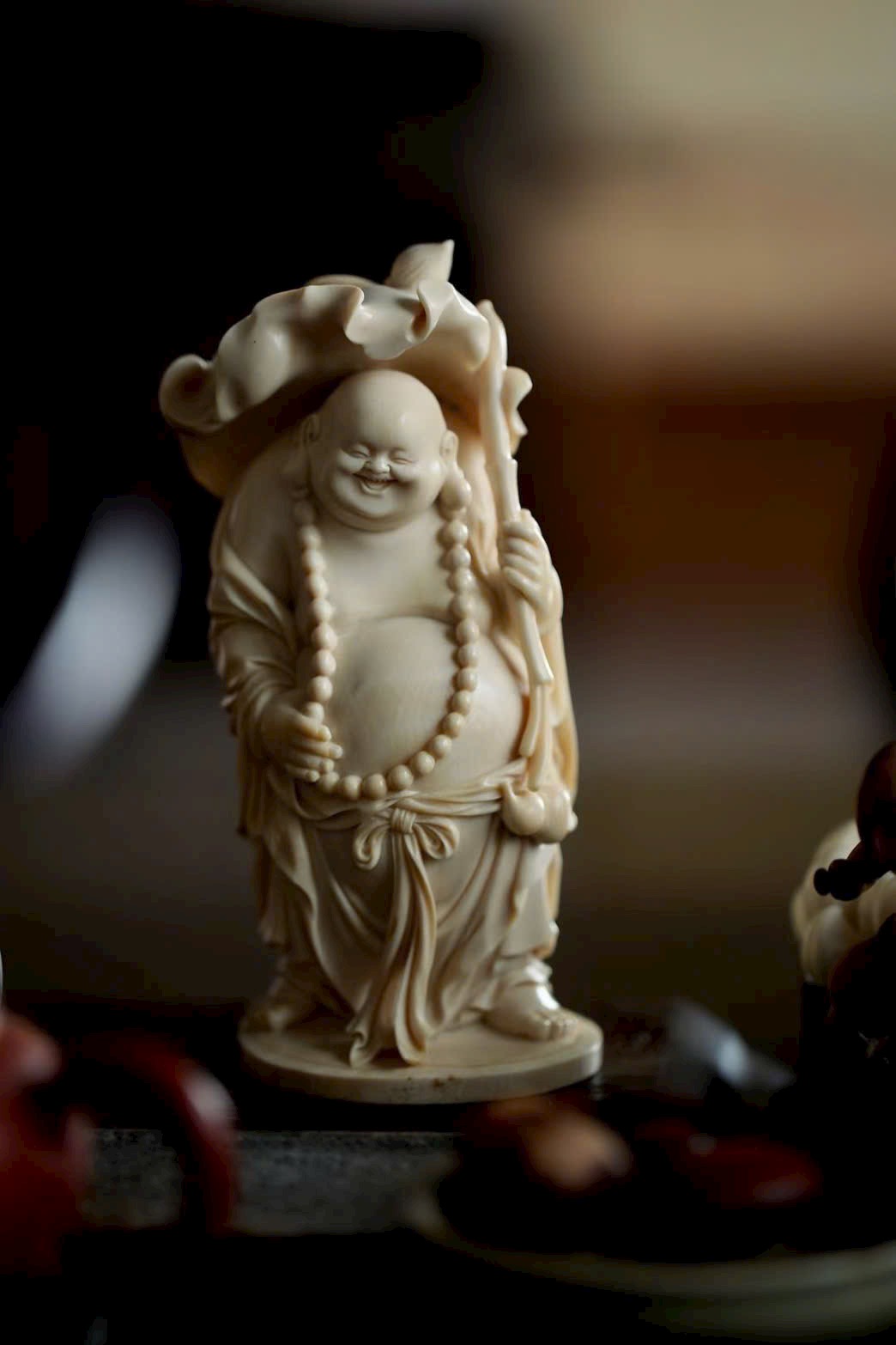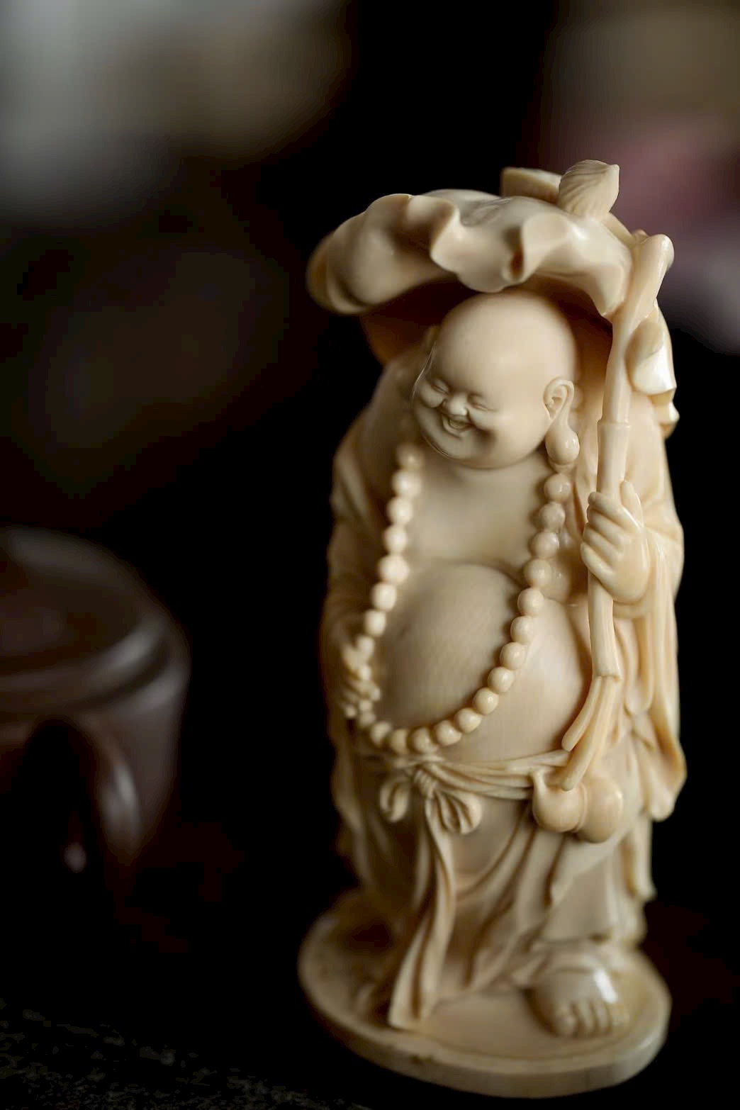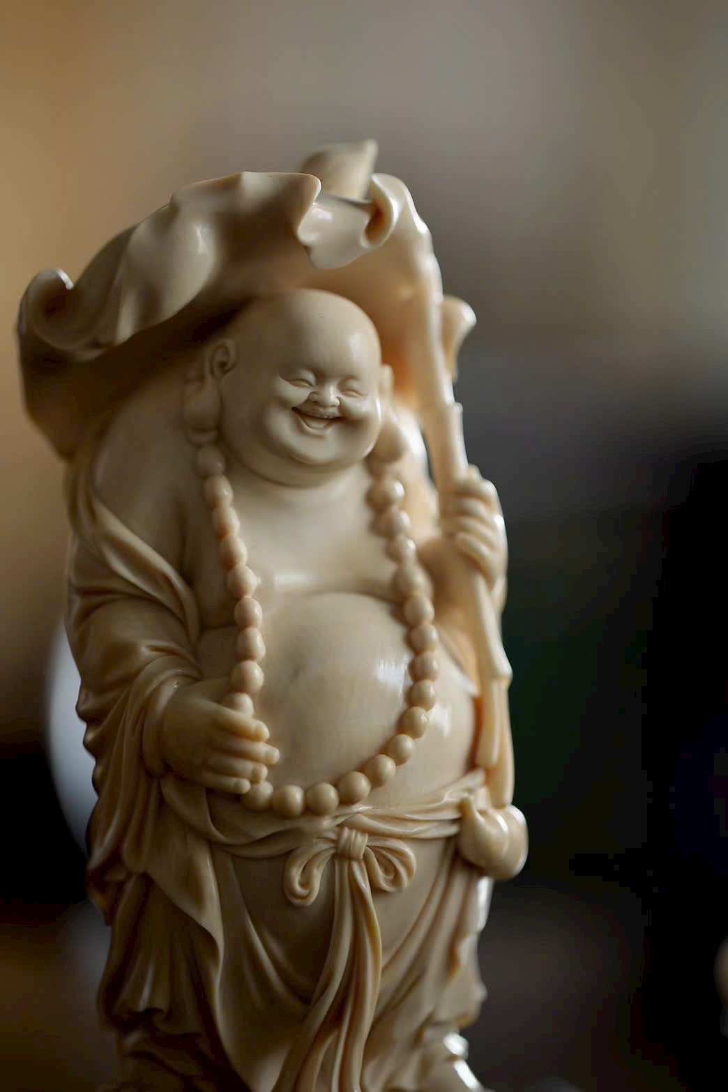Nguyên khối điêu khắc, Di Lặc với gương mặt hoan hỷ tươi cười, hình thần đầy đủ, bụng lớn dung chứa, dáng vẻ tự tại phóng khoáng, phúc ý viên mãn. Bày trên án kỷ, mang ý nghĩa cát tường, vui vẻ và mỹ mãn.