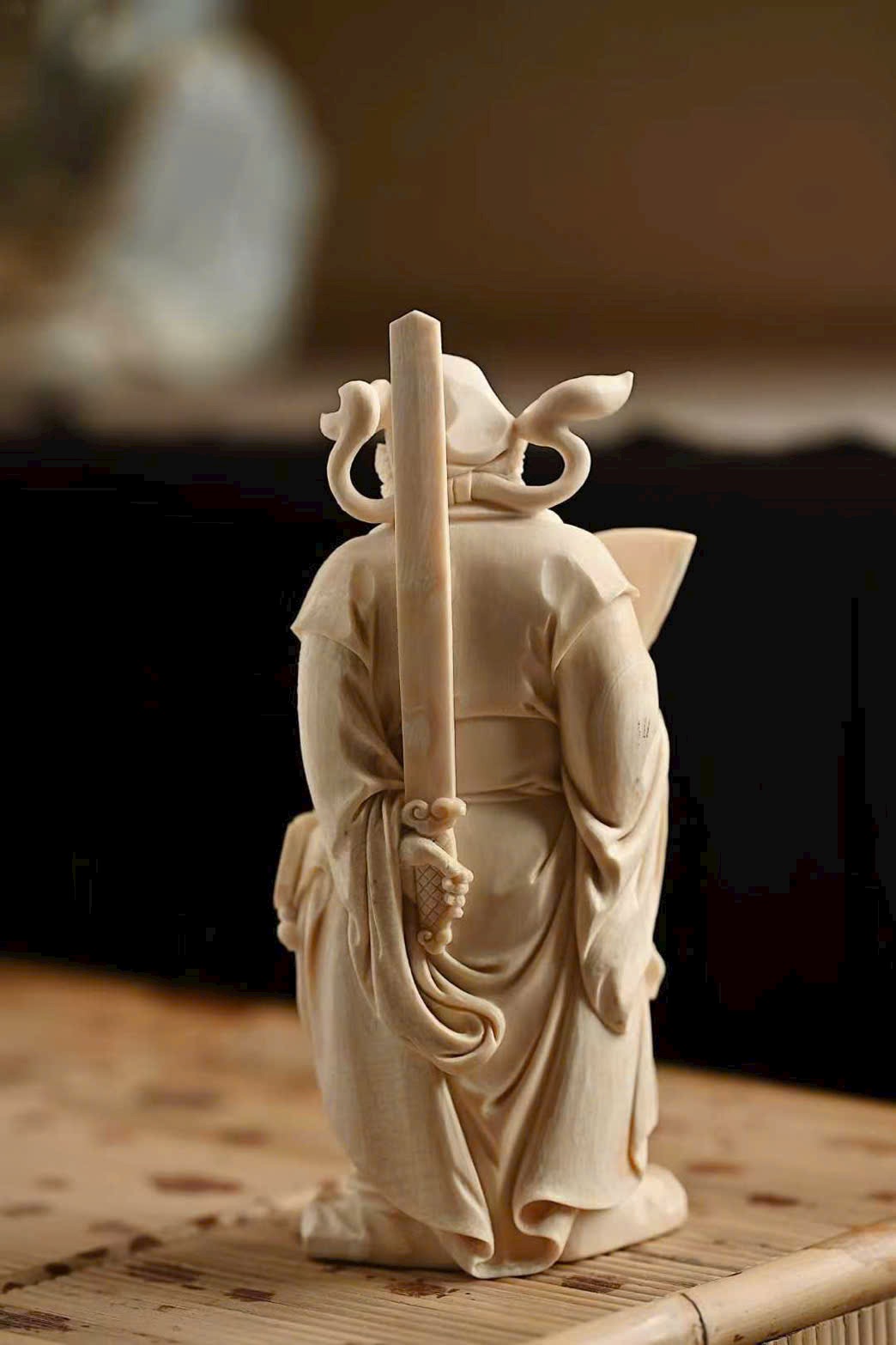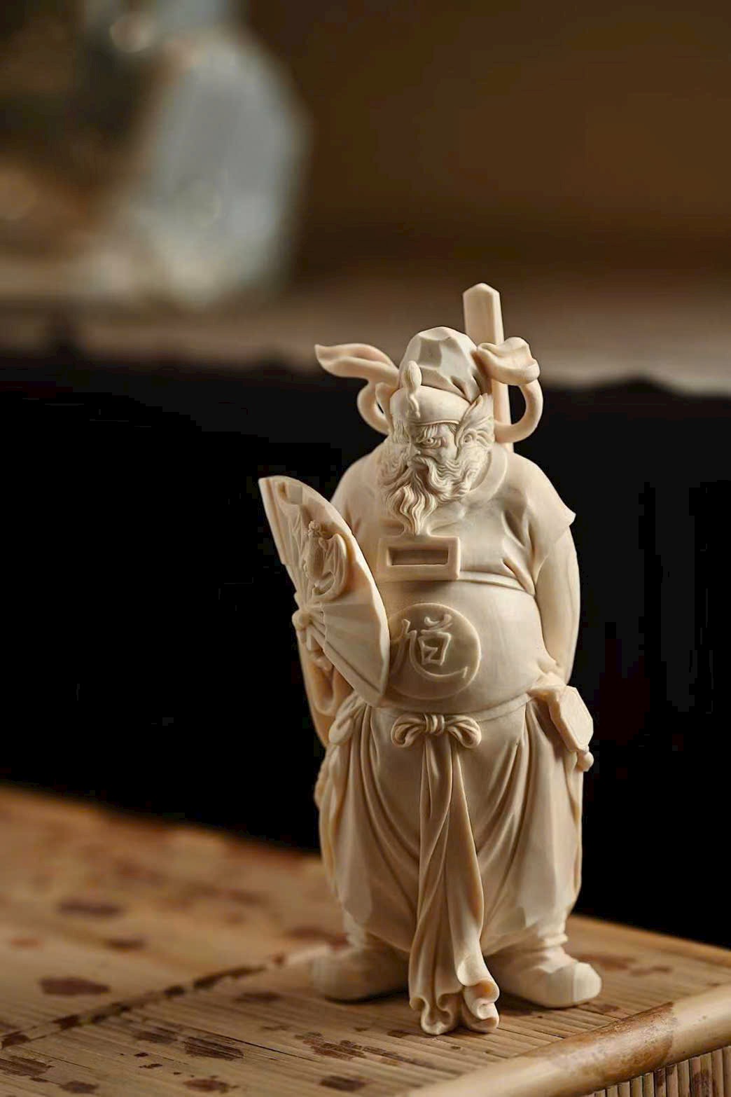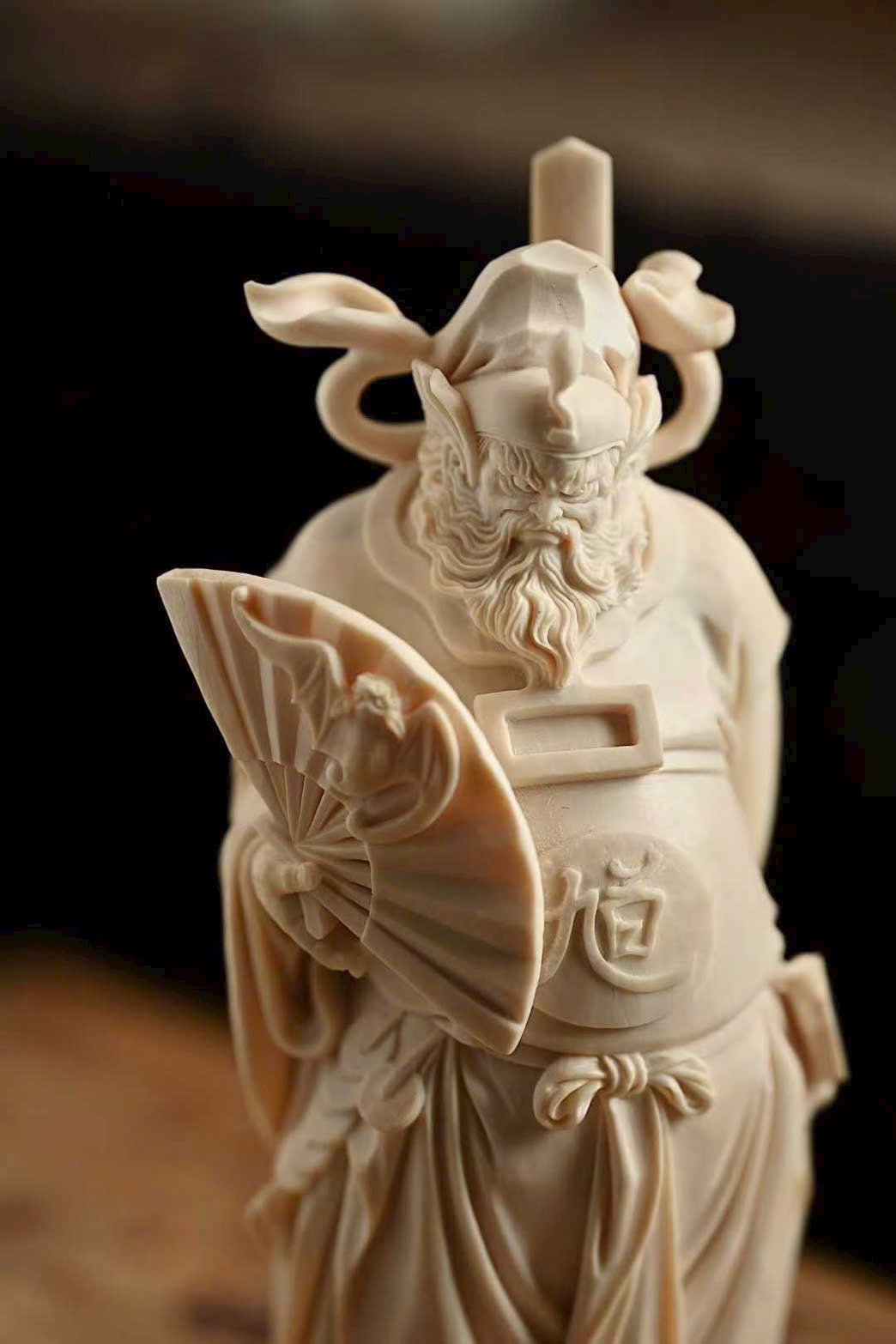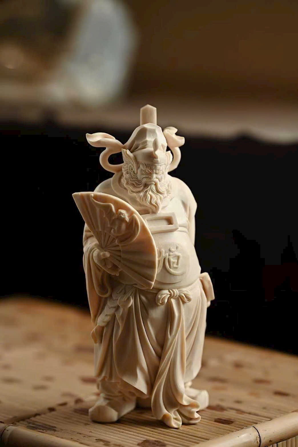 Tác phẩm được tạc từ ngà nguyên khối. Chung Quỳ đội mũ phốc, hai mắt tròn mở lớn, mặt sắt râu rậm, dung mạo dữ tợn. Đường nét khắc chạm tinh tế, sống động như thật. Thân mặc áo bào rộng, một tay cầm quạt, một tay nắm kiếm sắc, thần thái uy nghi, chính khí lẫm liệt.