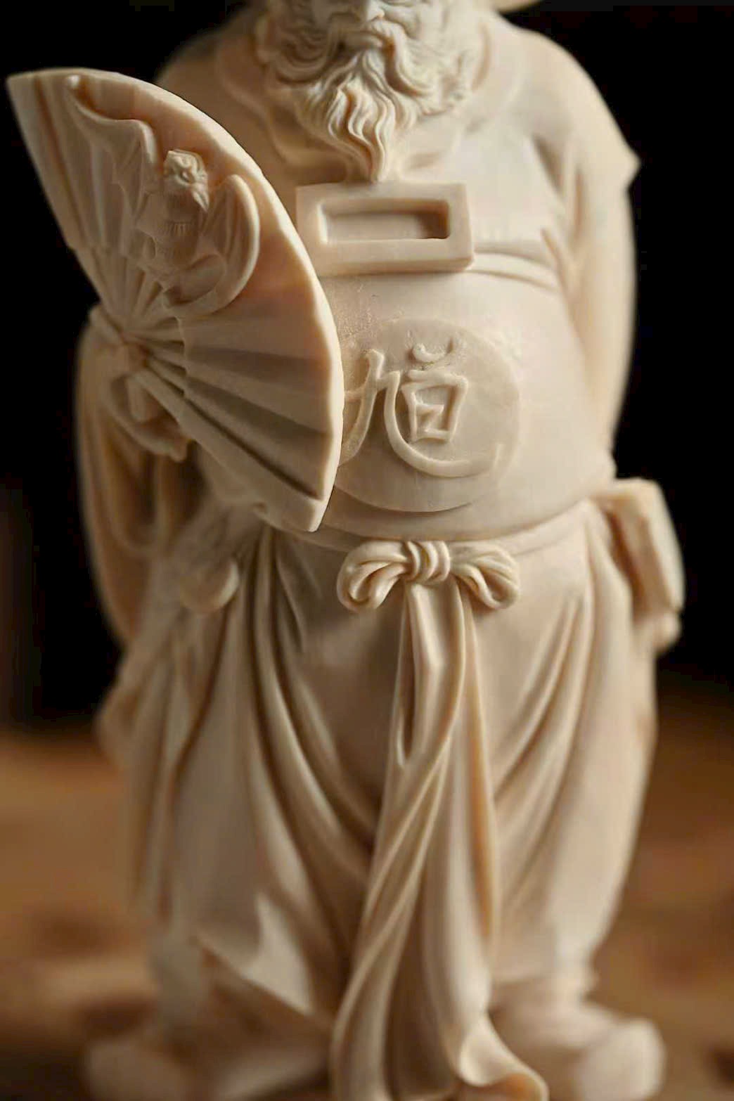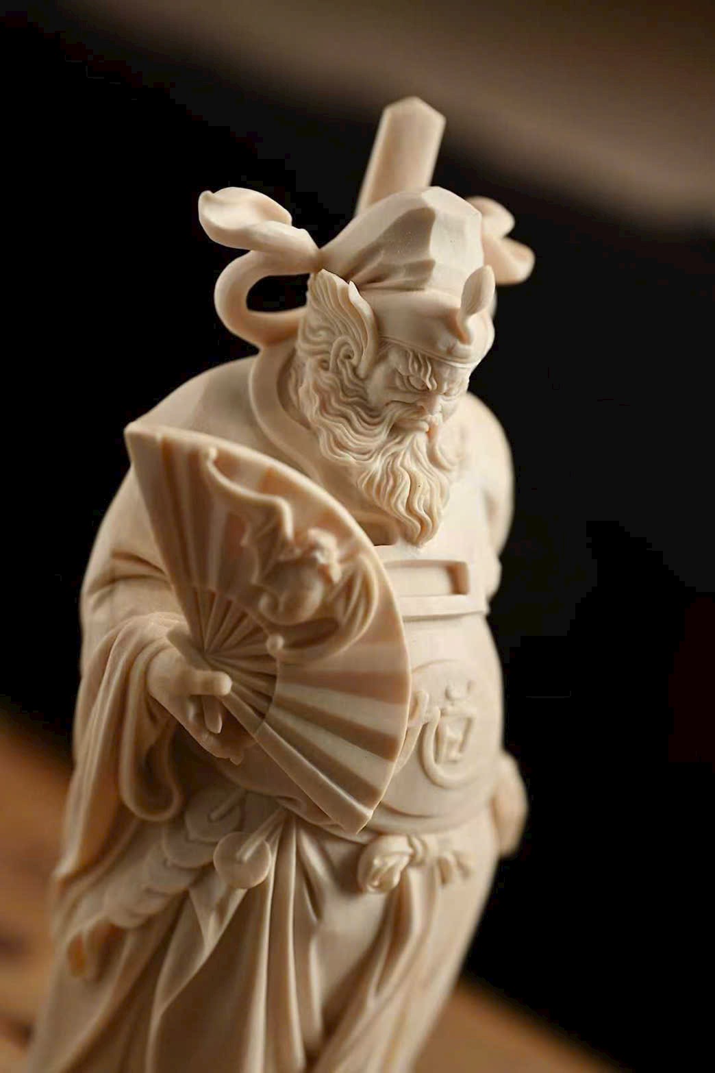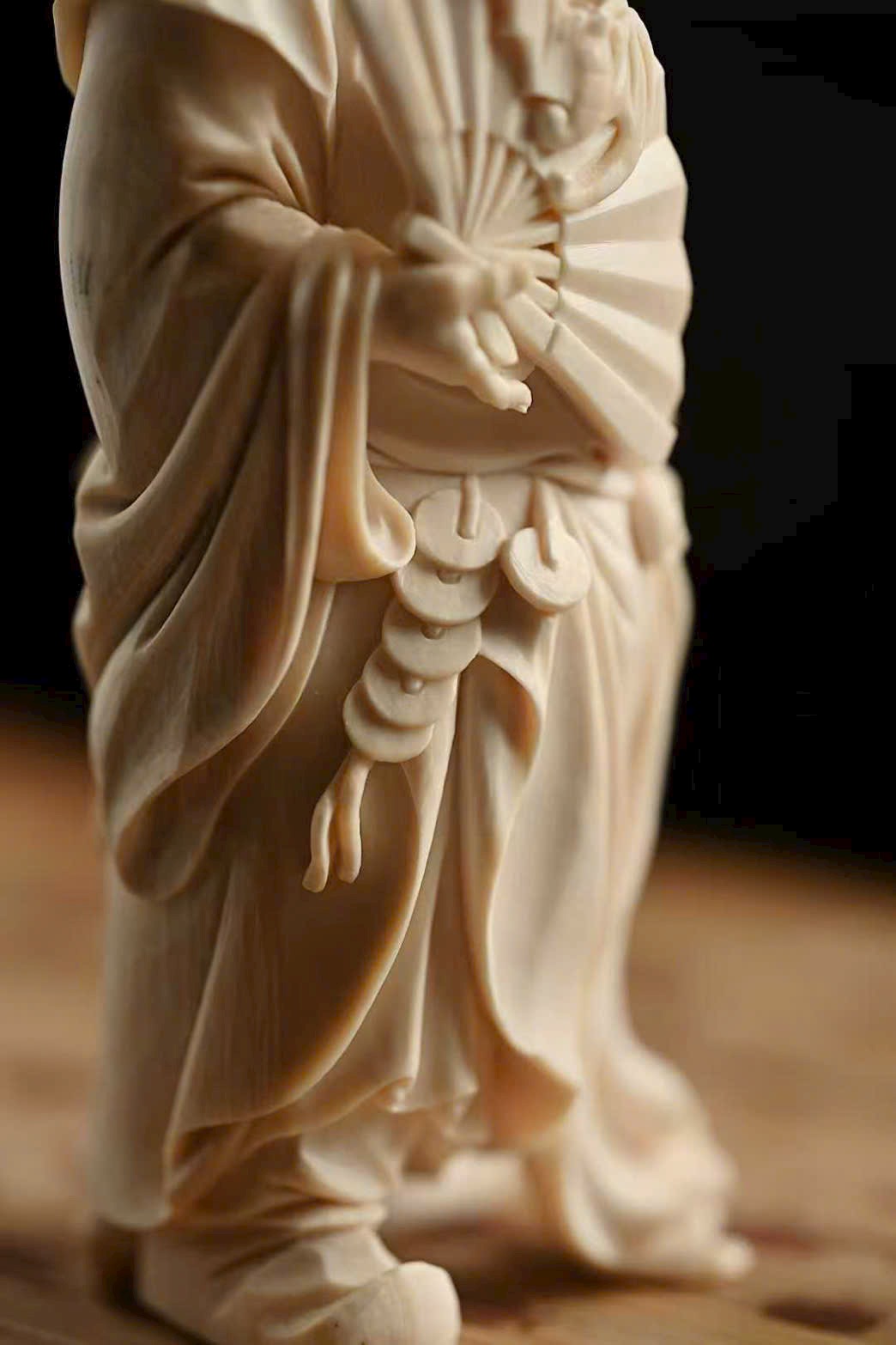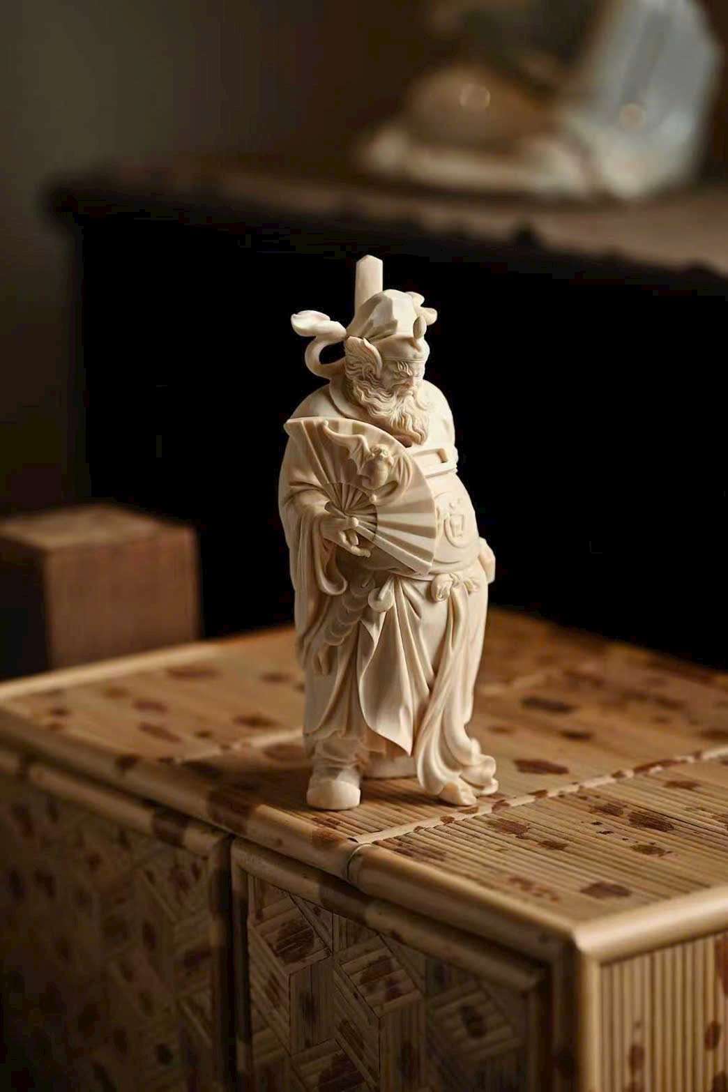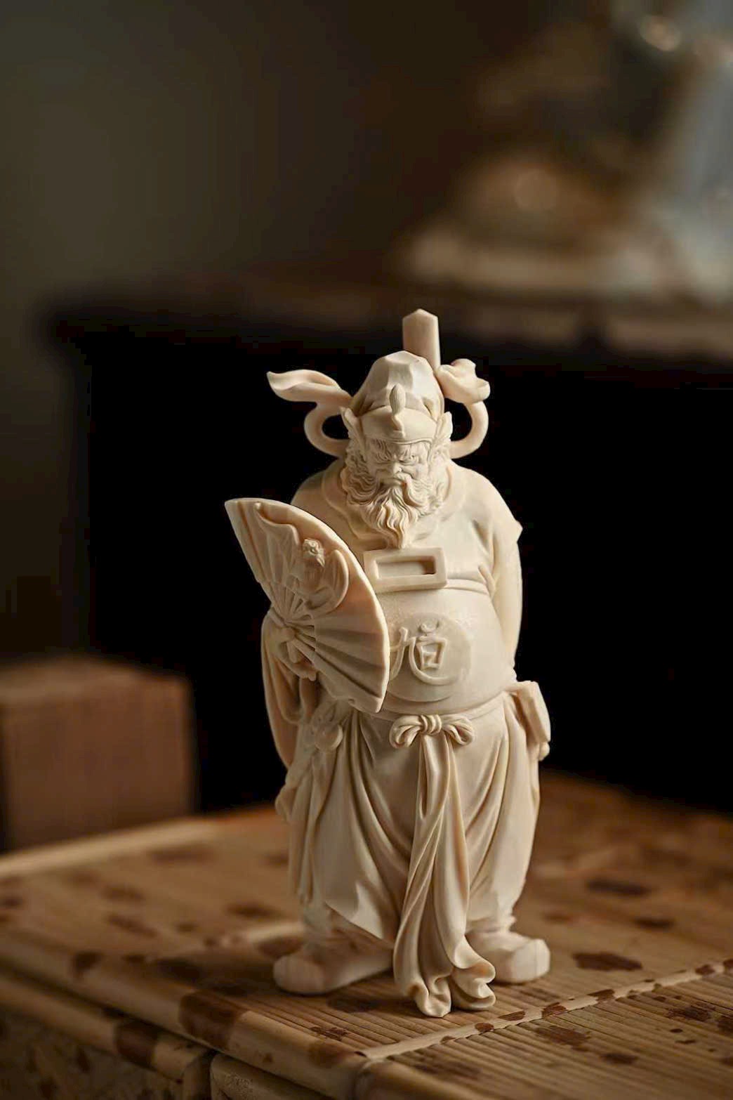 Tác phẩm được tạc từ ngà nguyên khối. Chung Quỳ đội mũ phốc, hai mắt tròn mở lớn, mặt sắt râu rậm, dung mạo dữ tợn. Đường nét khắc chạm tinh tế, sống động như thật. Thân mặc áo bào rộng, một tay cầm quạt, một tay nắm kiếm sắc, thần thái uy nghi, chính khí lẫm liệt.