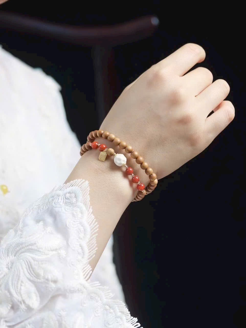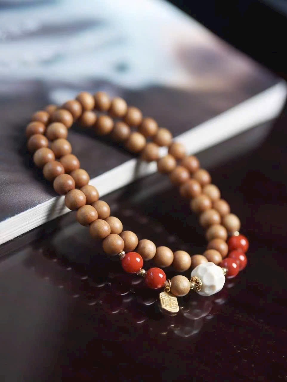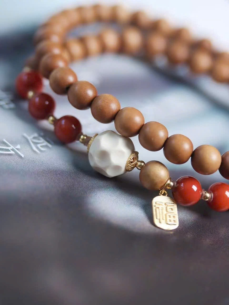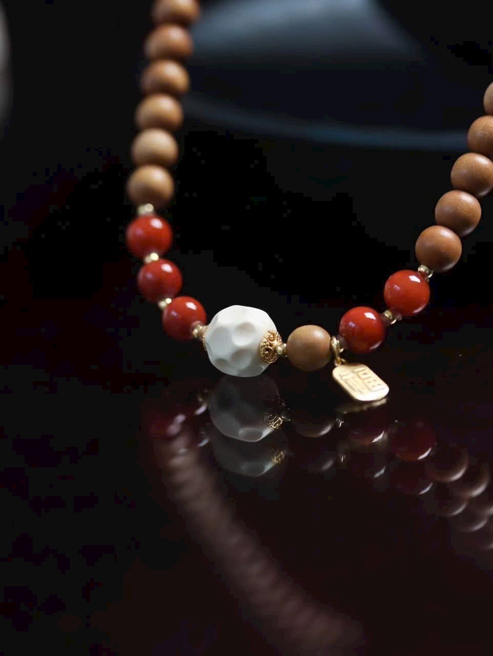 Trong từng lần mân mê, gỗ đàn hương dần thêm bóng, hạt đỏ càng rực, thẻ phúc luôn kề bên — đó là cuộc đối thoại dịu dàng giữa vật phẩm và năm tháng