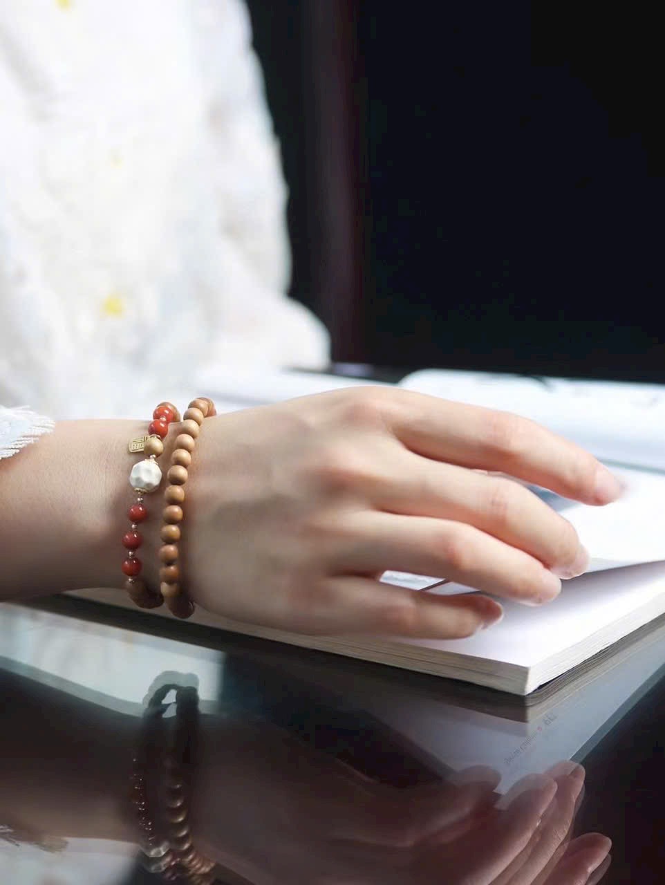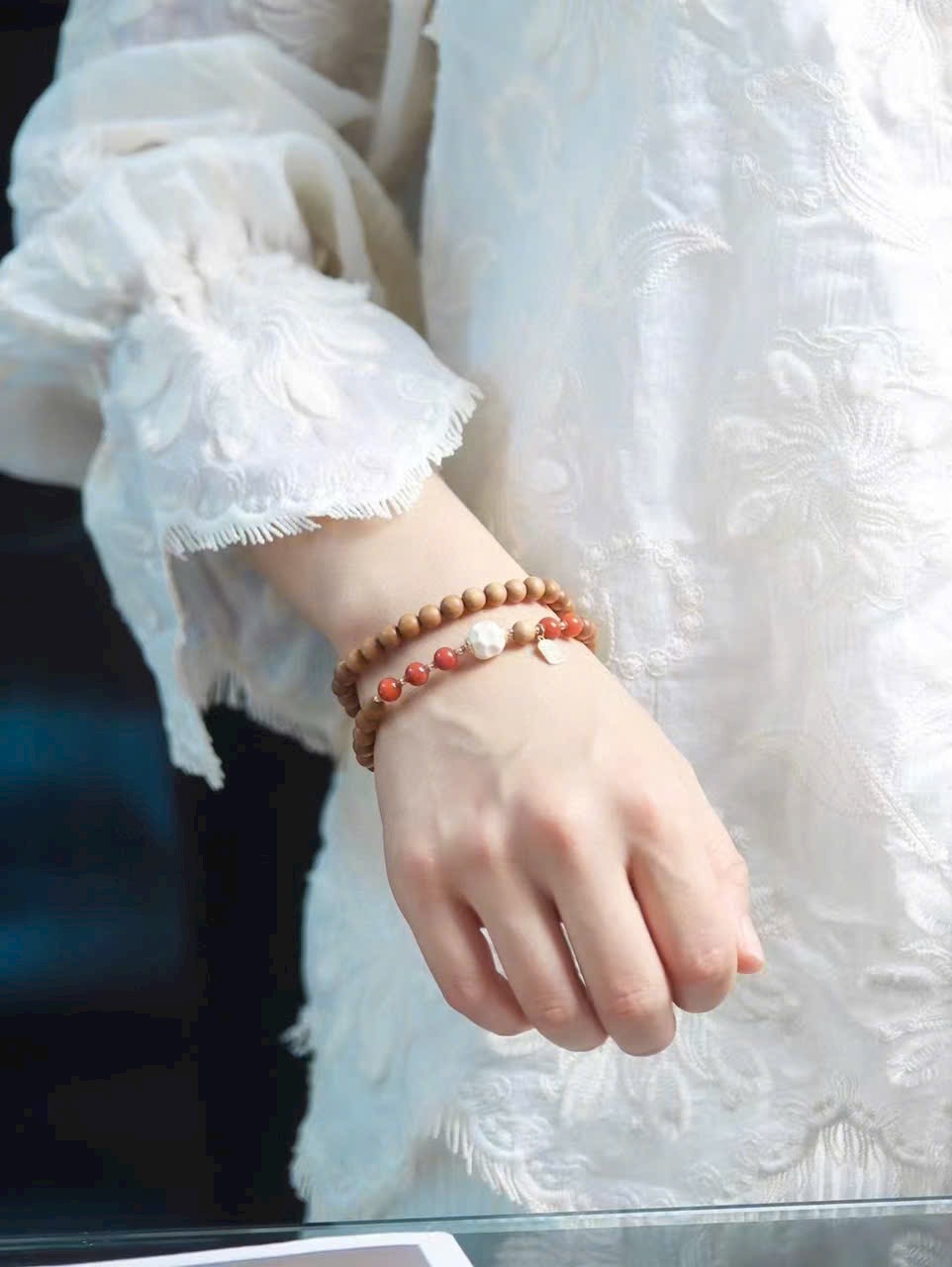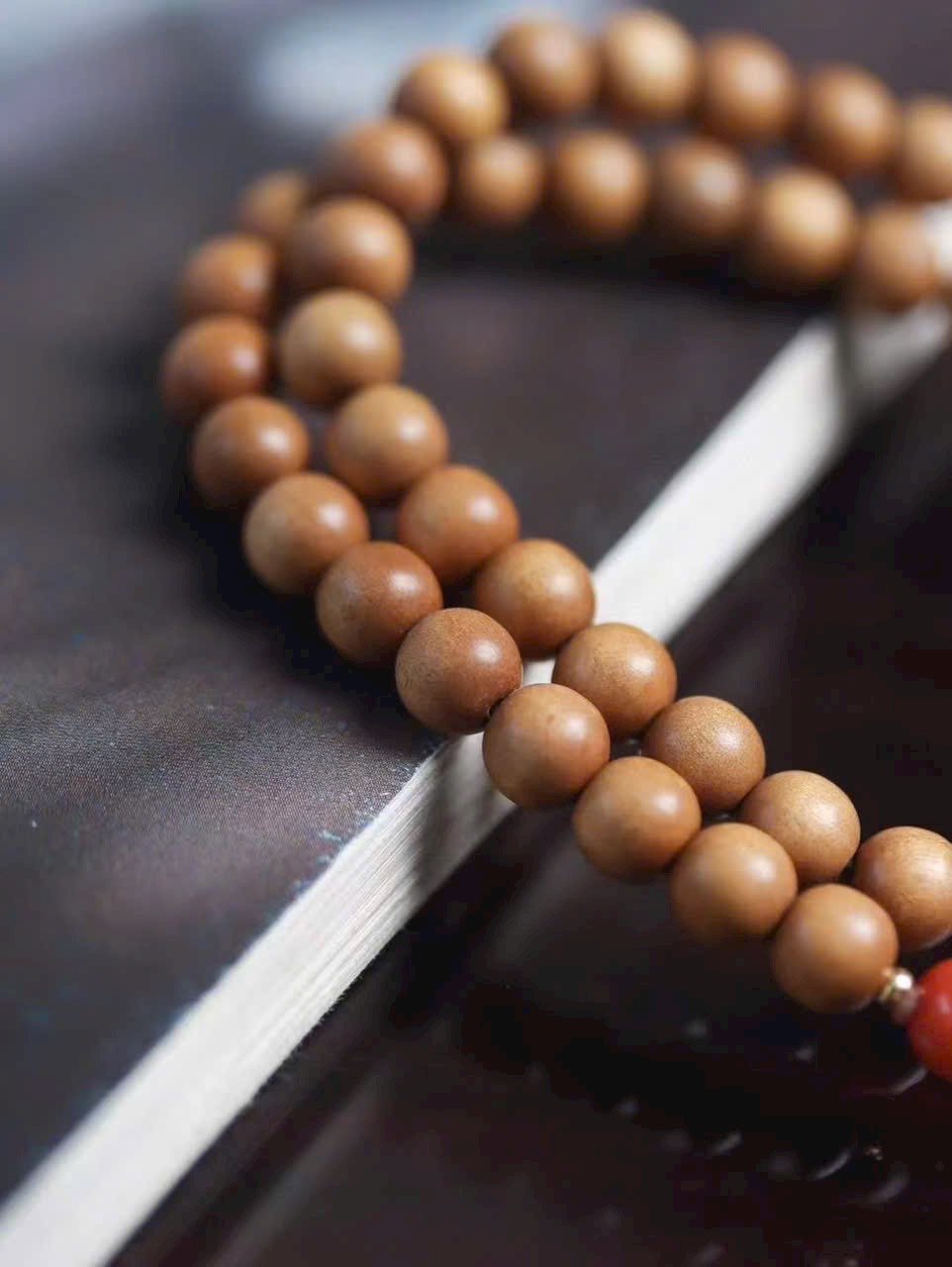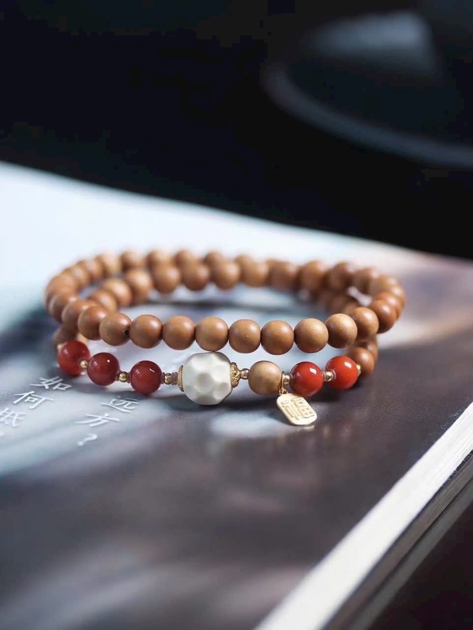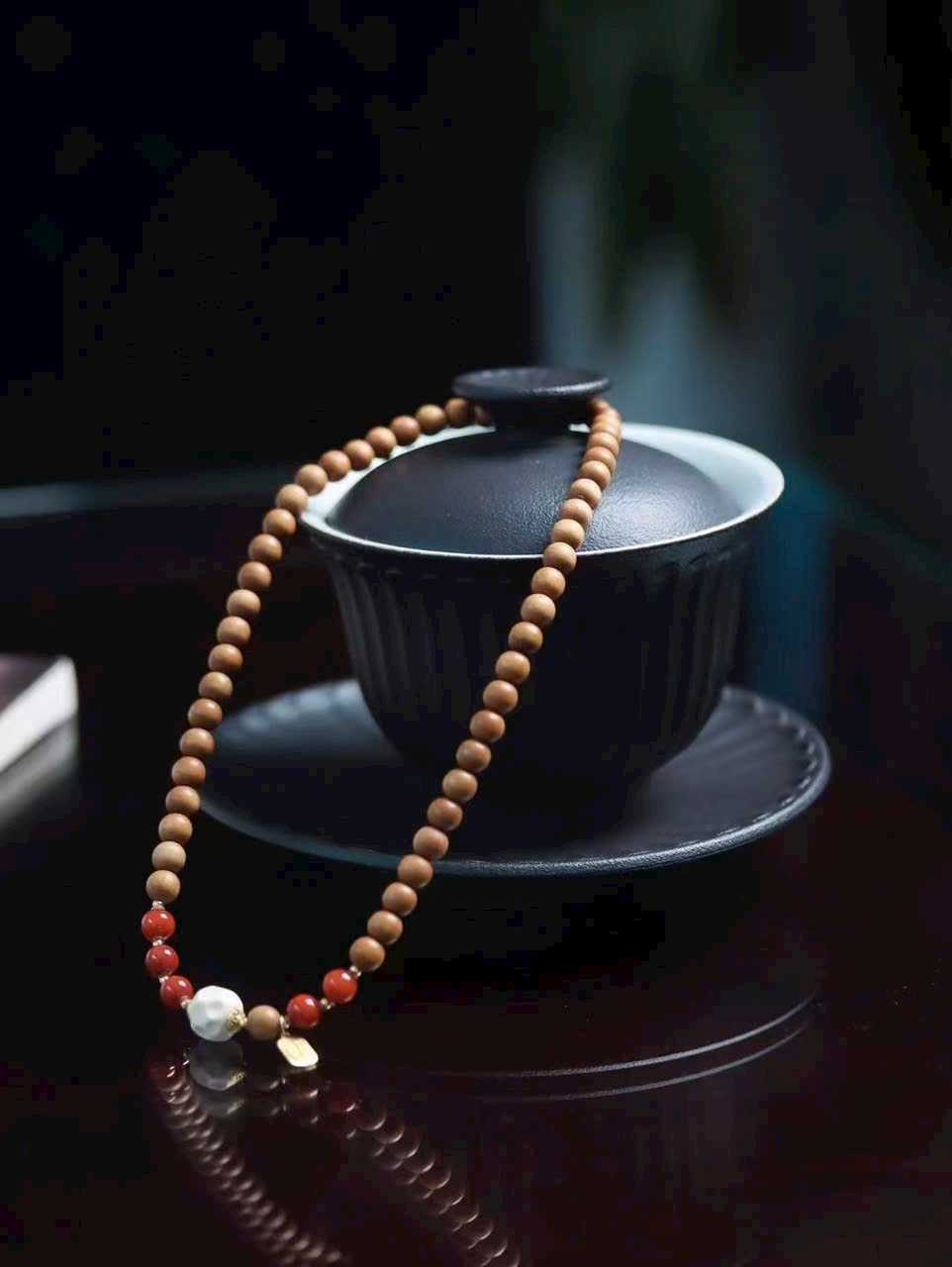 Trong từng lần mân mê, gỗ đàn hương dần thêm bóng, hạt đỏ càng rực, thẻ phúc luôn kề bên — đó là cuộc đối thoại dịu dàng giữa vật phẩm và năm tháng