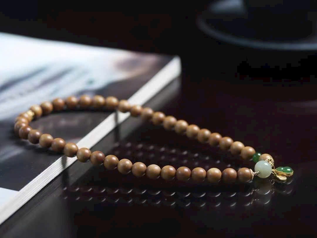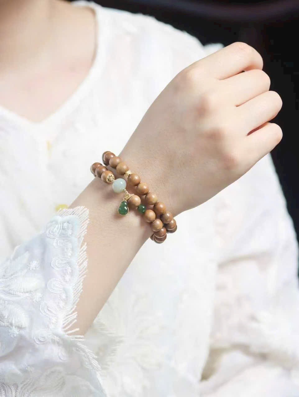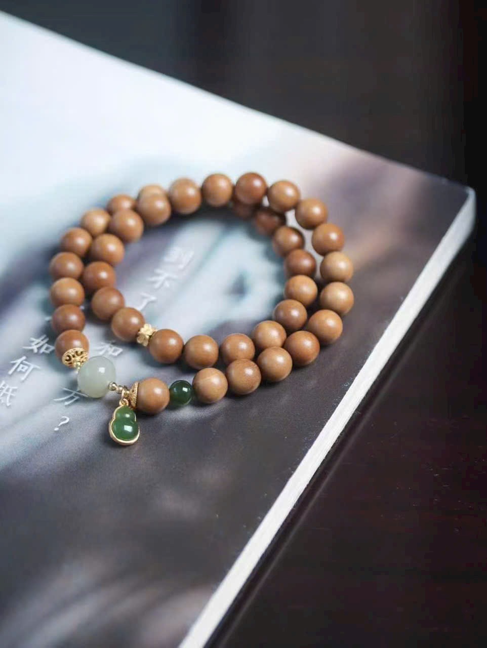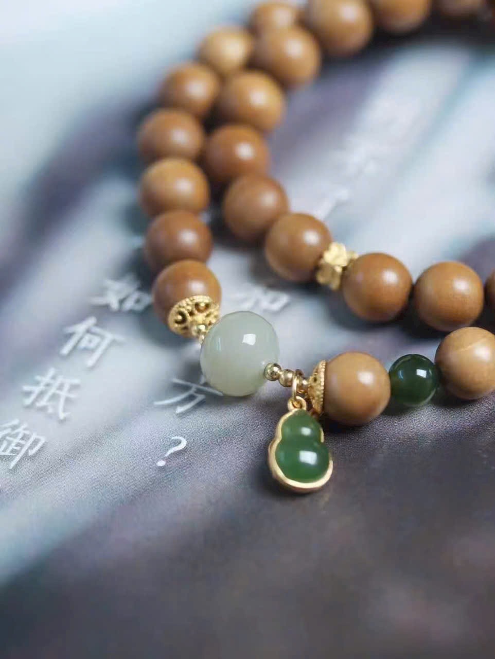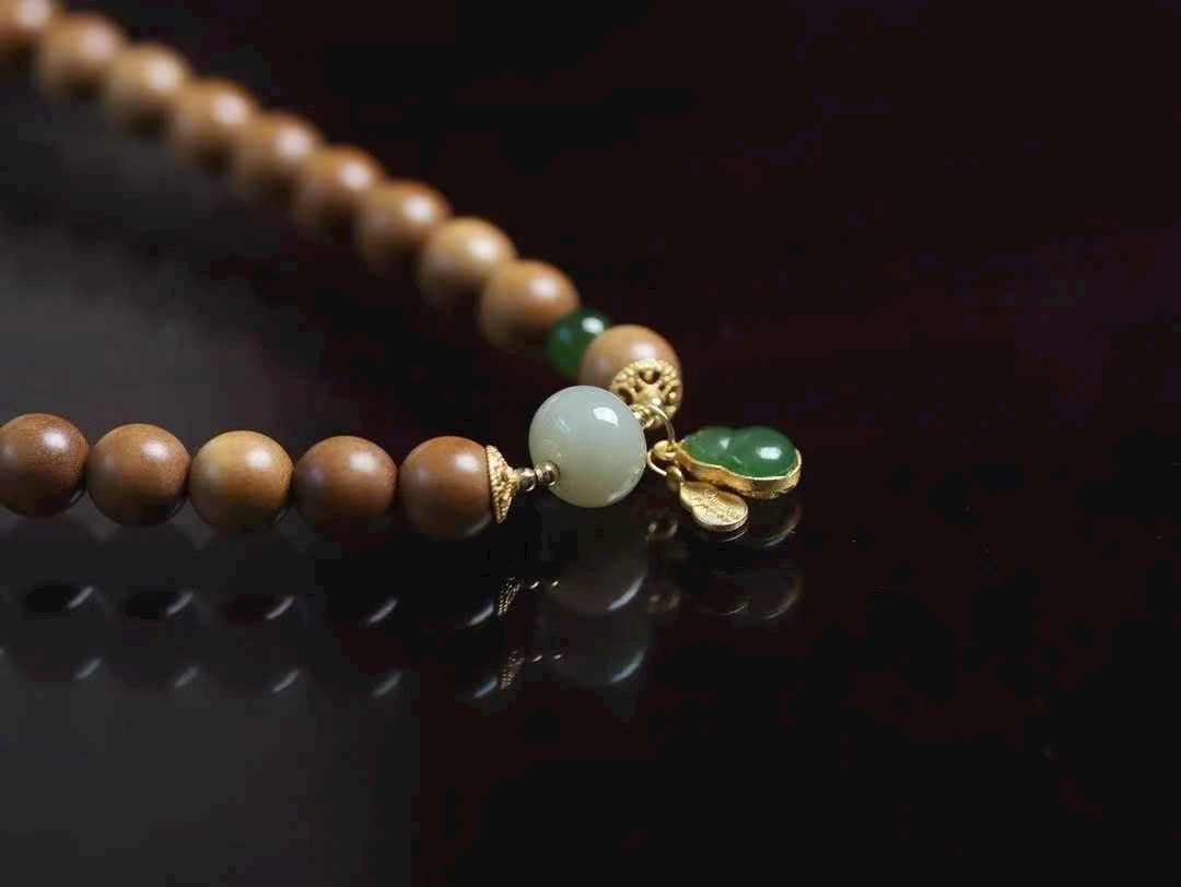Đàn hương lão sơn ấm mịn, ngọc tăng thêm thần vận; hồ lô nạm vàng cất giữ niềm vui và cát khí.