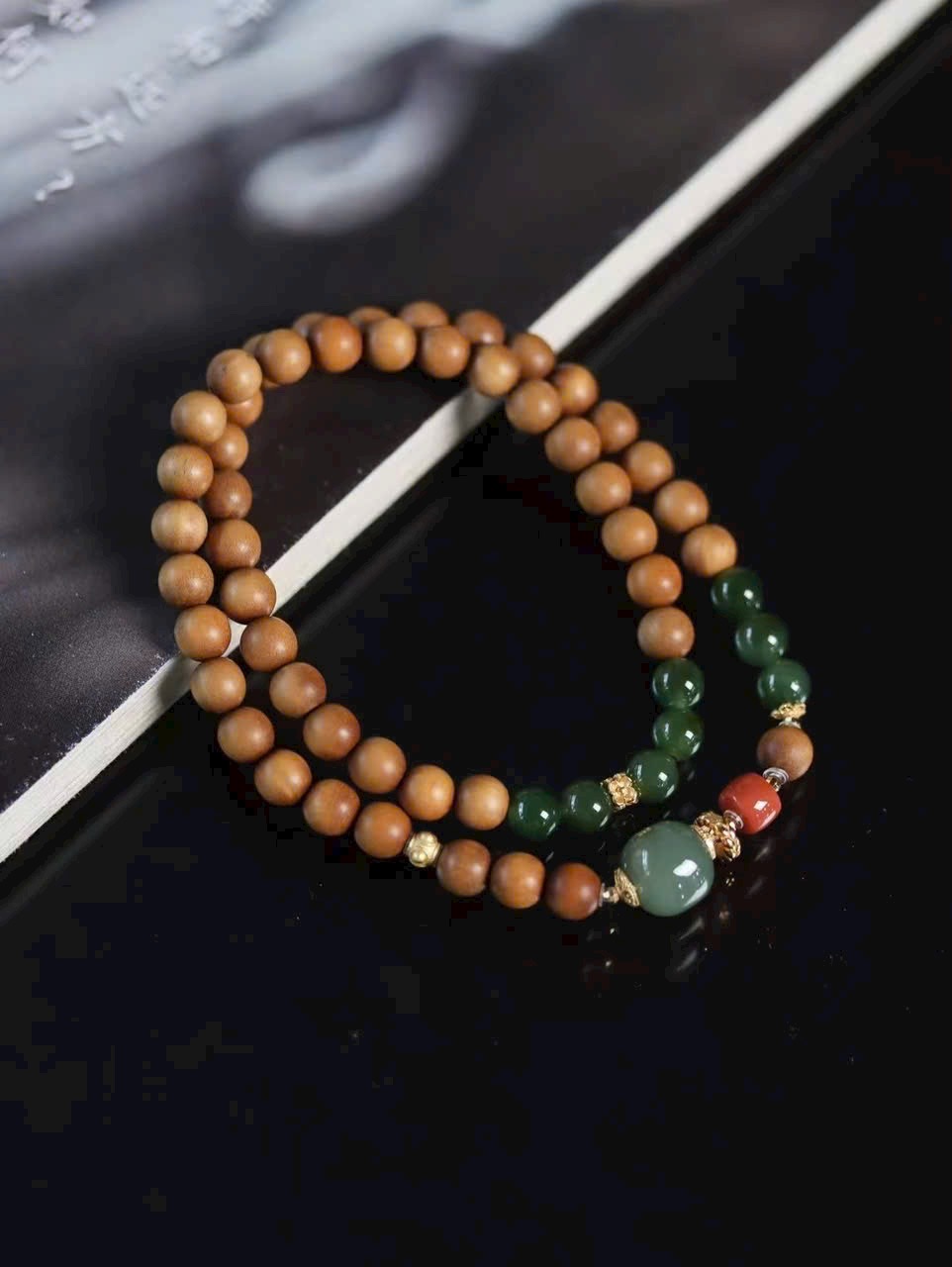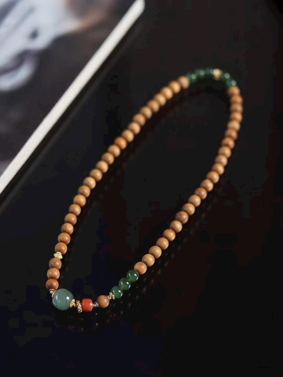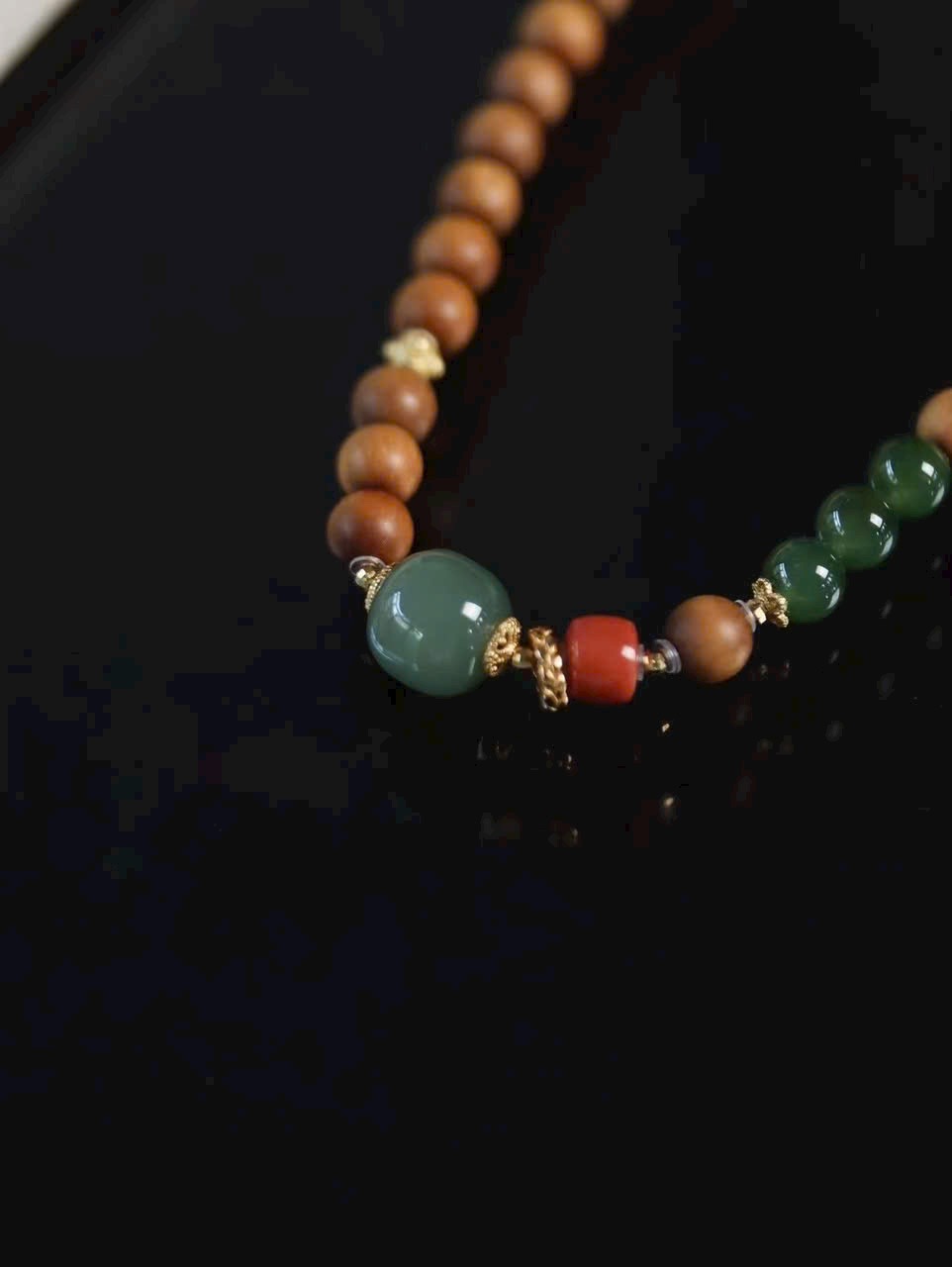 Sự mộc mạc của đàn hương lão sơn gặp gỡ nét trong trẻo của ngọc Hòa Điền và sắc rực rỡ của nam hồng, như gói trọn “nhã” và “vận” trong thẩm mỹ Trung Hoa vào chuỗi hạt này.