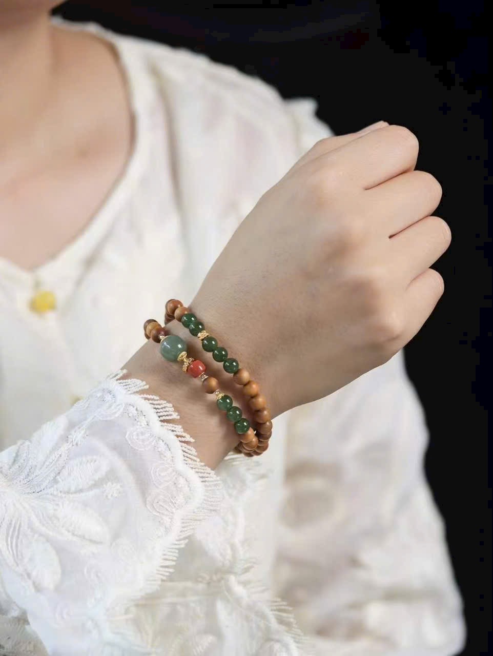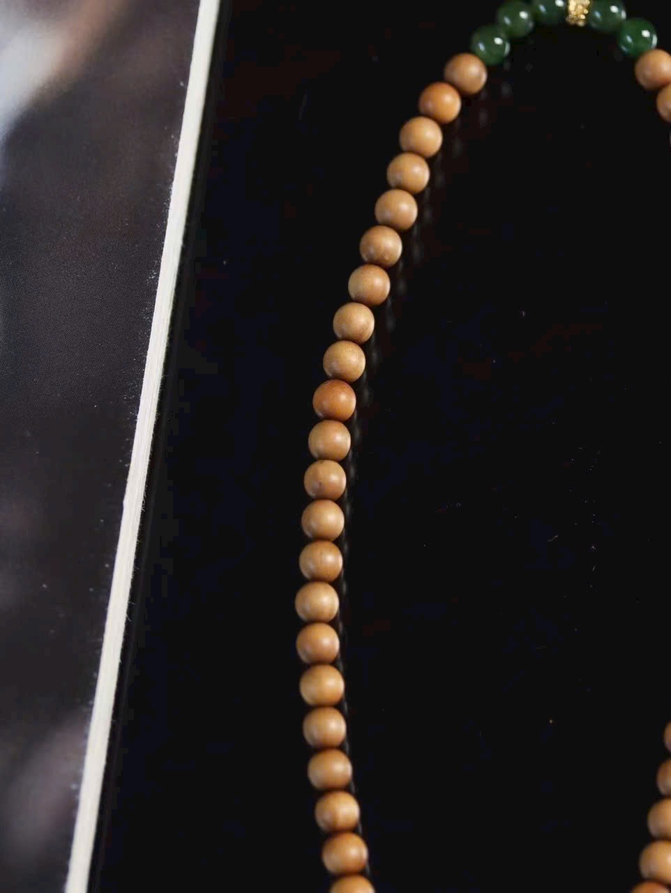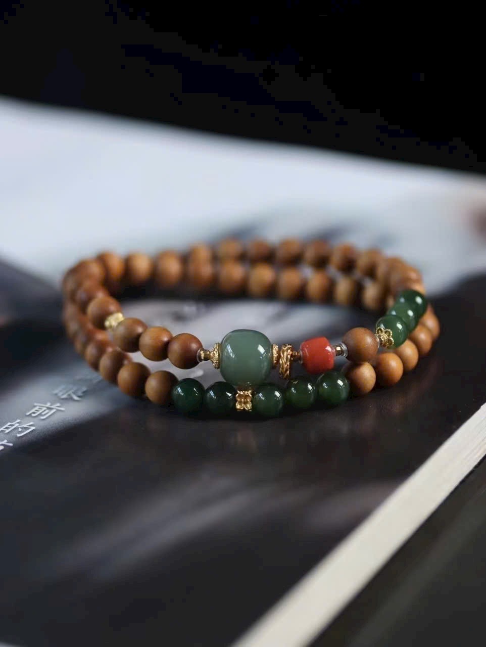 Sự mộc mạc của đàn hương lão sơn gặp gỡ nét trong trẻo của ngọc Hòa Điền và sắc rực rỡ của nam hồng, như gói trọn “nhã” và “vận” trong thẩm mỹ Trung Hoa vào chuỗi hạt này.