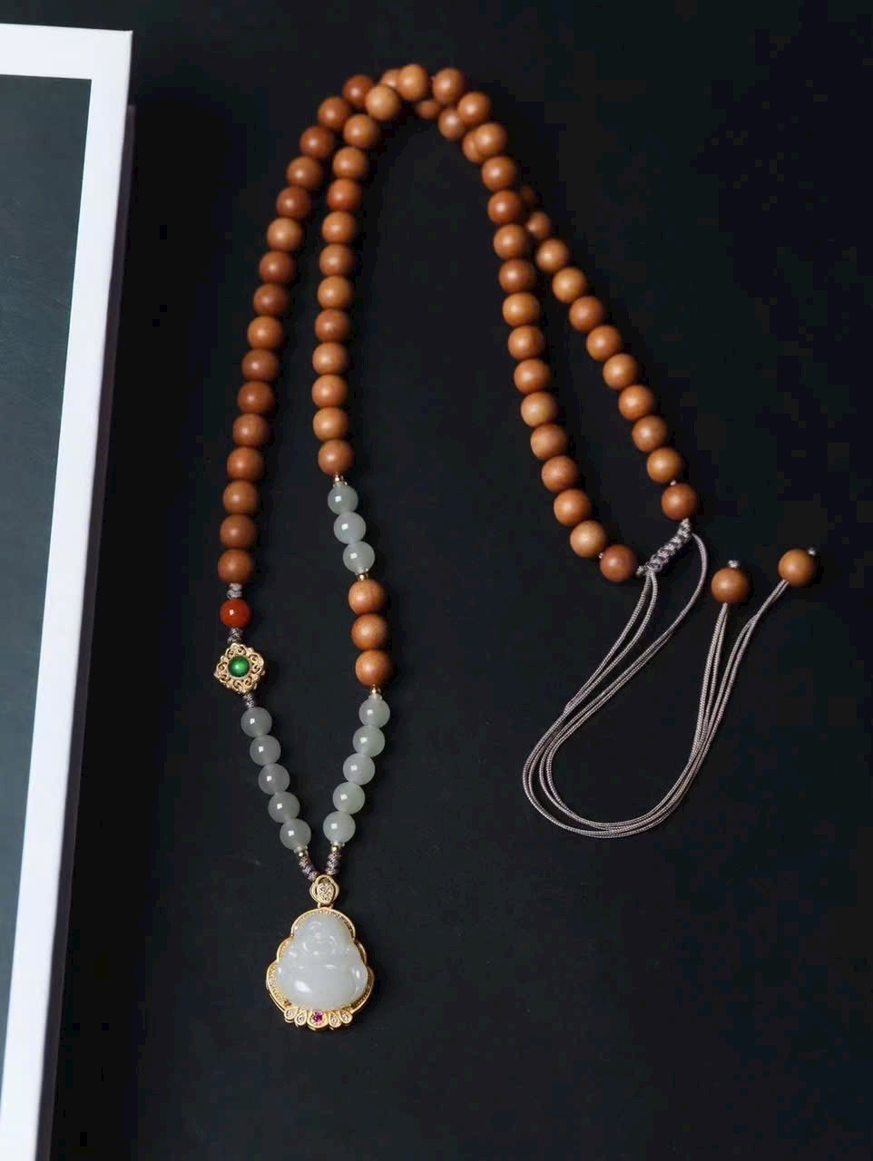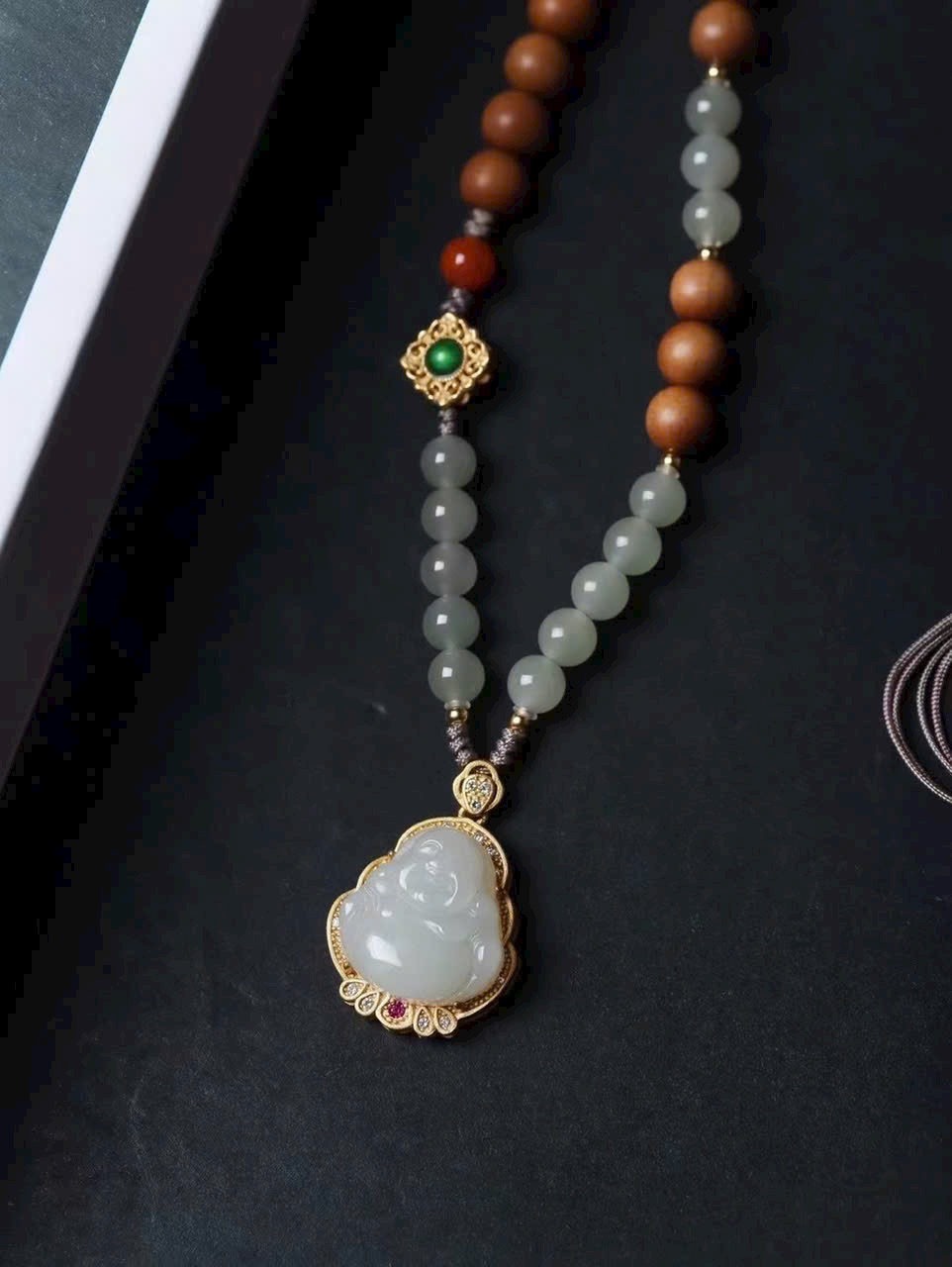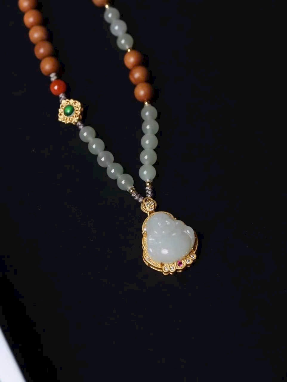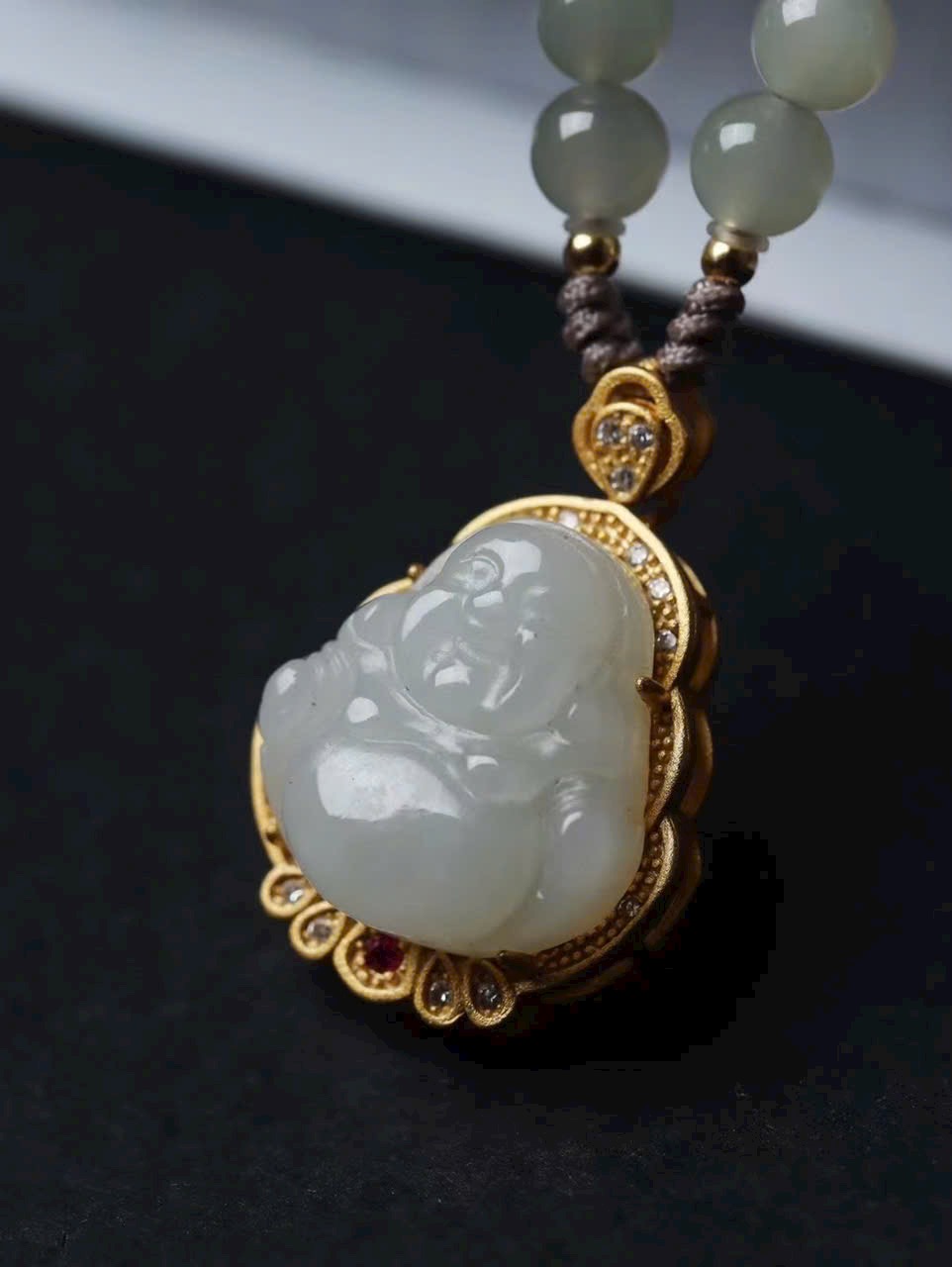 Ngọc được chạm khắc thành hình Phật Di Lặc, nụ cười rạng rỡ như có thể dung chứa mọi phiền nhiễu nhân gian. Kết hợp kỹ nghệ dát vàng tinh xảo, vừa lộng lẫy vừa trang nghiêm. Tác phẩm mang ý nghĩa biểu trưng cho sự lạc quan, rộng lượng và phúc lành viên mãn, đồng hành cùng bạn qua từng năm tháng.