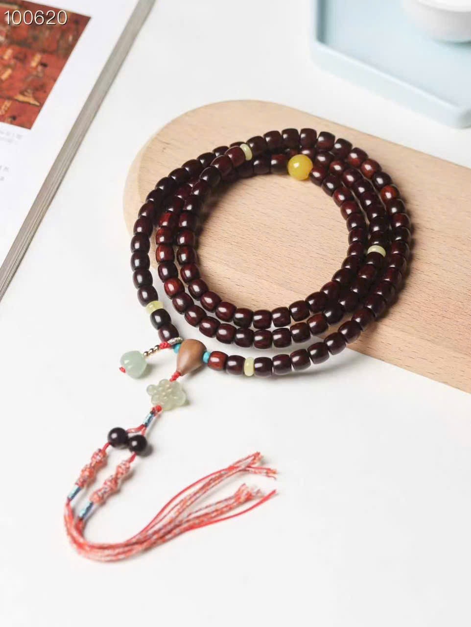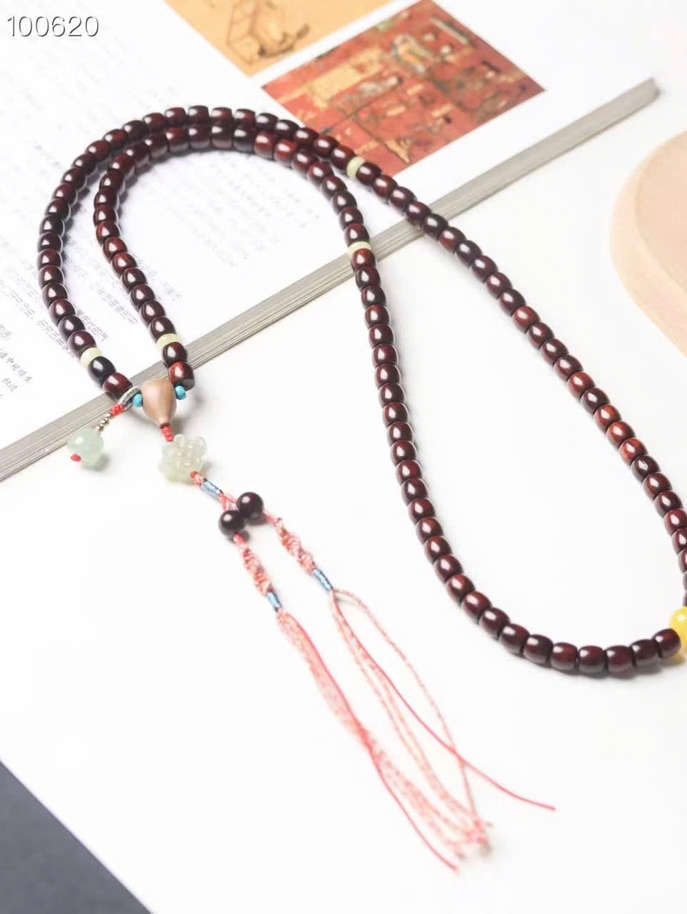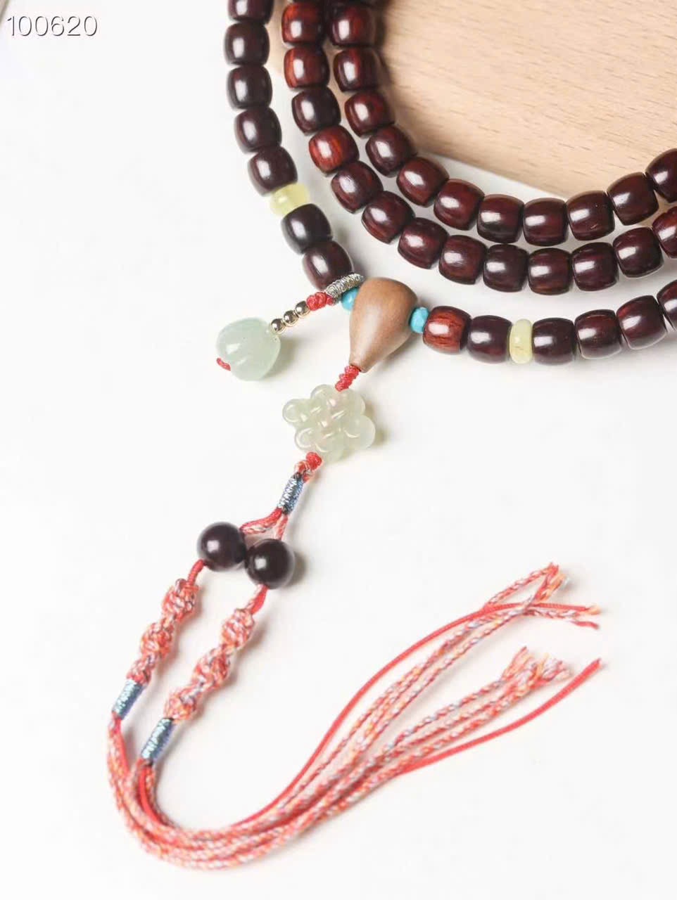 • Size: hạt cắt thẳng 7×8 + ngọc Hòa Điền + tam thông liền khối gỗ đàn hương + mã não vàng