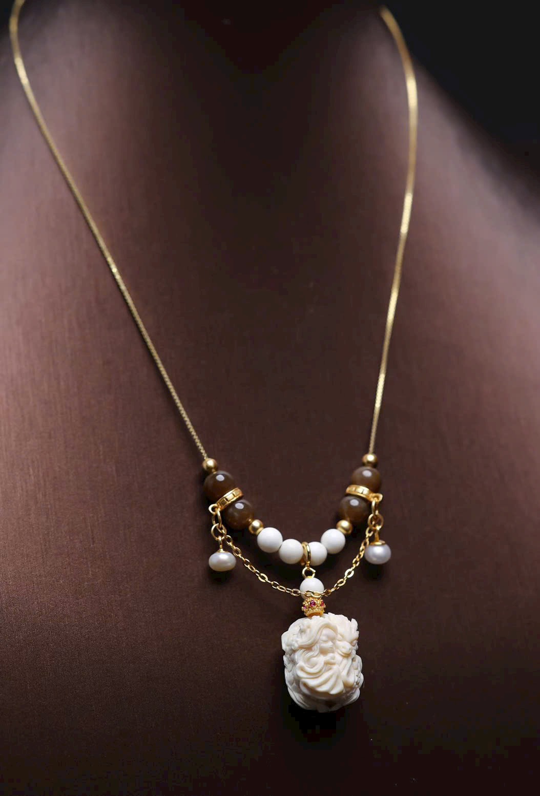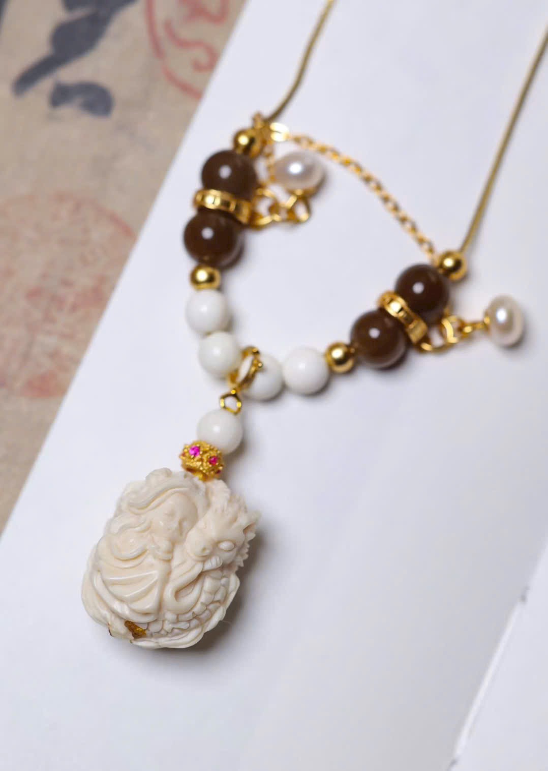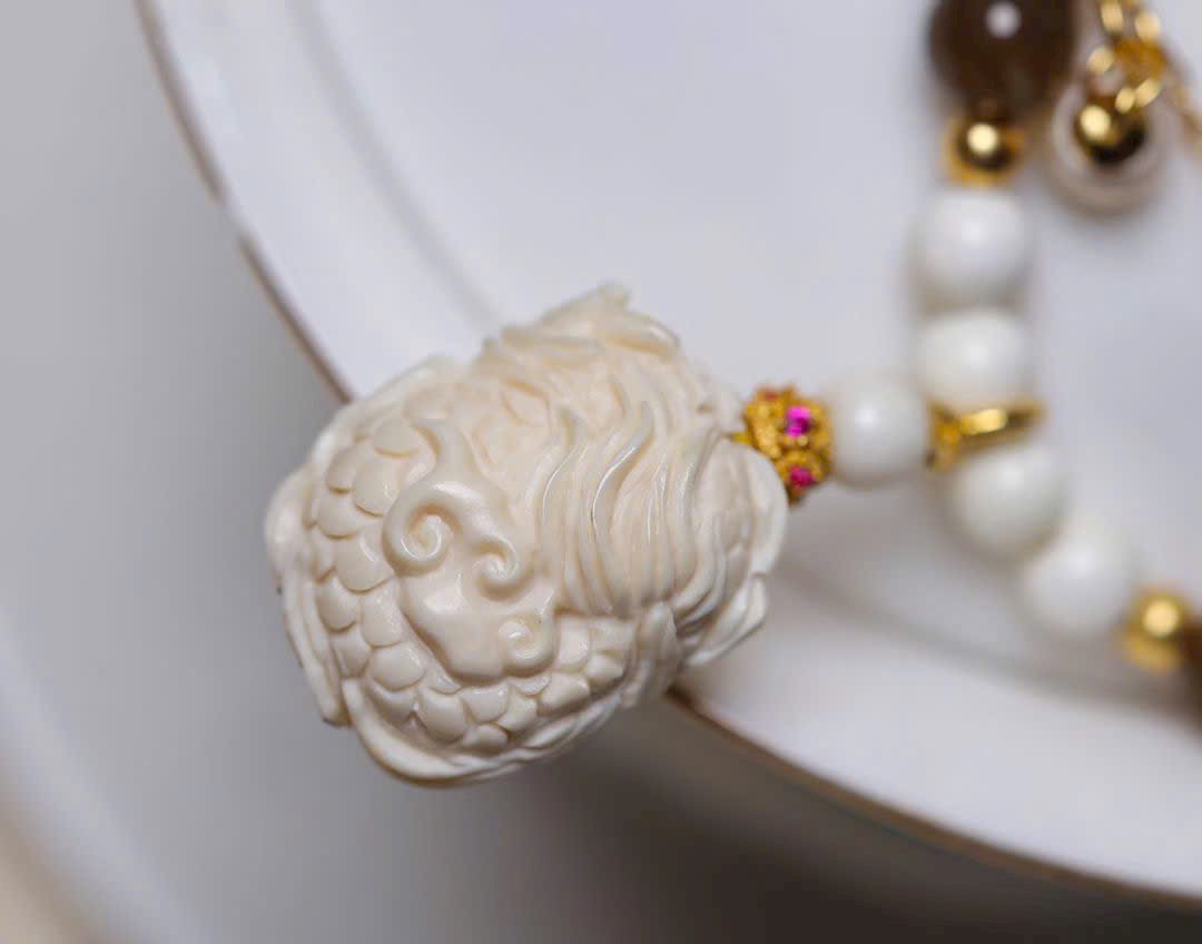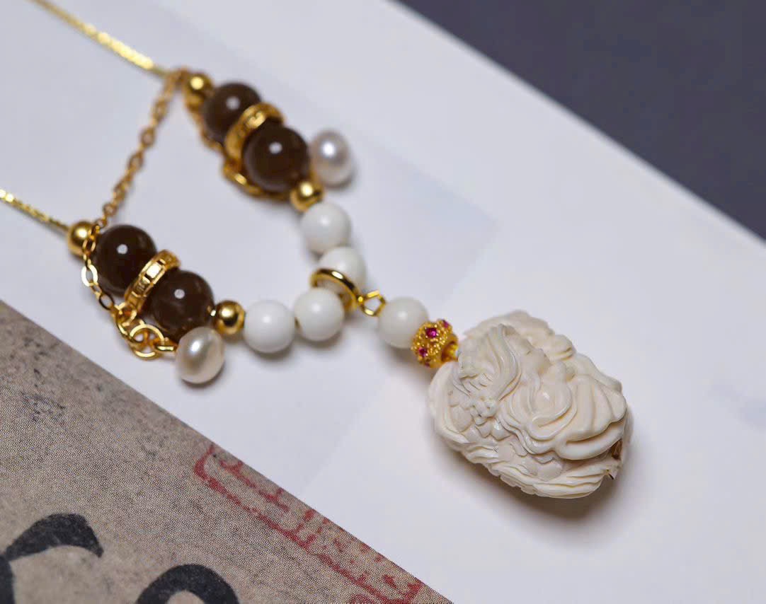 Long Nữ m.a mút được chạm khắc thủ công tinh xảo, phối hạt ma mút 04, dây bạc 925, ngọc trai và ngọc đường. Tổng thể mang hơi thở mùa hè, trong trẻo – thoát tục, tôn lên vẻ đẹp thanh mảnh, tinh tế và đầy khí chất.