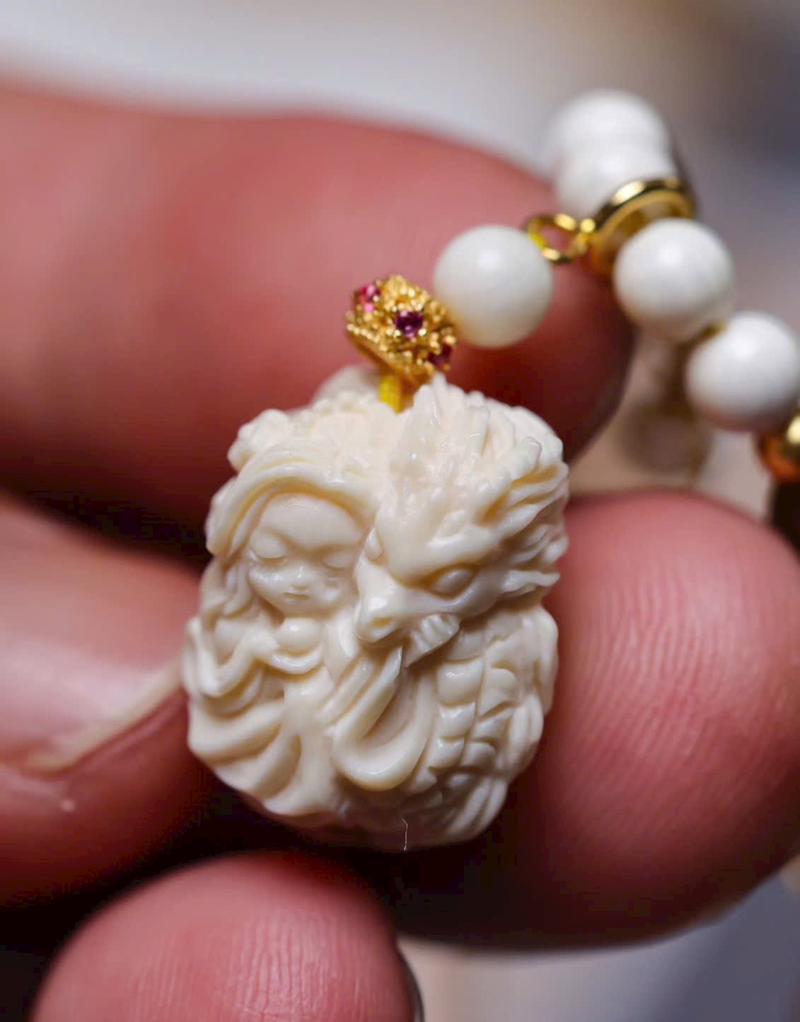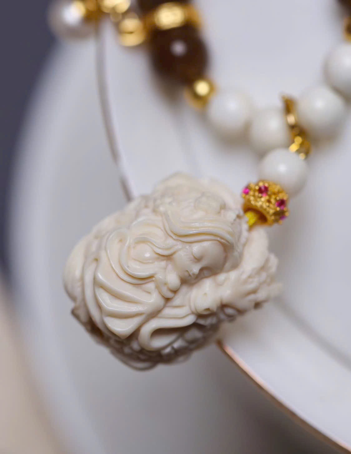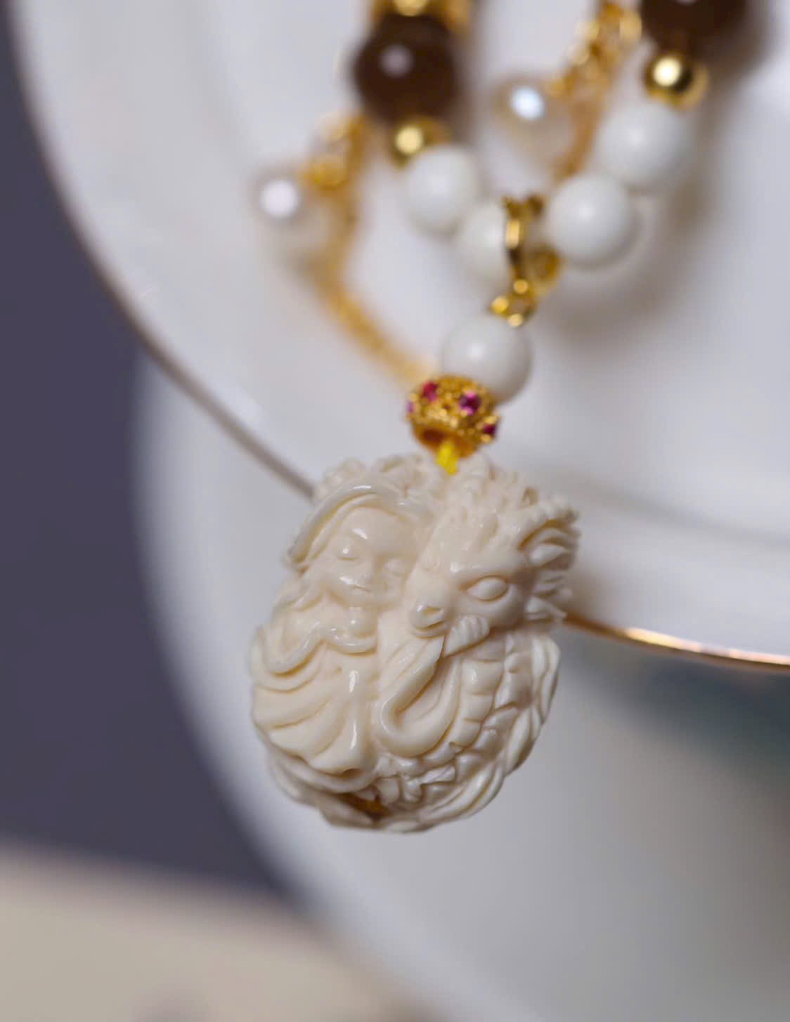 Long Nữ m.a mút được chạm khắc thủ công tinh xảo, phối hạt ma mút 04, dây bạc 925, ngọc trai và ngọc đường. Tổng thể mang hơi thở mùa hè, trong trẻo – thoát tục, tôn lên vẻ đẹp thanh mảnh, tinh tế và đầy khí chất.