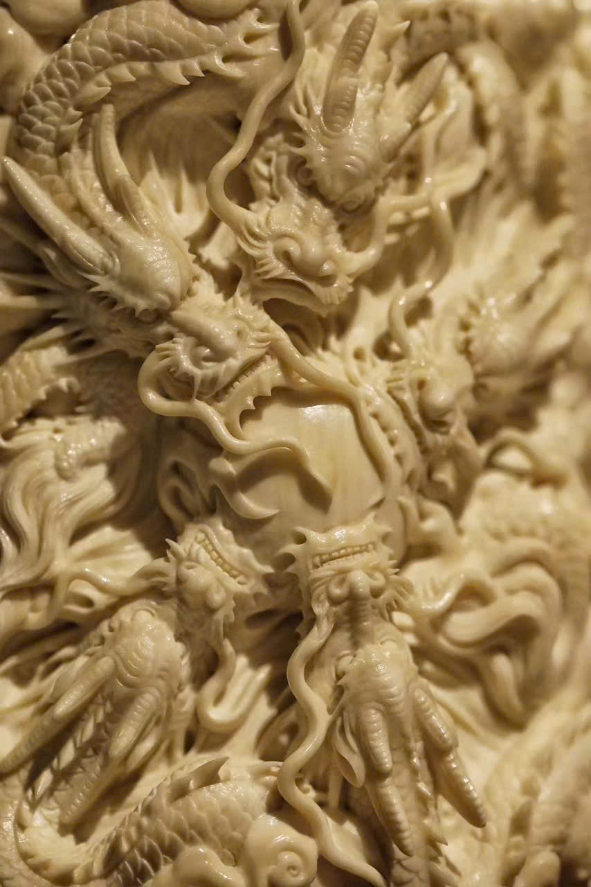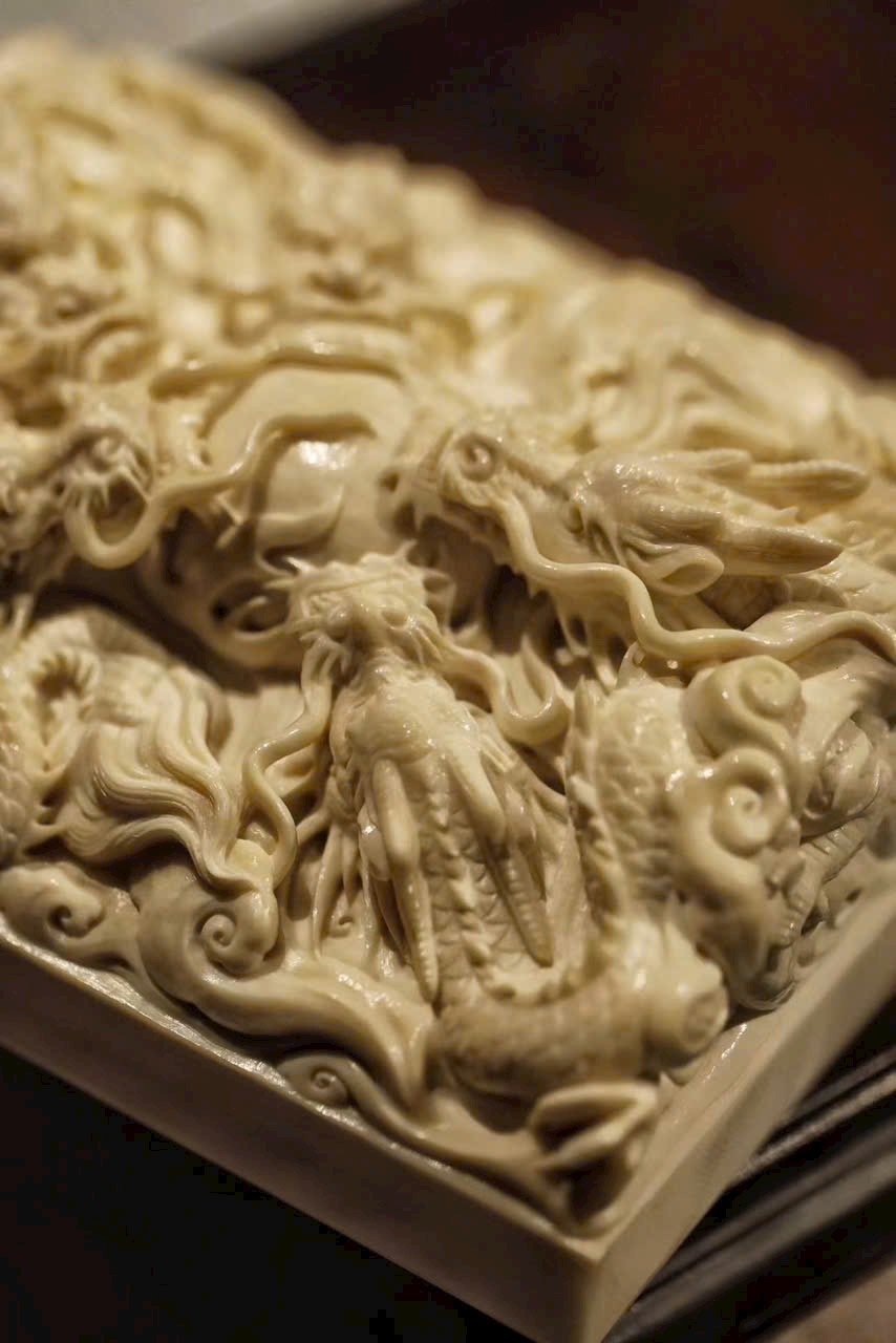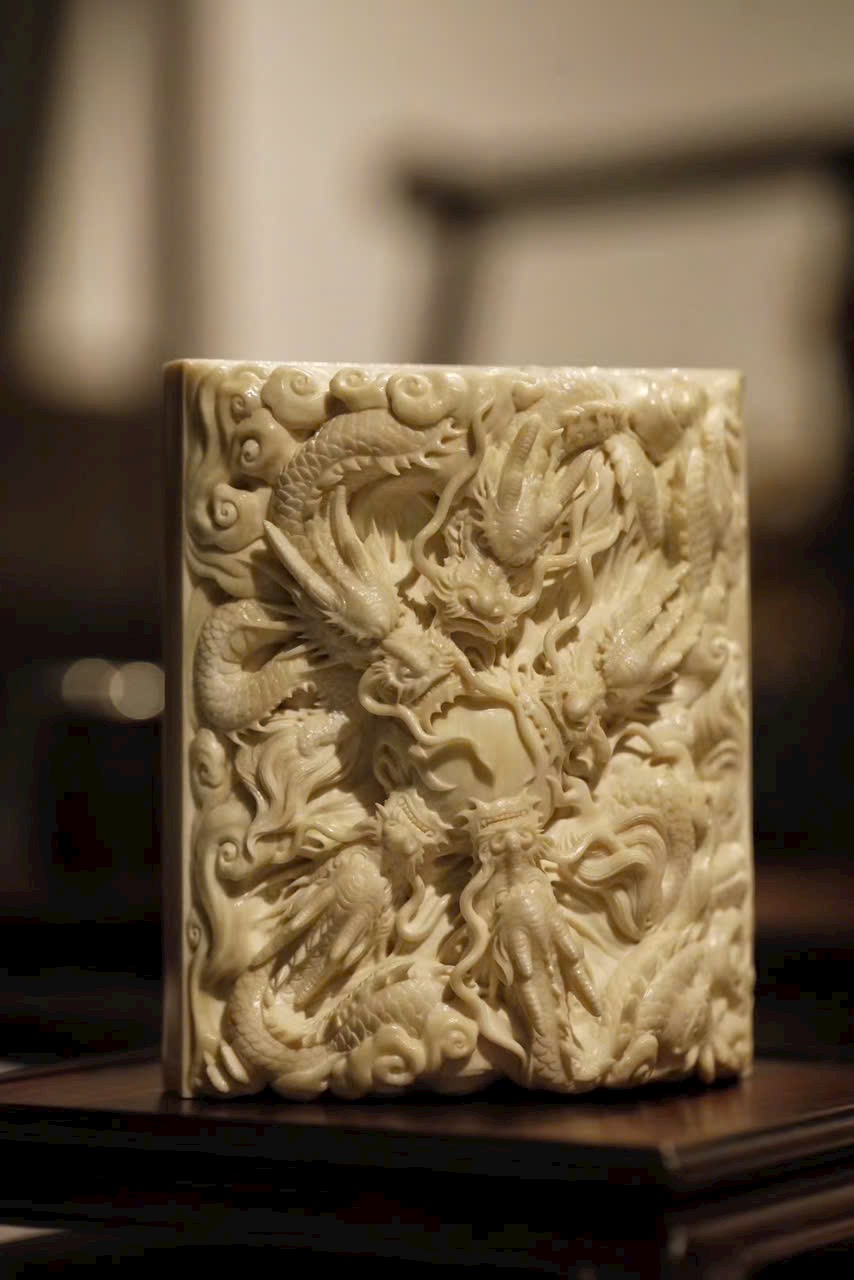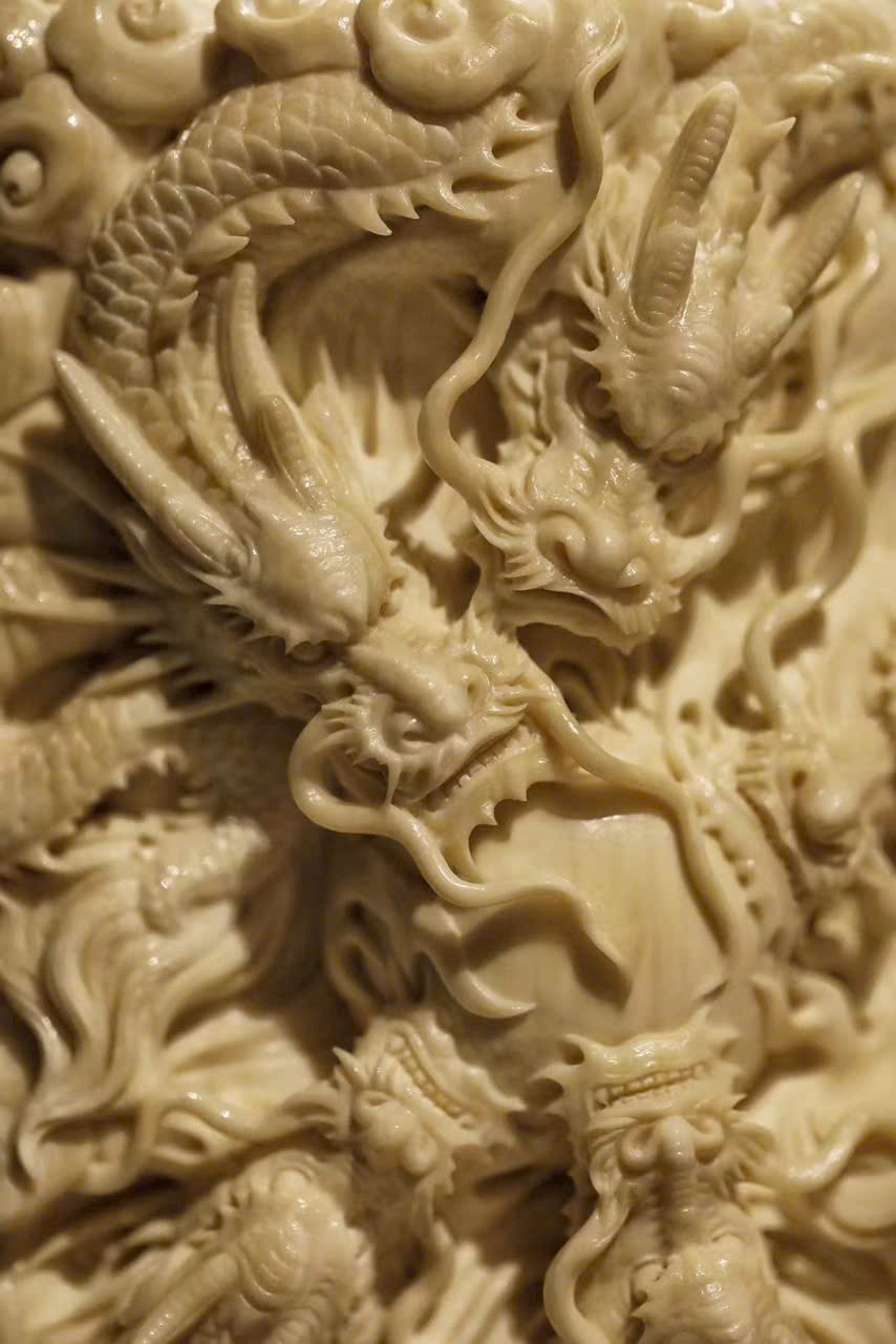 Tác phẩm khắc họa cảnh Cửu Long tranh châu với kỹ nghệ tinh xảo. Thân rồng uyển chuyển mạnh mẽ, từng vảy rồng, từng sợi râu đều hiện rõ từng ly, uốn lượn giữa tầng mây, quấn quanh ngọc châu, khí thế oai nghiêm hùng tráng. Chất ngà mịn màng gợi lên ý nghĩa cát tường truyền thống, hòa quyện vẻ đẹp của nghệ thuật thủ công với điềm lành phương Đông, là một trọng khí sưu tầm kết hợp hài hòa giữa chiều sâu văn hóa và giá trị nghệ thuật.