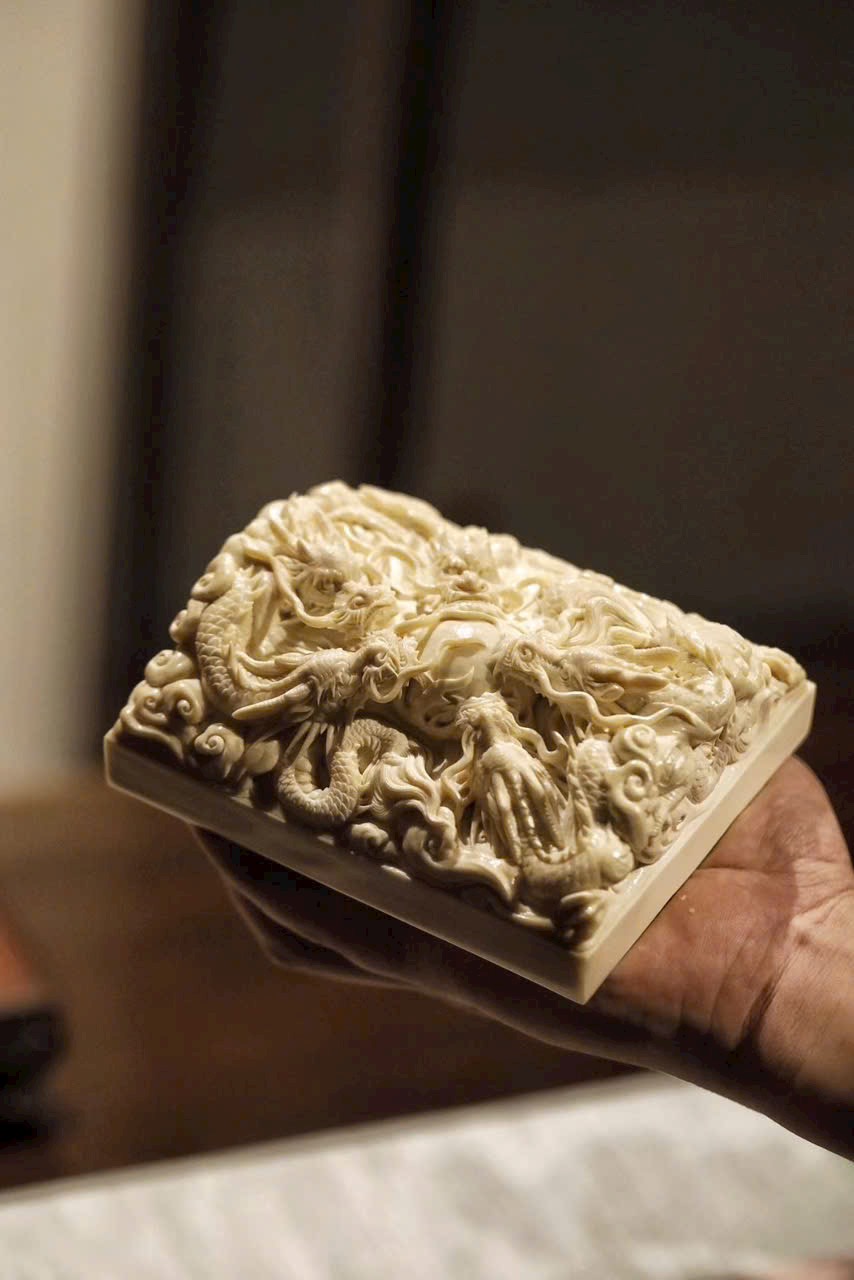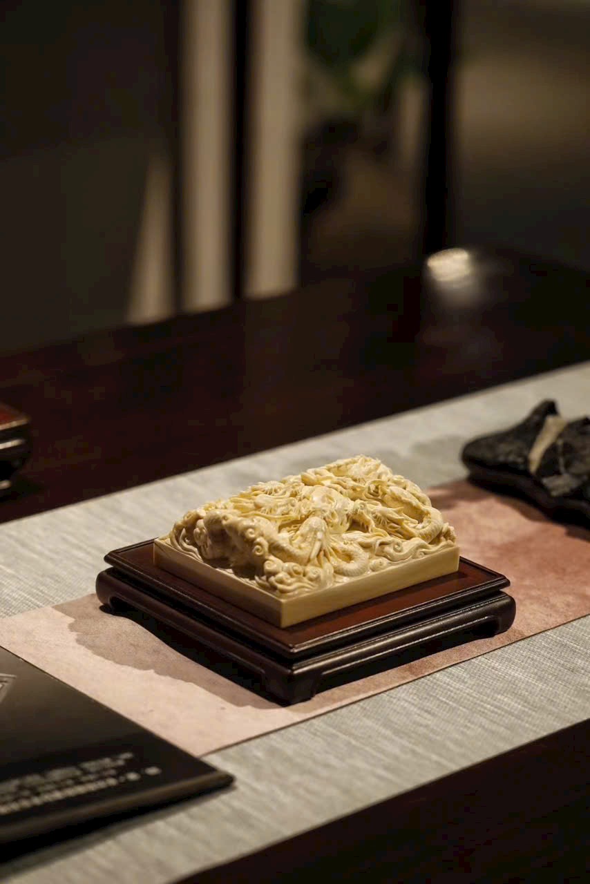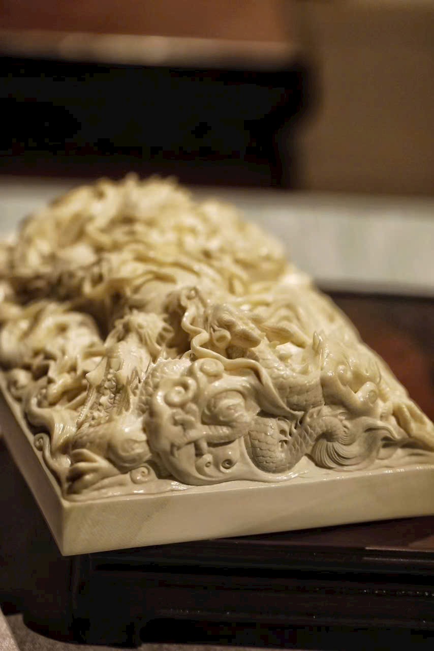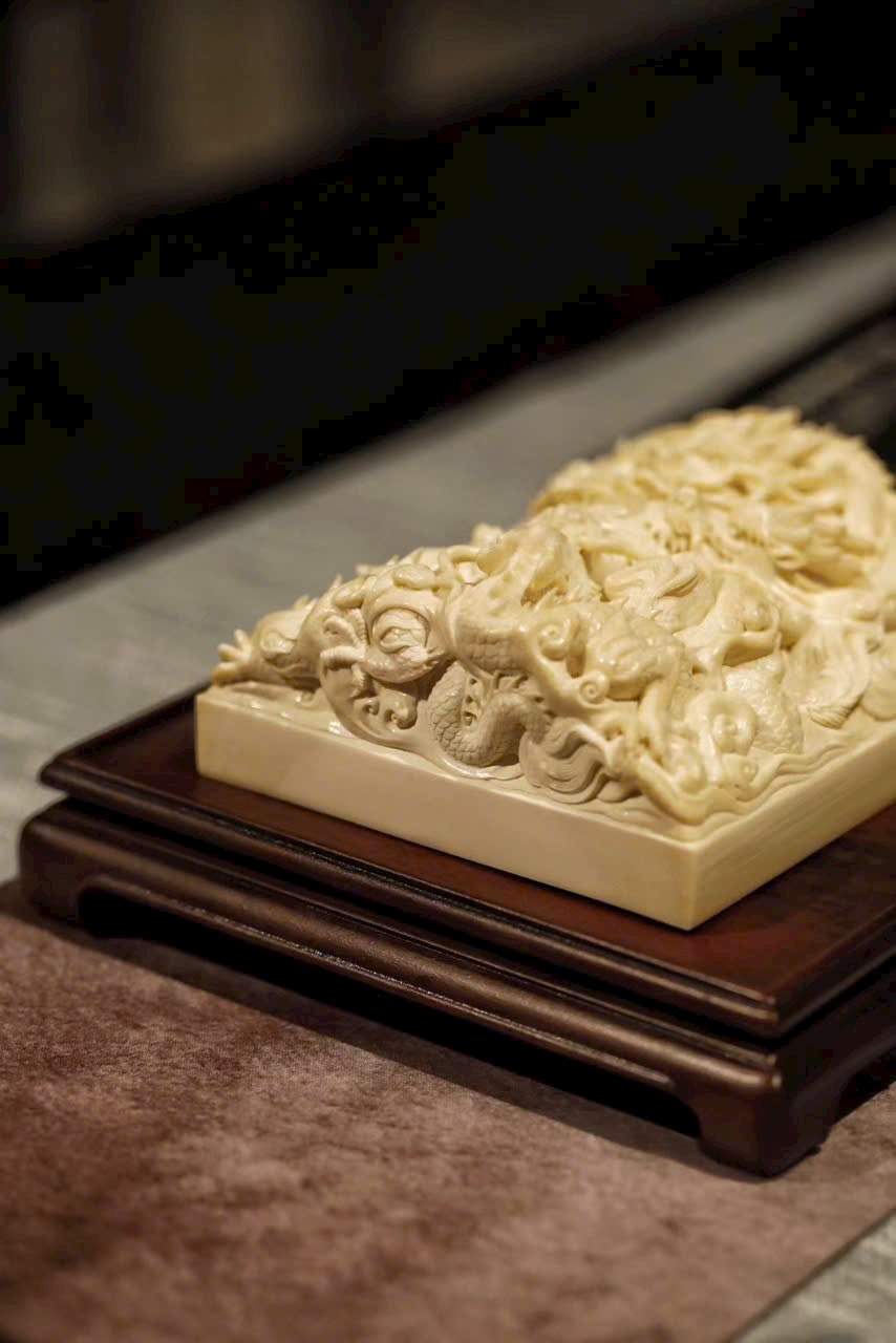 Tác phẩm khắc họa cảnh Cửu Long tranh châu với kỹ nghệ tinh xảo. Thân rồng uyển chuyển mạnh mẽ, từng vảy rồng, từng sợi râu đều hiện rõ từng ly, uốn lượn giữa tầng mây, quấn quanh ngọc châu, khí thế oai nghiêm hùng tráng. Chất ngà mịn màng gợi lên ý nghĩa cát tường truyền thống, hòa quyện vẻ đẹp của nghệ thuật thủ công với điềm lành phương Đông, là một trọng khí sưu tầm kết hợp hài hòa giữa chiều sâu văn hóa và giá trị nghệ thuật.